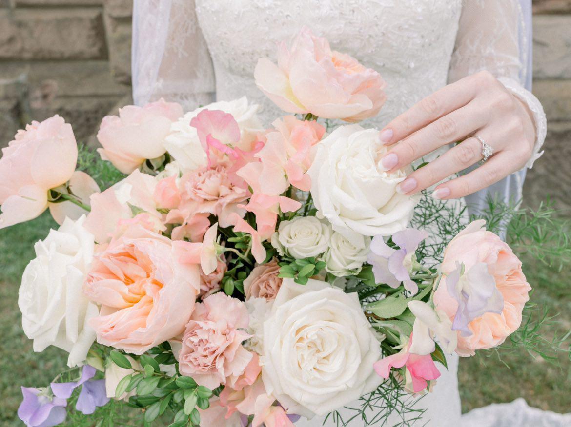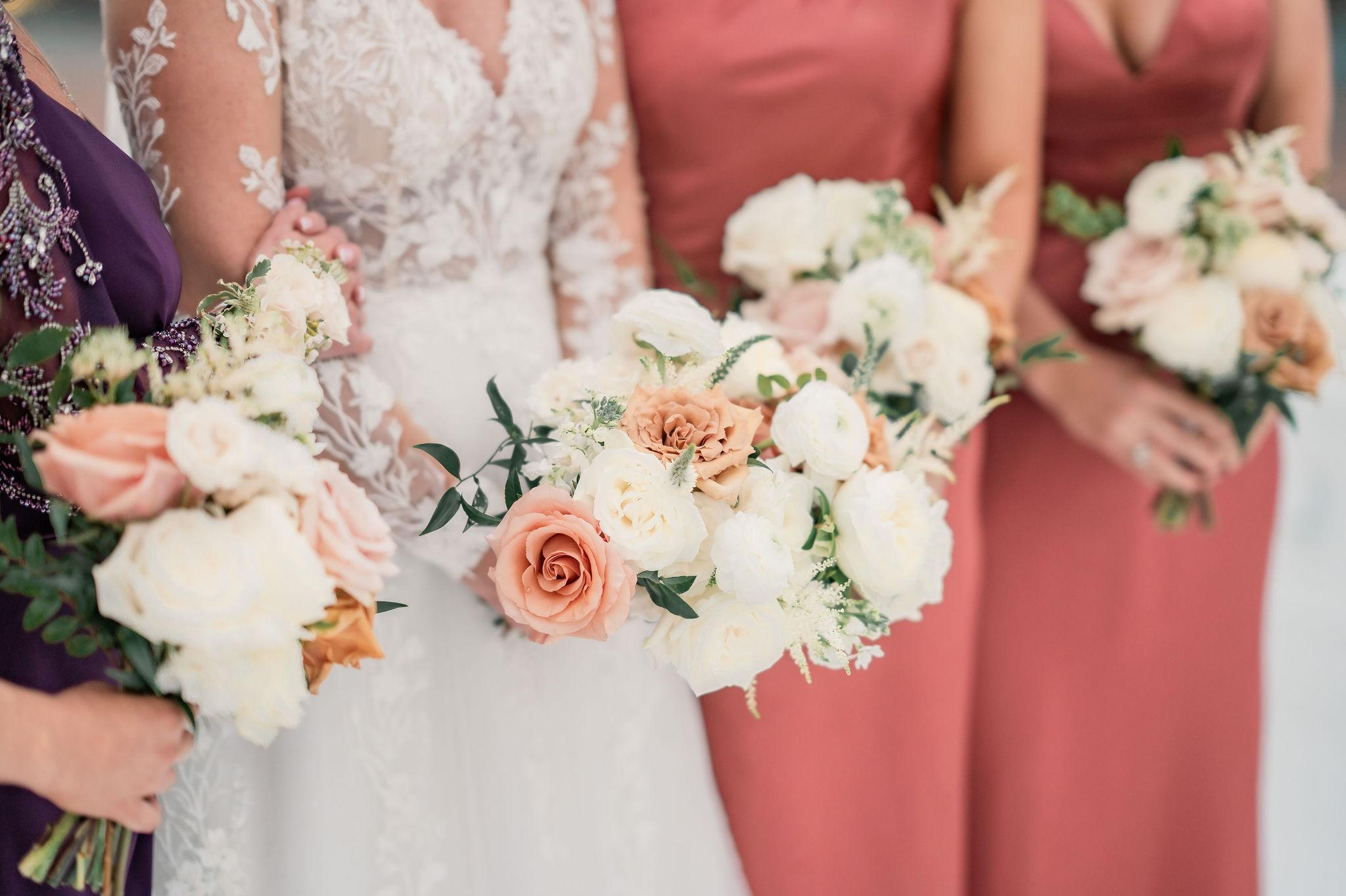 On our wedding day, Lorrie arrived promptly and worked seamlessly with our wedding assistant. Her setup was flawless, and every arrangement was perfectly positioned. The personal flowers - including my bridal bouquet with white garden roses and dahlias, the matron of honor bouquet, boutonnieres, and corsages - were absolutely perfect and photo-ready for our morning family session.