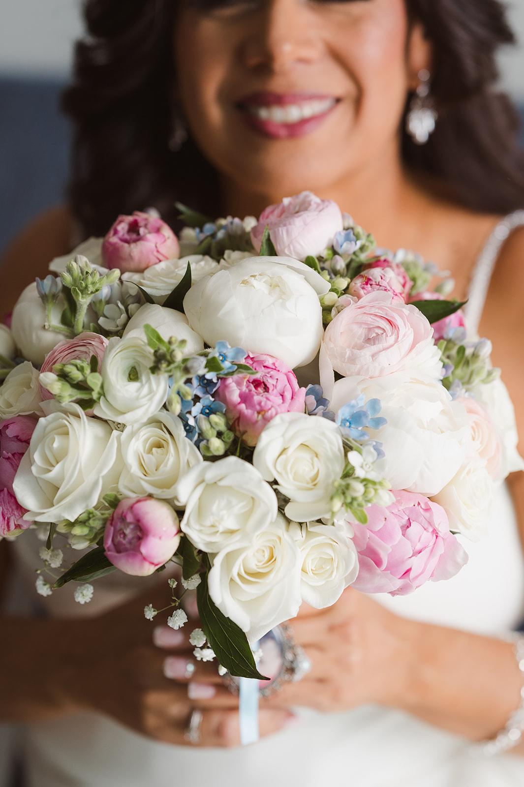 Blossom and Bee were one of the approved vendors on our venue's list. It was an easy process working with Penny and her team. I was able to pin inspo pictures on a Pinterest board as well as share pictures of my dress, my husband's tux, and our wedding invitation suite. As a bride of Indian origin, I wanted bright spring florals that also complimented the industrial/French look of our venue. I was overwhelmed by the number of color combinations I was interested in and the team helped me narrow down to the best color scheme. Something to note is that you will need to provide bud vases and rent floral stands from B&B if that is something you want in your decor. Luckily my venue provided a moon gate that could be used for the ceremony, and the venue staff repurposed the florals from the ceremony to the sweetheart table.
