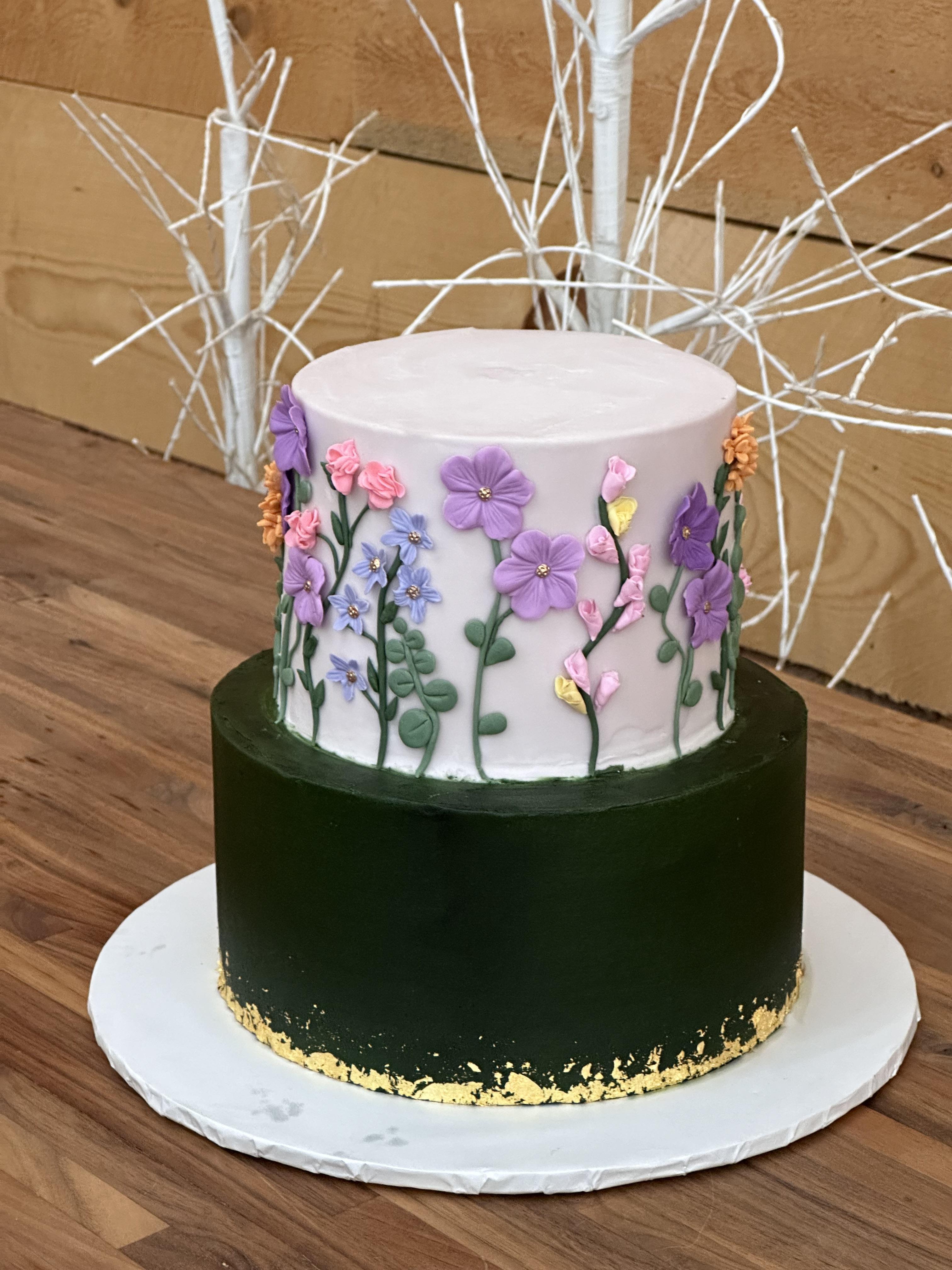 Serves up to 50 guests • Two-tier cake (6” & 8”) with light buttercream design and optional fresh flowers (ask about designs included in this package) • Up to two cake flavors • Two dozen cupcakes (two flavors, mix of luxe and rosettes in your colors) 💰 $533 (Includes Greeley delivery) 💵 Tax not included ⭐ Custom decorations available for an extra fee. 🎂 Need a bigger cake or more cupcakes? Ask about custom packages! 🚗 Additional delivery charges apply outside Greeley.