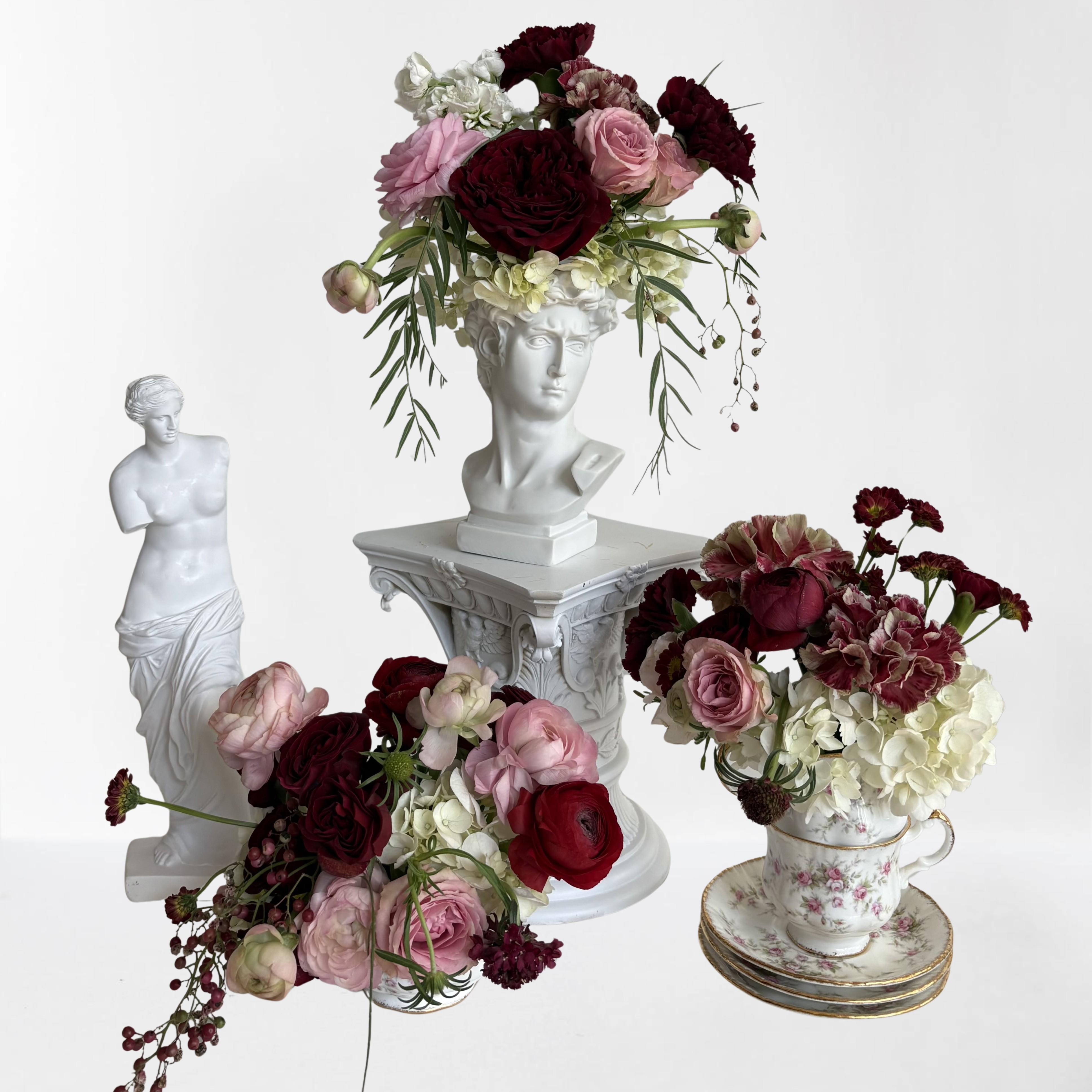 Dixie Does Vintage creates romantic, modern-vintage tablescapes with distinctive accent pieces that feel personal, memorable, and beautifully styled. Our Dixie Does Garden Parties is designed for couples & hosts wanting something whimsical, romantic, and visually layered. This new collection features sculptural elements—think Greco-Roman busts, decorative antique compotes, statues, and raised risers—paired with vintage china, teapots, and more. Perfect for weddings, rehearsals, bridal brunches and showers. From intimate tea-style gatherings to full-scale reception layouts, we style with detail and intention so every seat feels special.