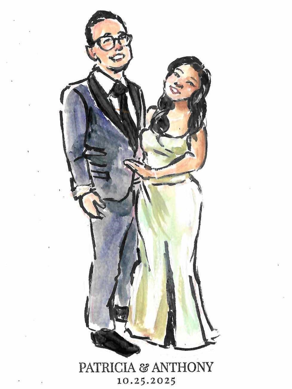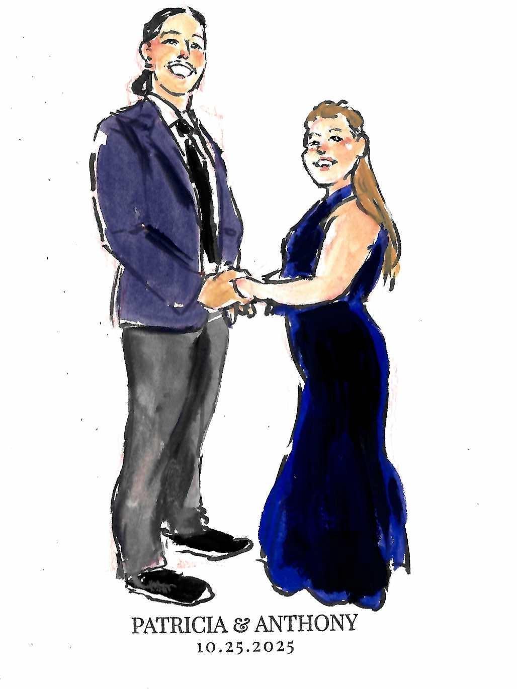 I love capturing people with a balance of real likeness and a painterly touch, so every piece feels both personal and artistic. My background in serving client families in the past taught me how important it is to preserve special moments, especially in commission work, and now I get to bring that same care and energy into weddings. Whether I’m painting a big moment on canvas or sketching quick guest illustrations, my goal is to make the experience fun, thoughtful, and memorable for you on your special day.