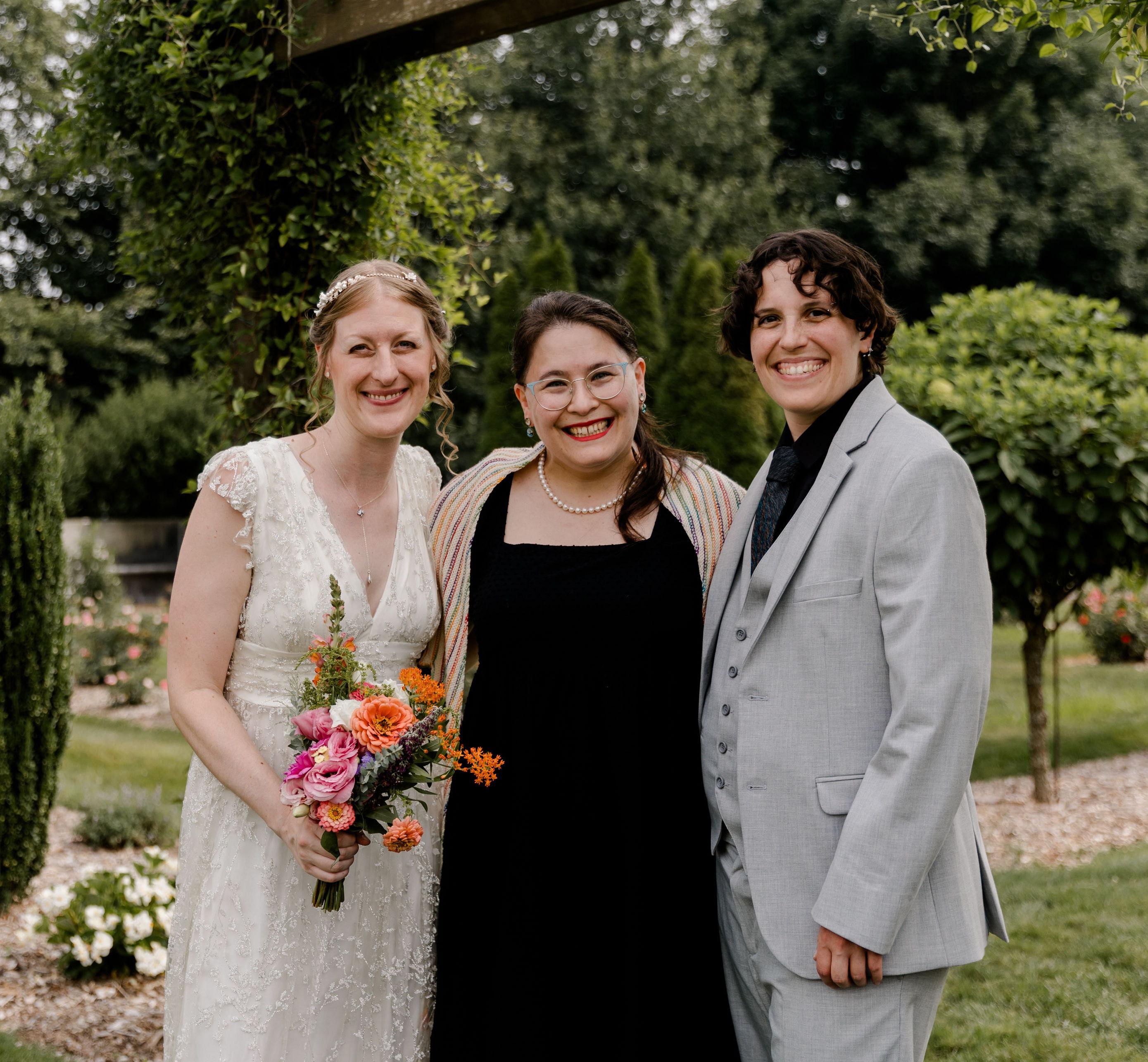Miriam wrote us a beautiful personalized ceremony for our micro wedding. Her professionalism, warmth, and attention to detail in writing about our relationship made the ceremony feel so intimate and intentional for us and our 5 guests. She was so communicative and flexible throughout the process of preparing for the wedding as well. Additionally, since we streamed the wedding online for family who were unable to attend, we were able to hire her lovely wife Joan to set up my laptop and camera and run the stream for us. Because of Joan's help, we and our guests could focus on the ceremony without worrying about our other family missing out on anything. We are so grateful to them both!
