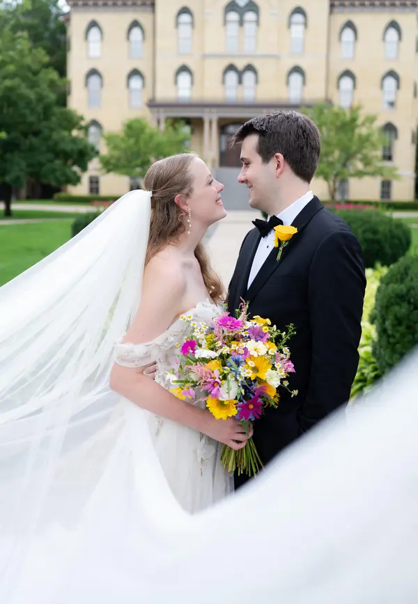 Booking Sarah for our wedding was hands down the best decision we made. From our initial Zoom meeting, we knew it was going to be a great fit – she even added in cat toys in our welcome packet! My husband and I work crazy schedules and Sarah was so patient and willing to work with us and even make the trip down to Indianapolis for our engagement session. My husband was hesitant about the whole photo process, but he loved Sarah from our first meeting and she and Grace put us at ease and made the engagement session so fun! Sarah is definitely the person you want for your wedding. She knows the ins and outs of a Notre Dame wedding and was able to design the best timeline to fit in all of the pictures we knew we wanted for the day. More importantly, Sarah was a seamstress in another life and was able to sew me back into my dress and essentially sew a new bustle after an unfortunate football mishap. The only people you see more on your wedding day than your partner are your photographers, so this is one of the most important decisions you have to make. You will not regret hiring Sarah as your wedding photographer, she is that person you want by your side! We are lucky to come out of this with not only the most beautiful pictures, but beautiful friends as well. Our engagement and wedding photos captured our love story perfectly and we are so excited to have these to look at forever.