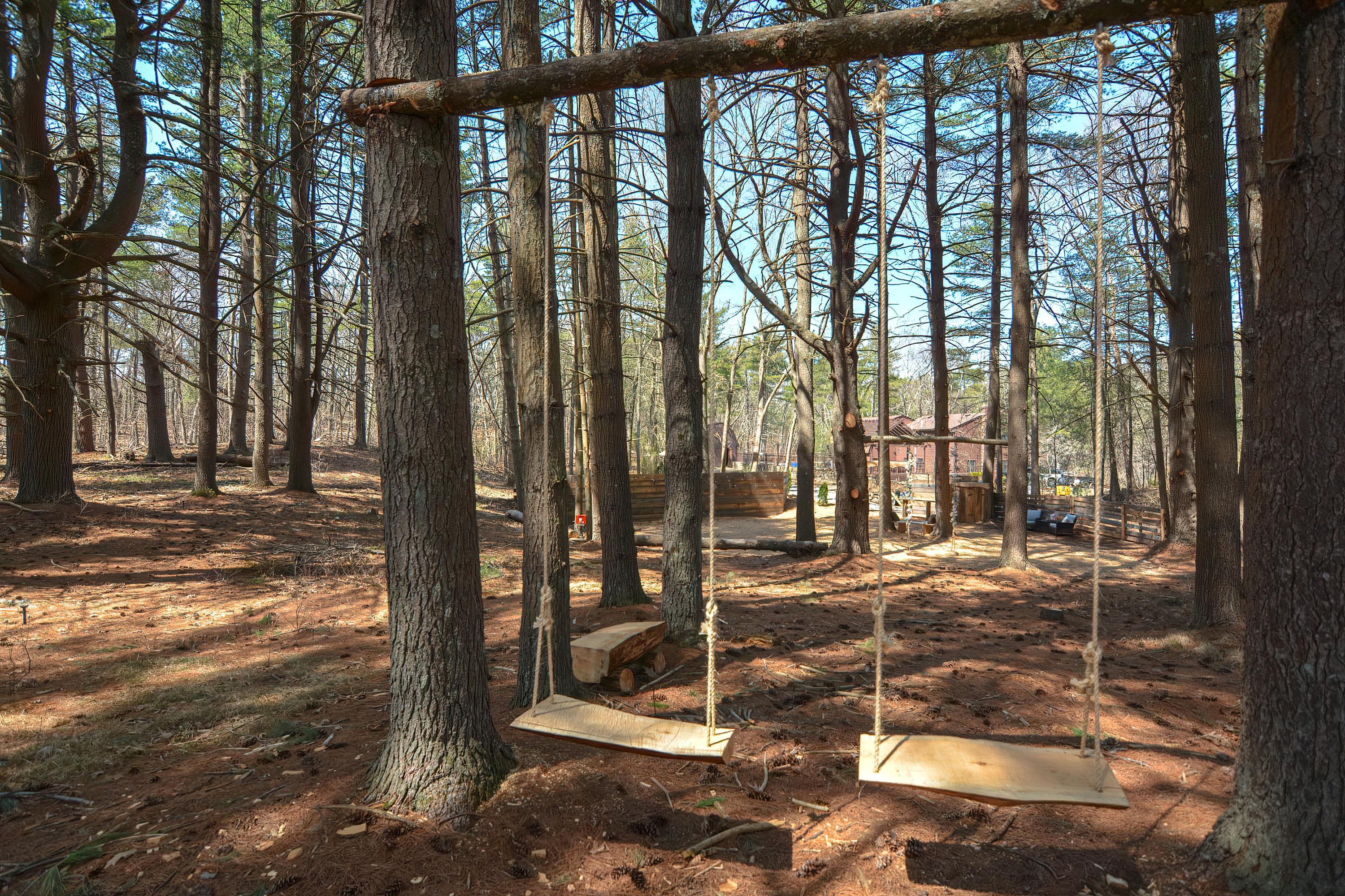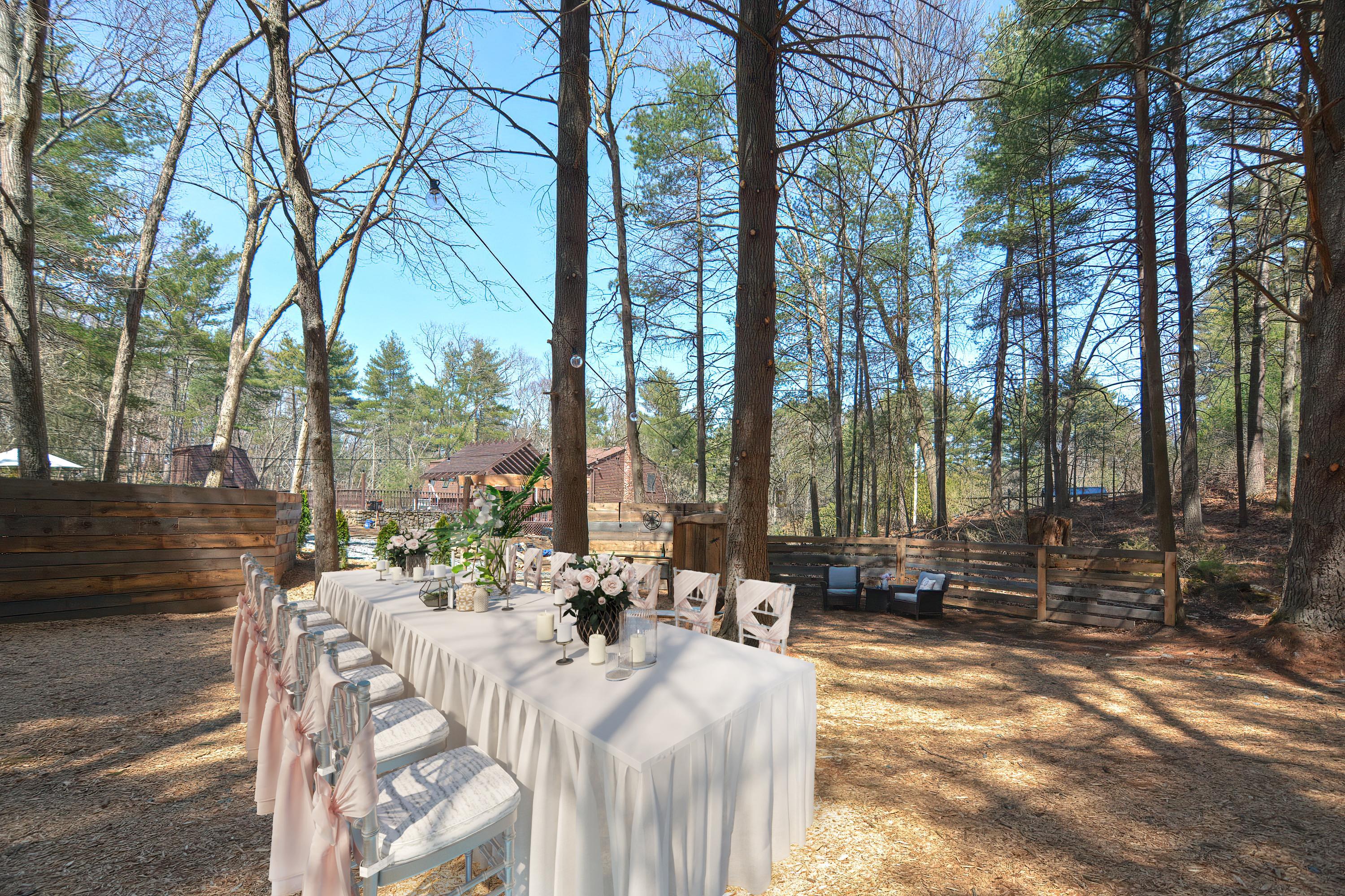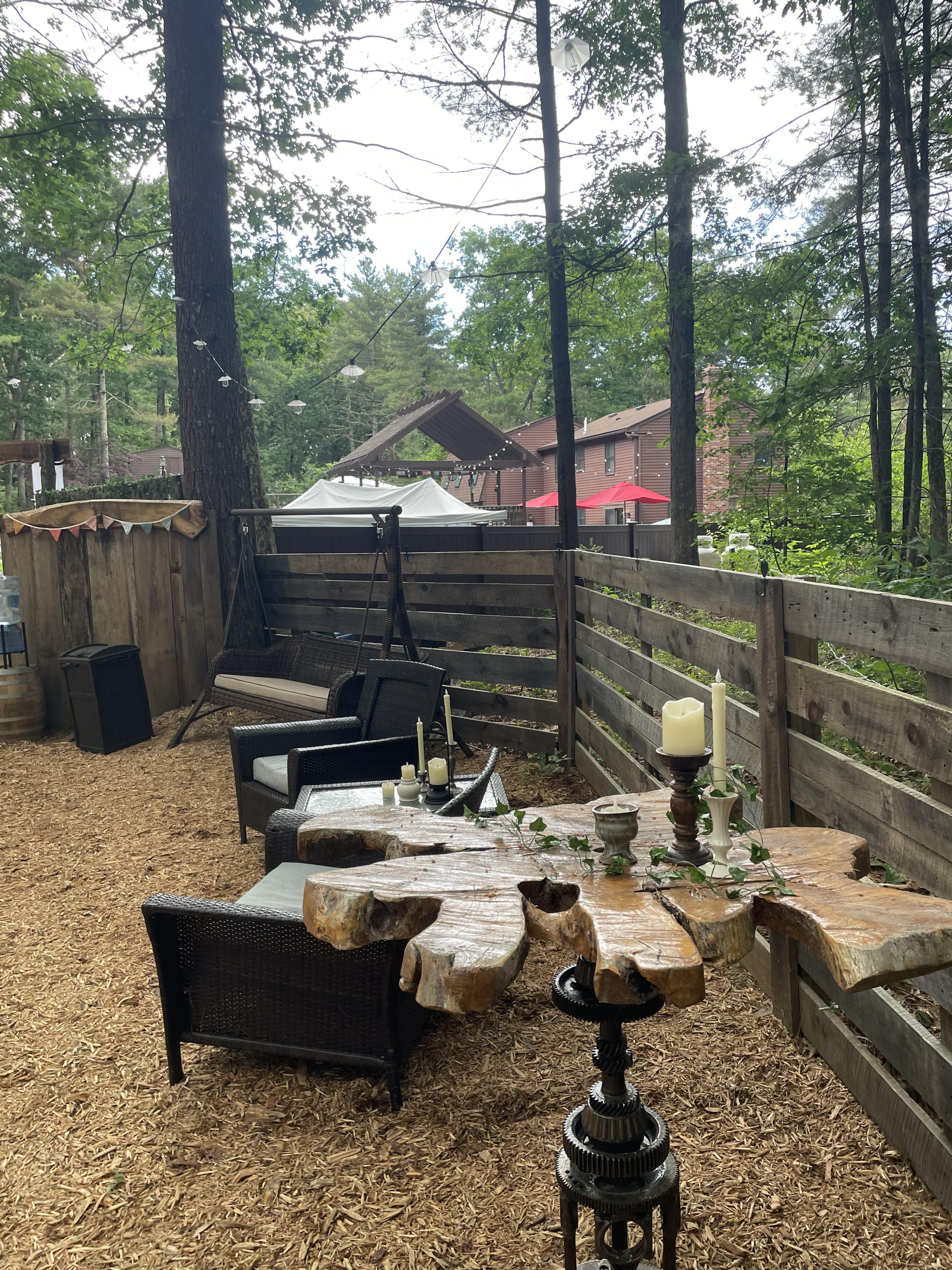 Over 2000 square feet nestled in the woods surrounded by wilderness Private unique space with bar area, swings, and full power to meet all your party needs. A wooded venue that allows you to create your special event.
