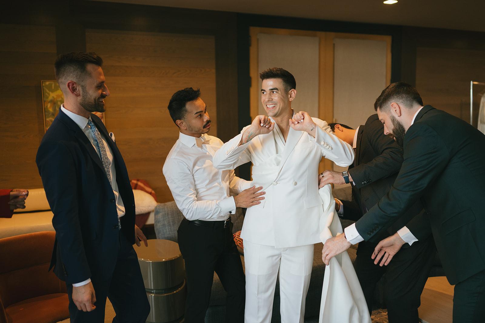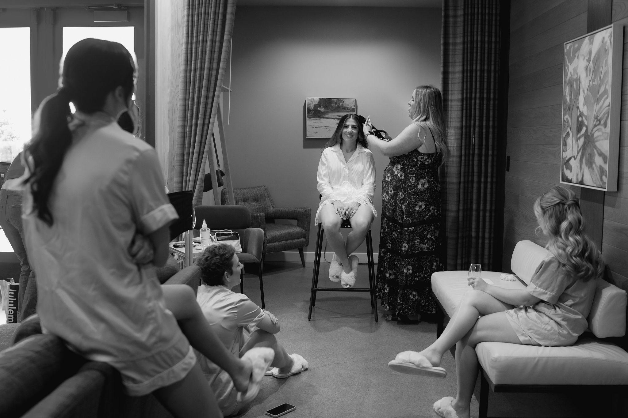 A stylish, sunlit retreat for your wedding party to relax and prepare. This modern lounge features floor-to-ceiling windows with lush forest views, plush seating, and warm wood accents—perfect for hair and makeup, pre-ceremony toasts, and beautiful getting-ready photos. Calm, comfortable, and effortlessly elegant.