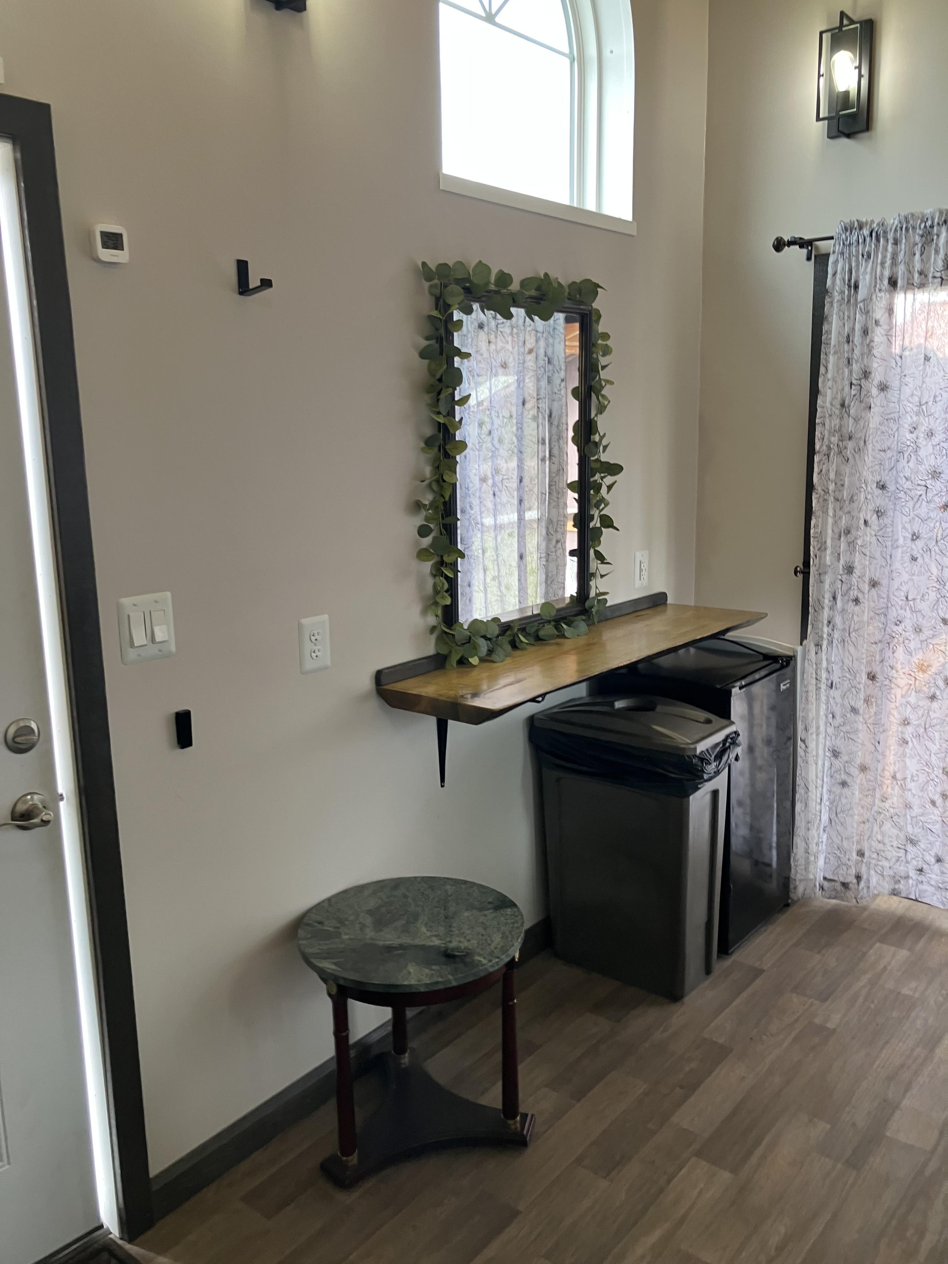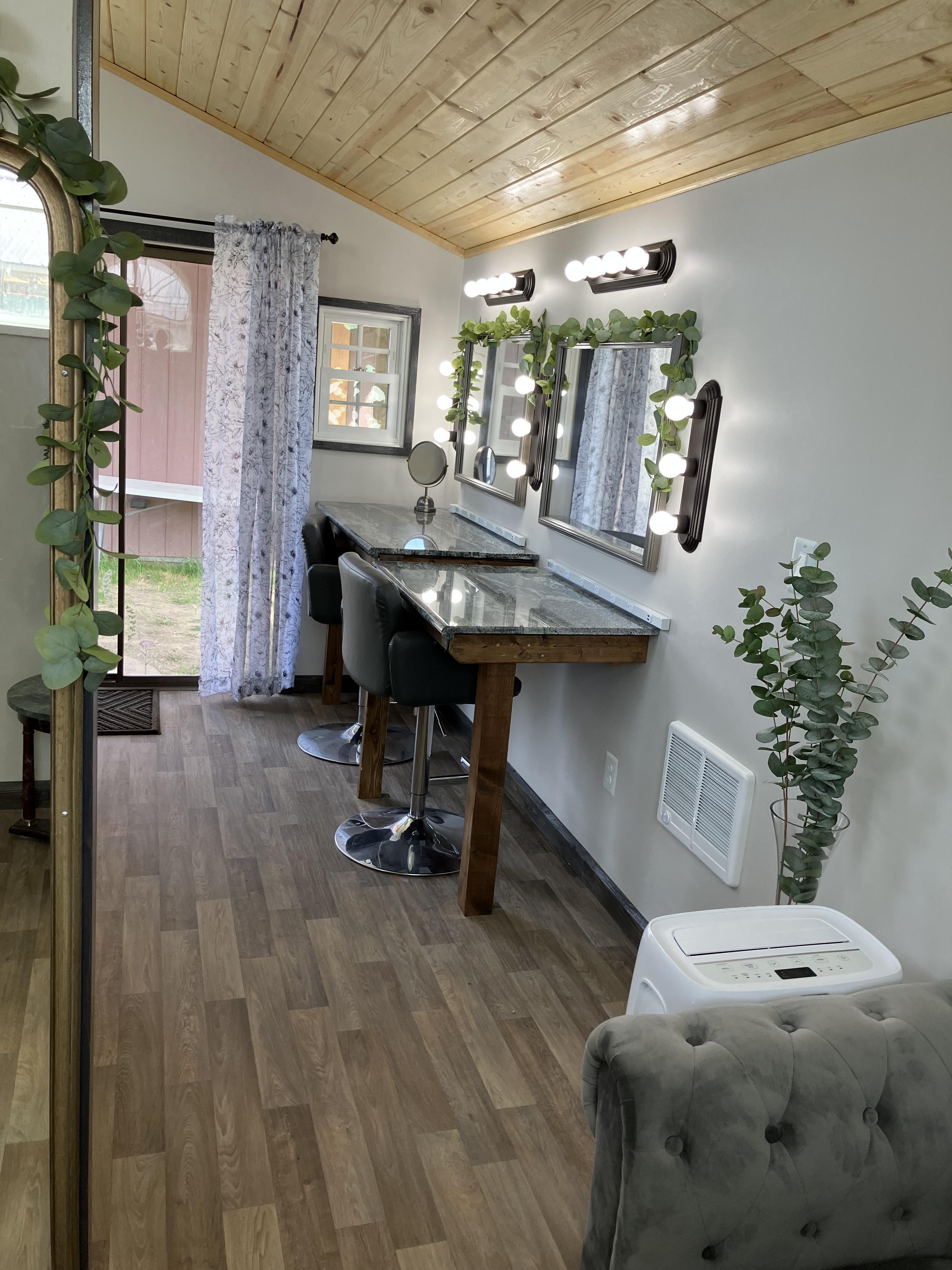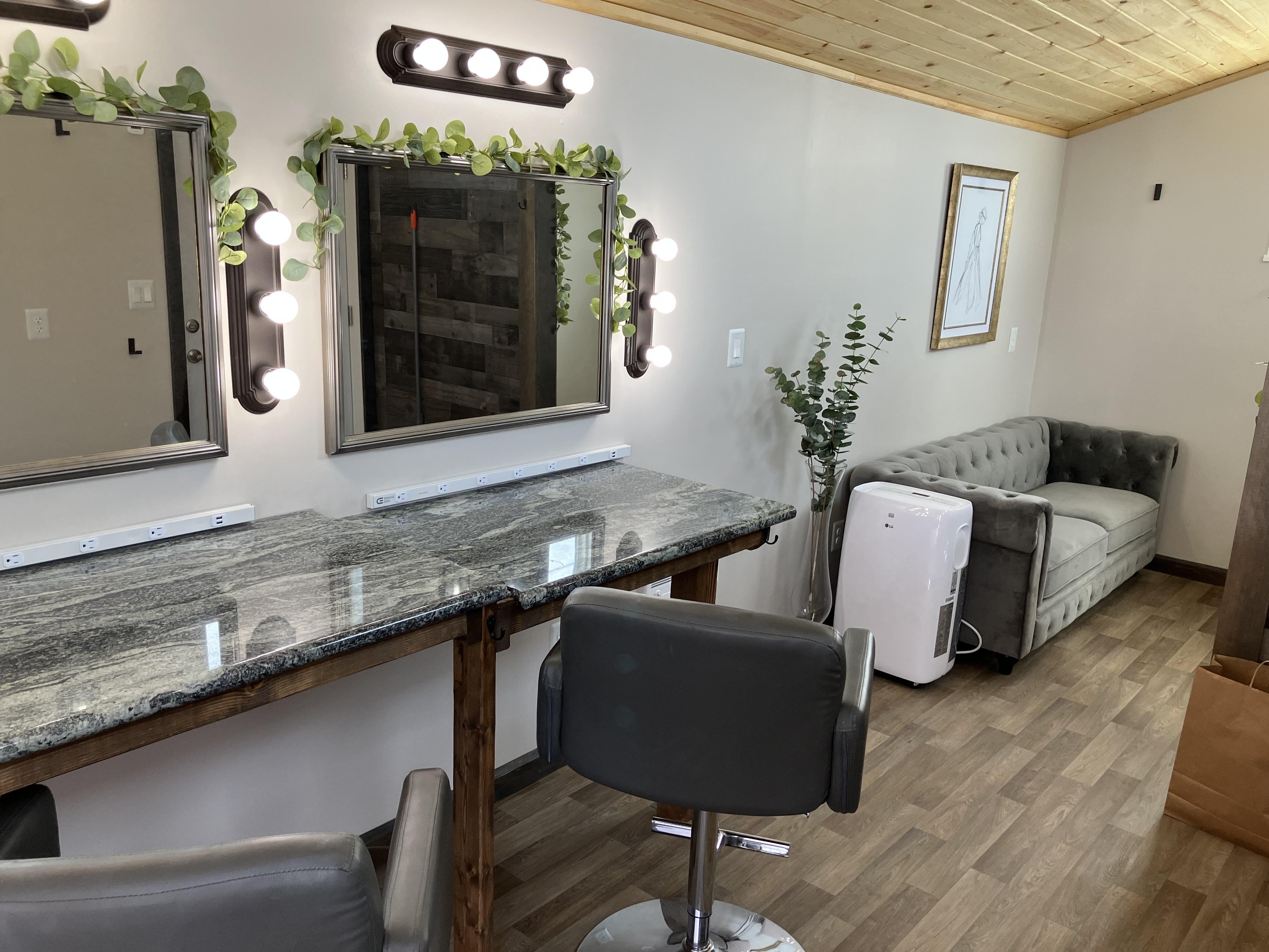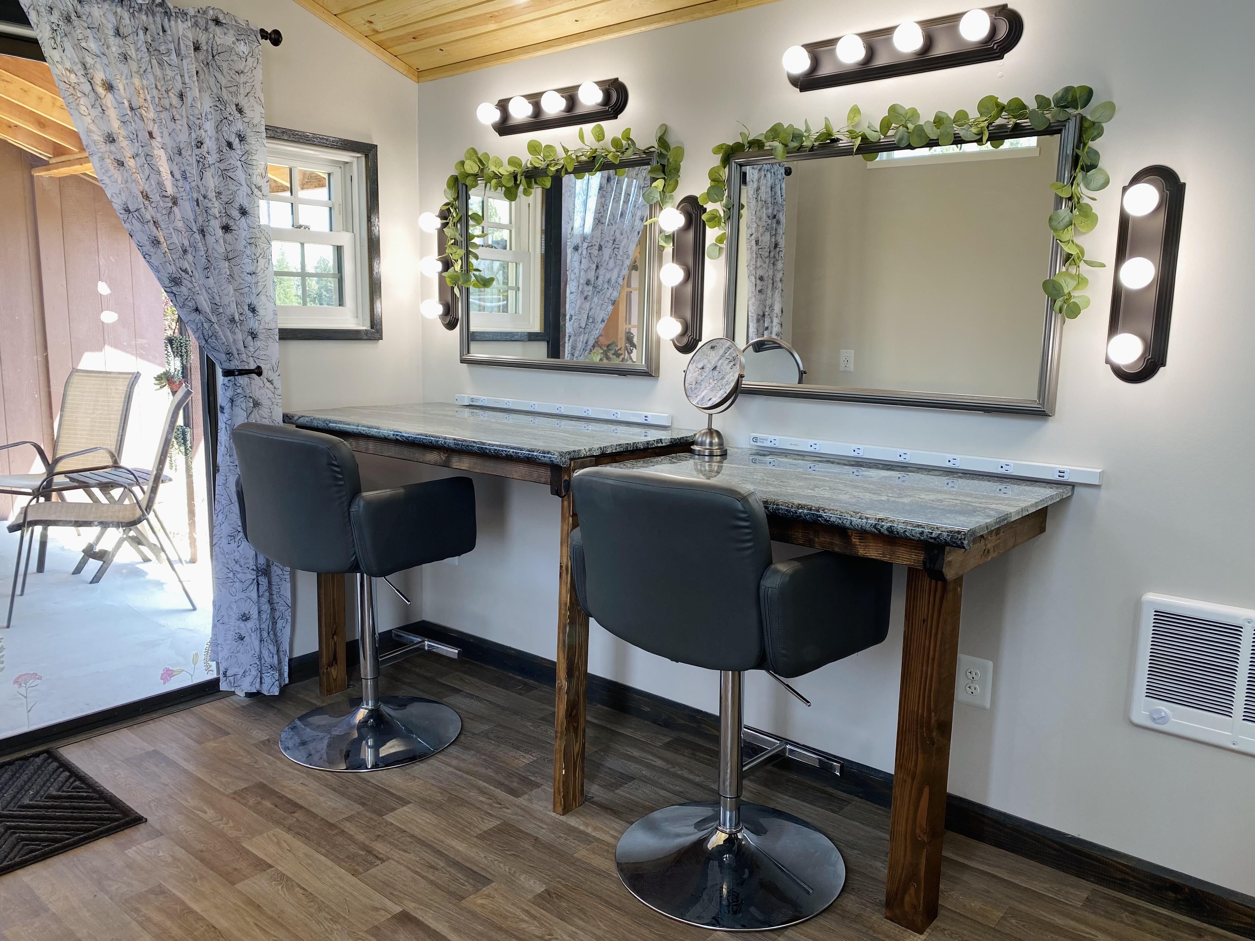 Great natural lighting for hair and makeup, a well equipped with outlets. Insulated and air conditioned/heated with a bonus covered patio.