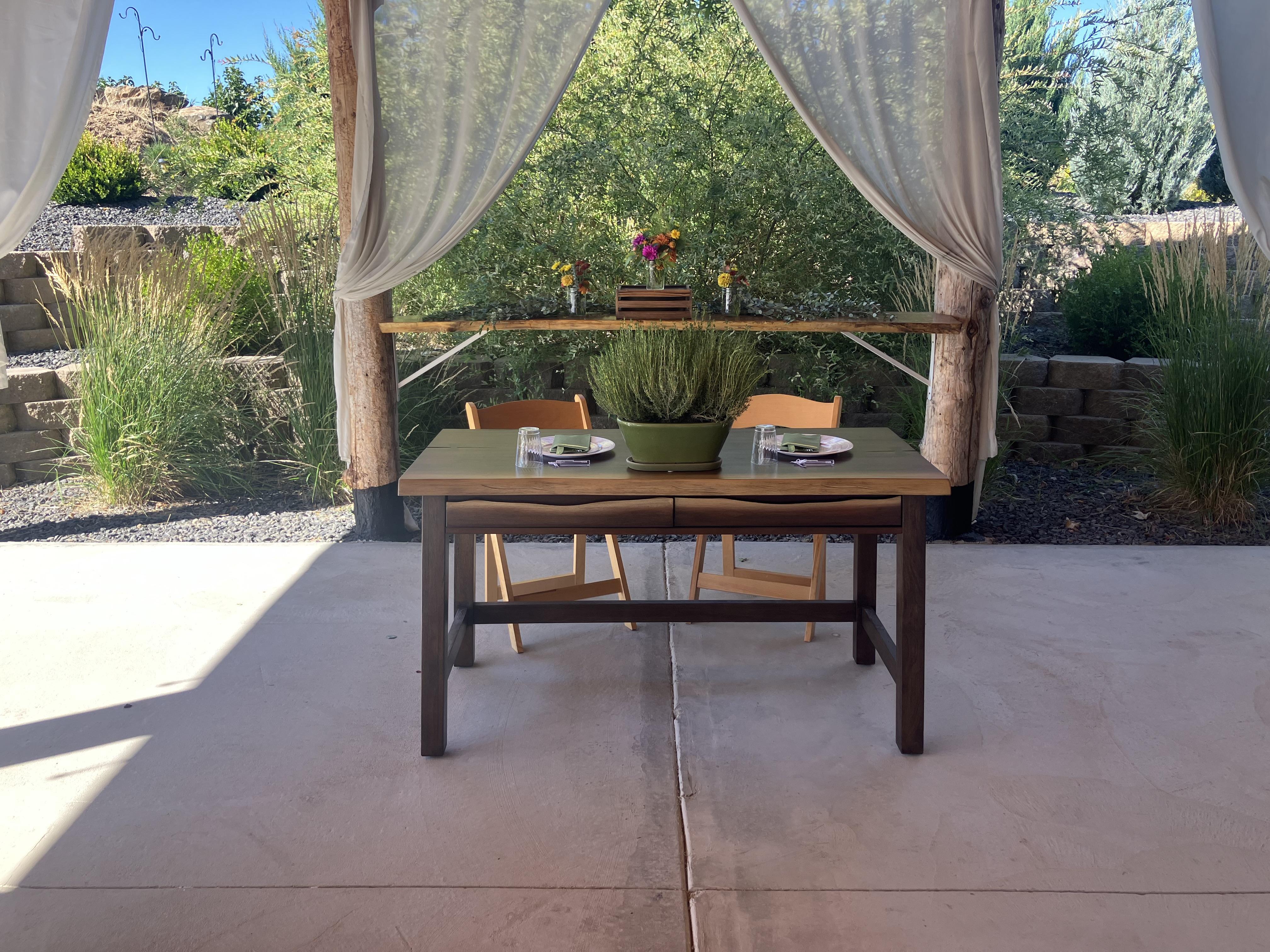 This log post and bean constructed pavilion is open to the outdoors on two sides. You get all of the colors, smells, fresh air and landscaping while staying in the shade.