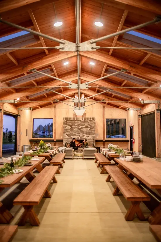 Features: • 1,800 sq. ft. fully enclosed space for year-round events. • Converts to open air with three sweeping garage-style doors. • Teak tables and benches offer spacious seating (up to 72). • Custom-built, wood-burning fireplace creates cozy ambiance. • Quartz counters and indoor sink for prep/cooking needs. • Ample, well-placed electrical outlets for power needs. • Two propane-powered outdoor heaters for cooler days and cozy evenings.
