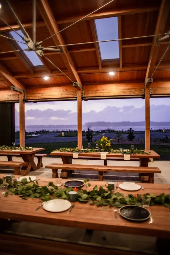 The Waterfront Pavilion is the heart of celebrations at Bay Point Landing, offering a seamless blend of indoor comfort and outdoor beauty. This versatile space features three sweeping garage-style doors that retract to transform the venue into an open-air sanctuary, allowing the coastal breeze and bay views to take center stage. Inside, a custom-built, wood-burning fireplace serves as a warm focal point for intimate gatherings, while quartz countertops provide a sleek area for floral displays or catering prep. Outfitted with oversized teak tables and benches, the space exudes a contemporary, communal charm perfect for year-round events.