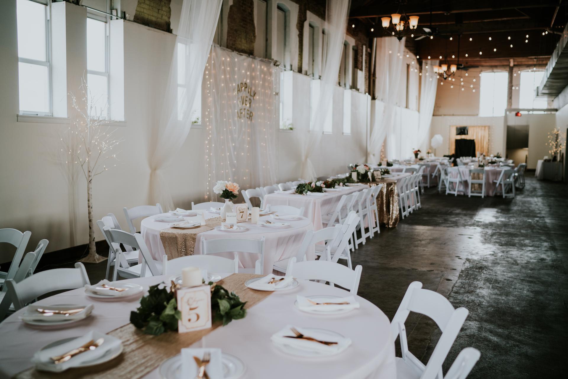 High vaulted ceilings and an open room concept, lets the love flow through the room. The Loft is a great place to host a reception and even the after-party. There is also a designated space for food service and a place for a bar or even a kids' room. Tables and chairs are provided and you are able to decorate the day before.