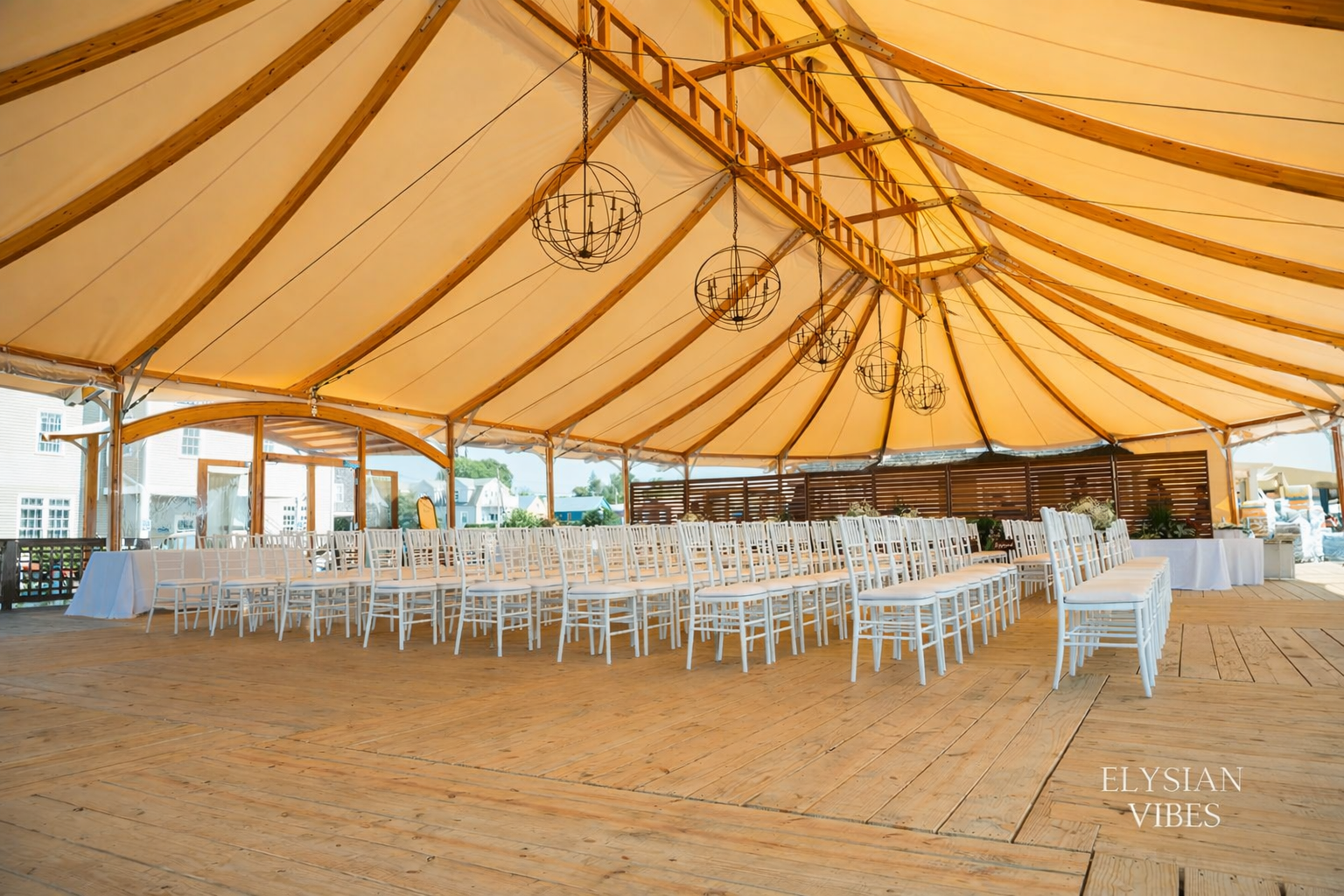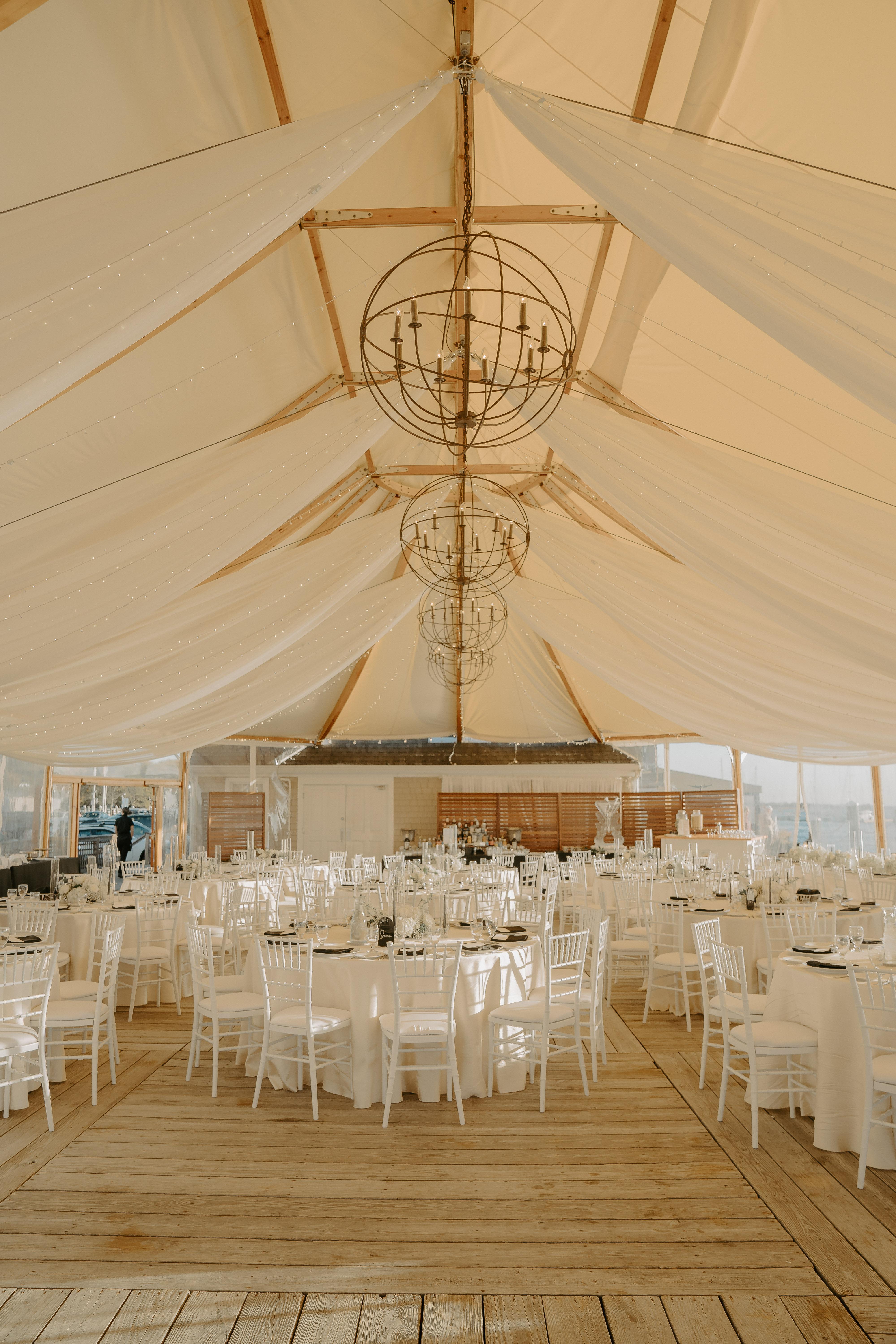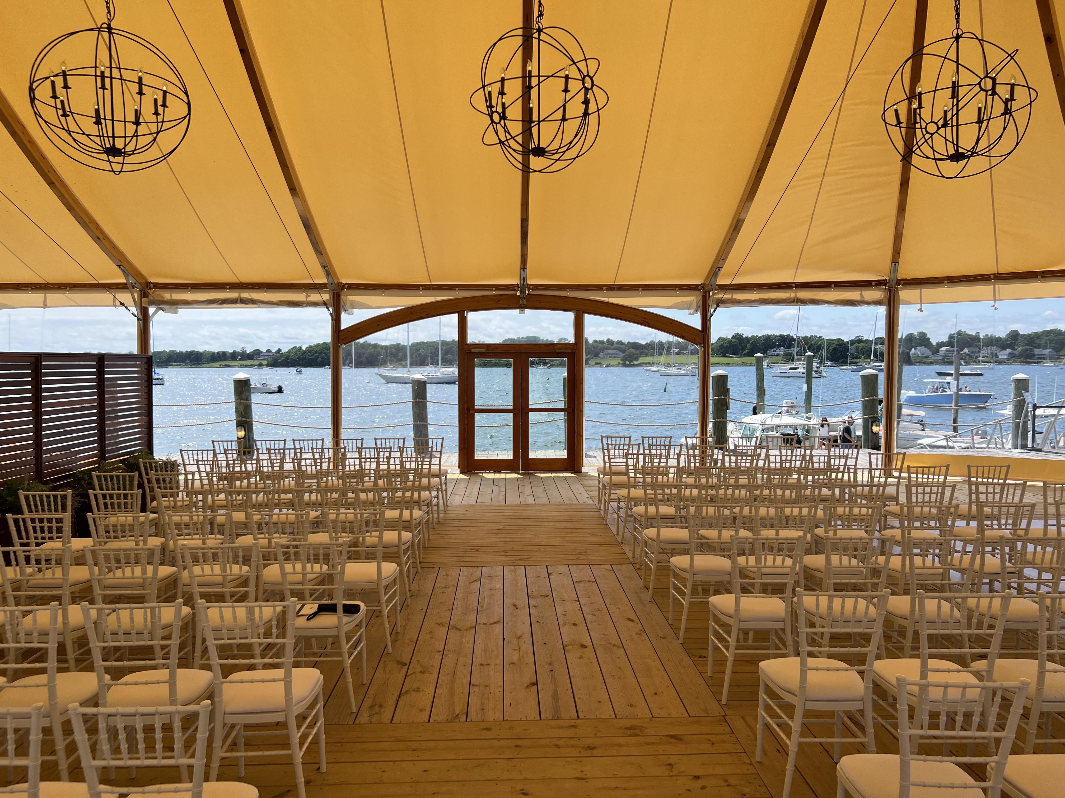 A beautiful 4,400-square-foot Sperry Tent perched on a wood-plank deck, overlooking the tranquil waters of Bristol Harbor and framed by a charming boardwalk.