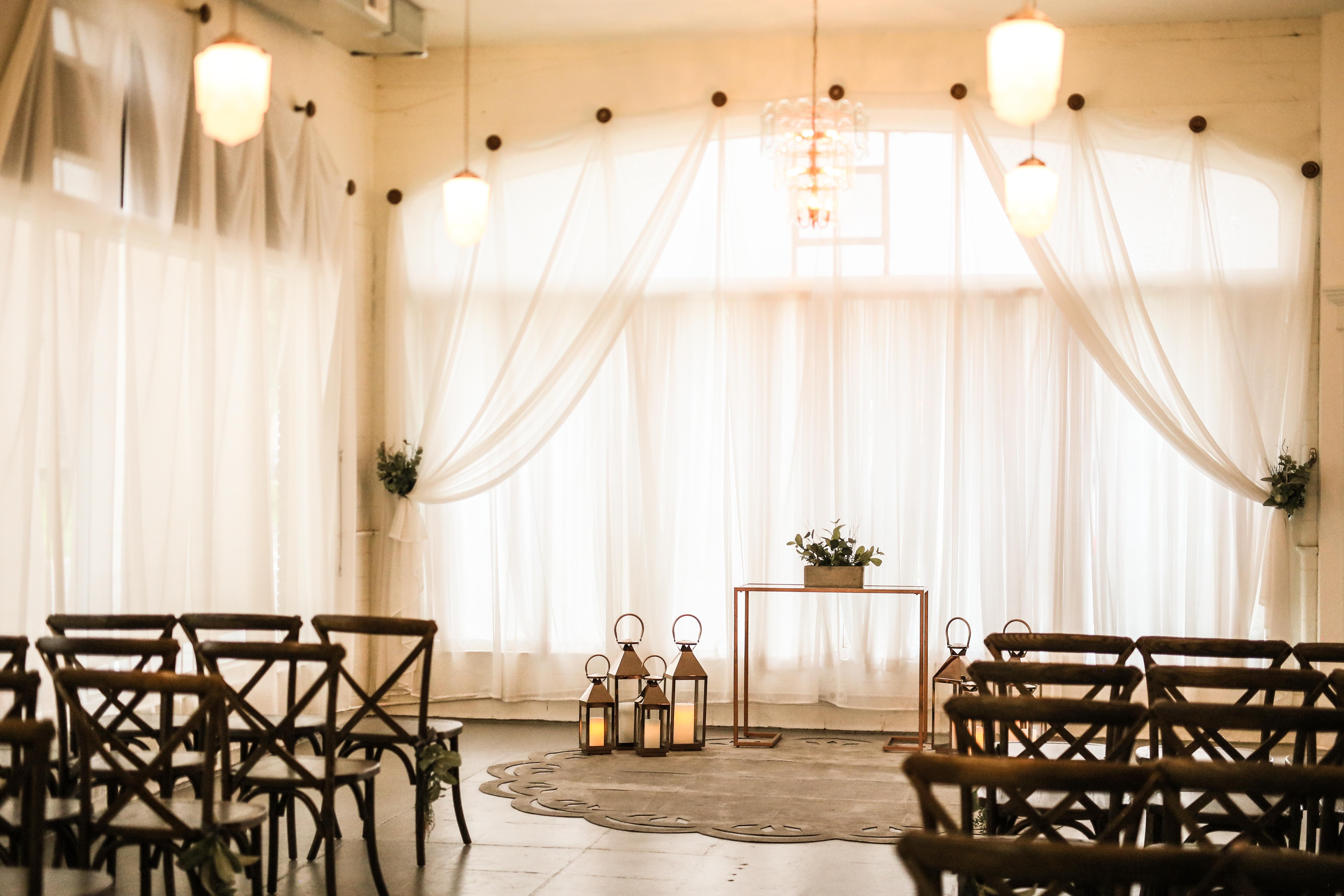 The Cakewalk Chapel & Event Space Liberty can seat up to 70 guests in an airy, light-filled environment. This venue features wall to wall 12 foot arched windows, art deco touches and natural greenery that make your event feel welcoming, modern, and warm. Our new expanded event space boasts a swanky lounge area, with mood lighting, distressed wooden bar, and farmhouse buffet table. Located right off the charming Historic Downtown Liberty Square.