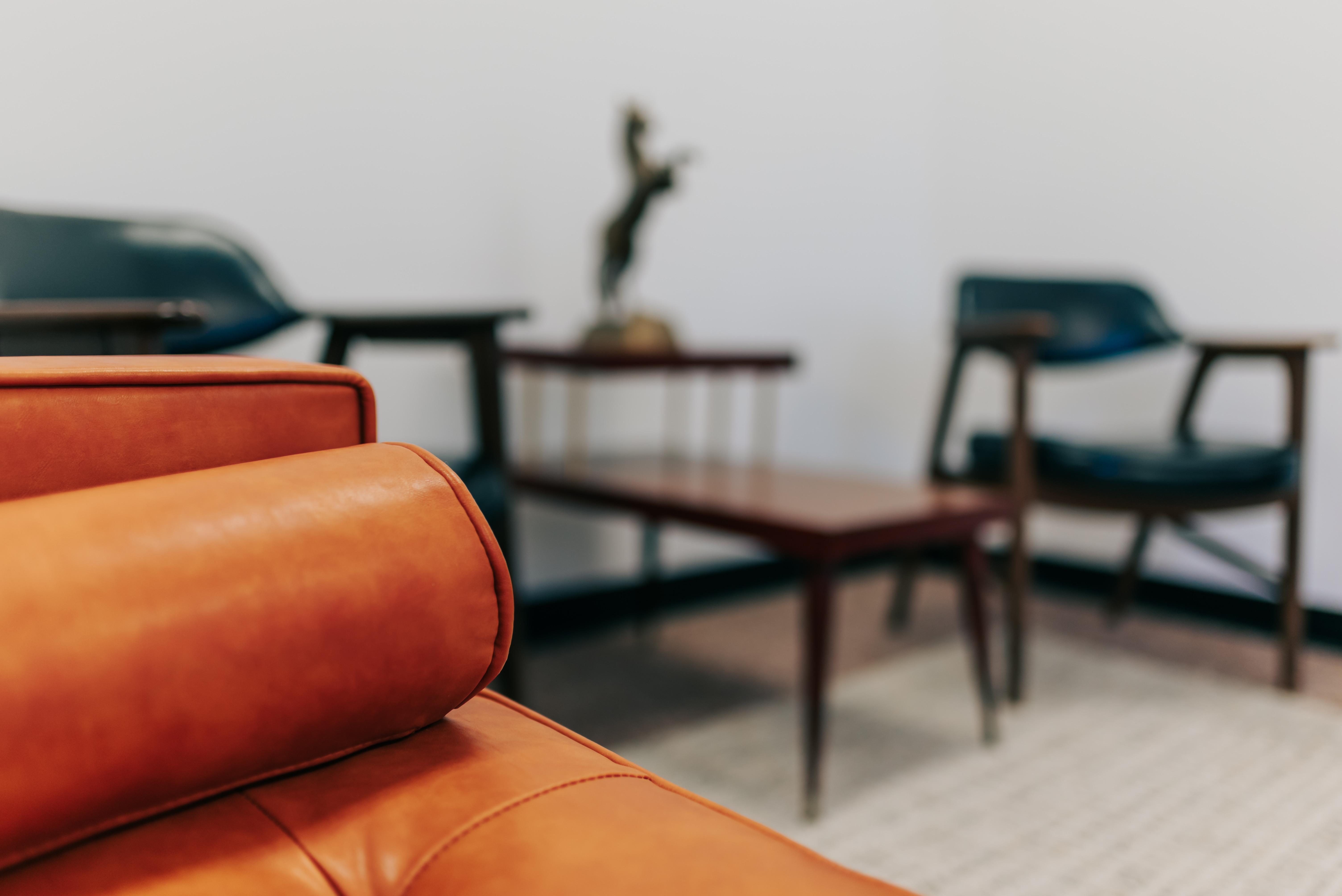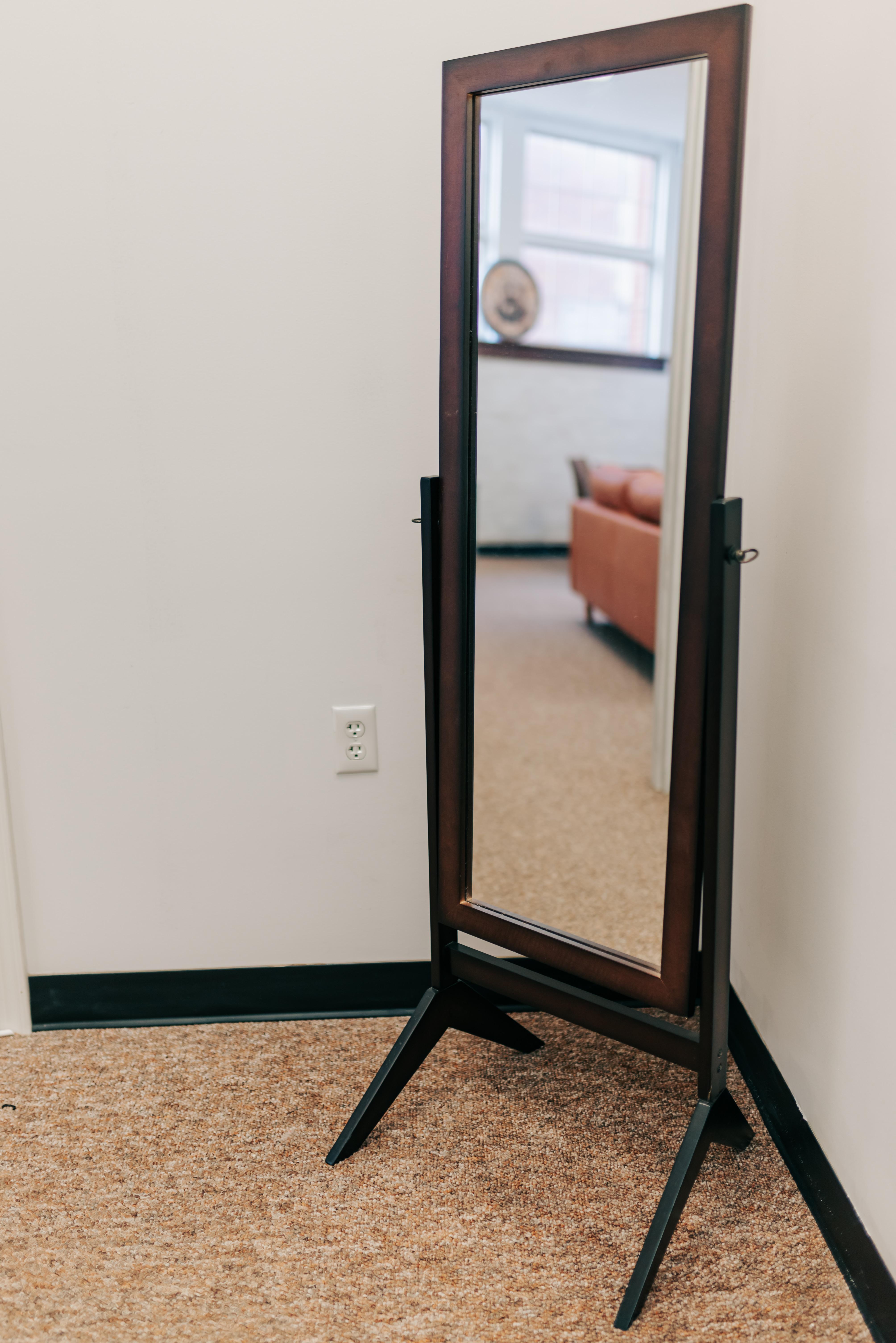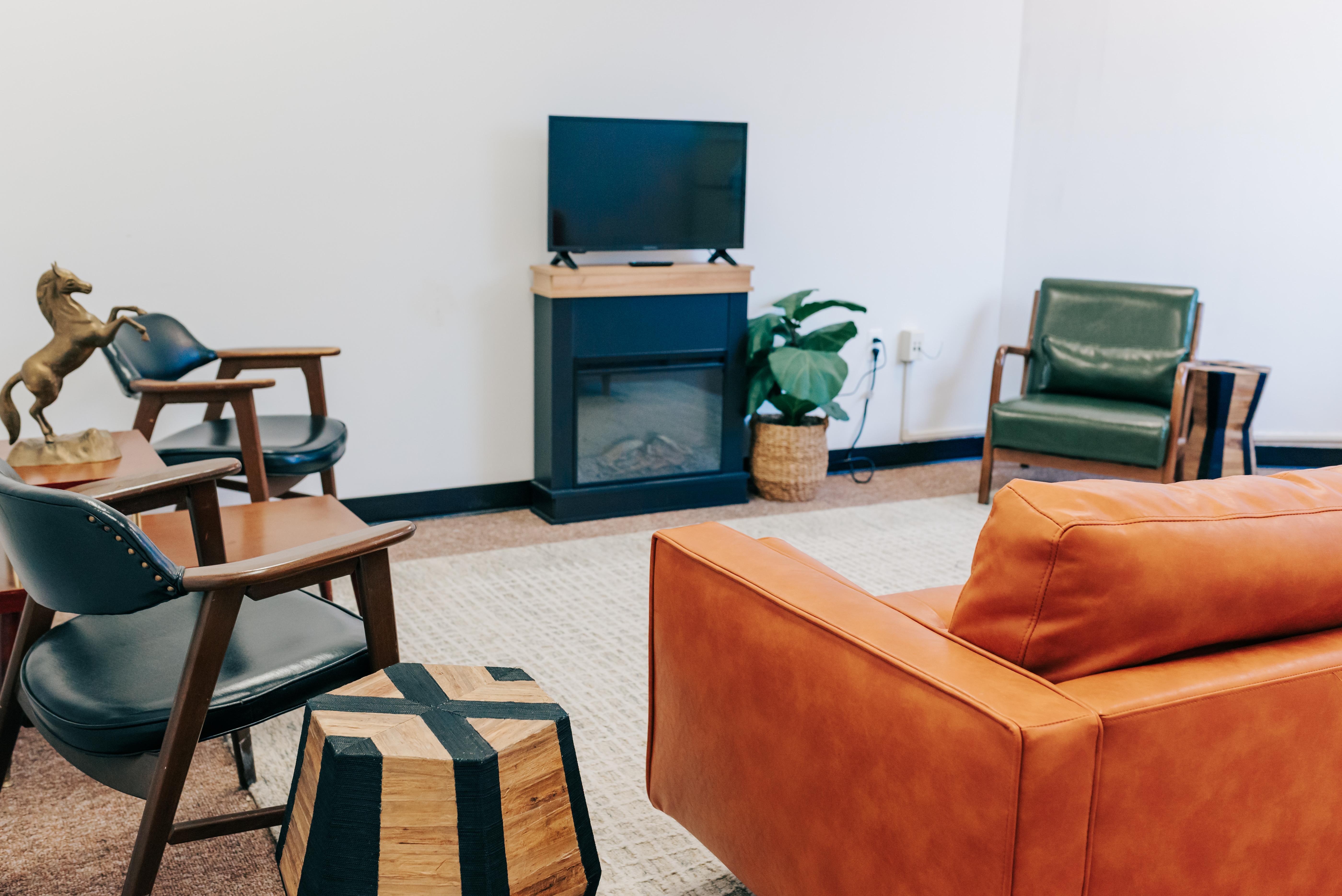 12pm access through ceremony Western boho inspired AC/heat controlled Clothing rack to hang suits Lounge seating Full body mirror Tufted tawny couch Round table with chairs Frigidaire refrigerator TV