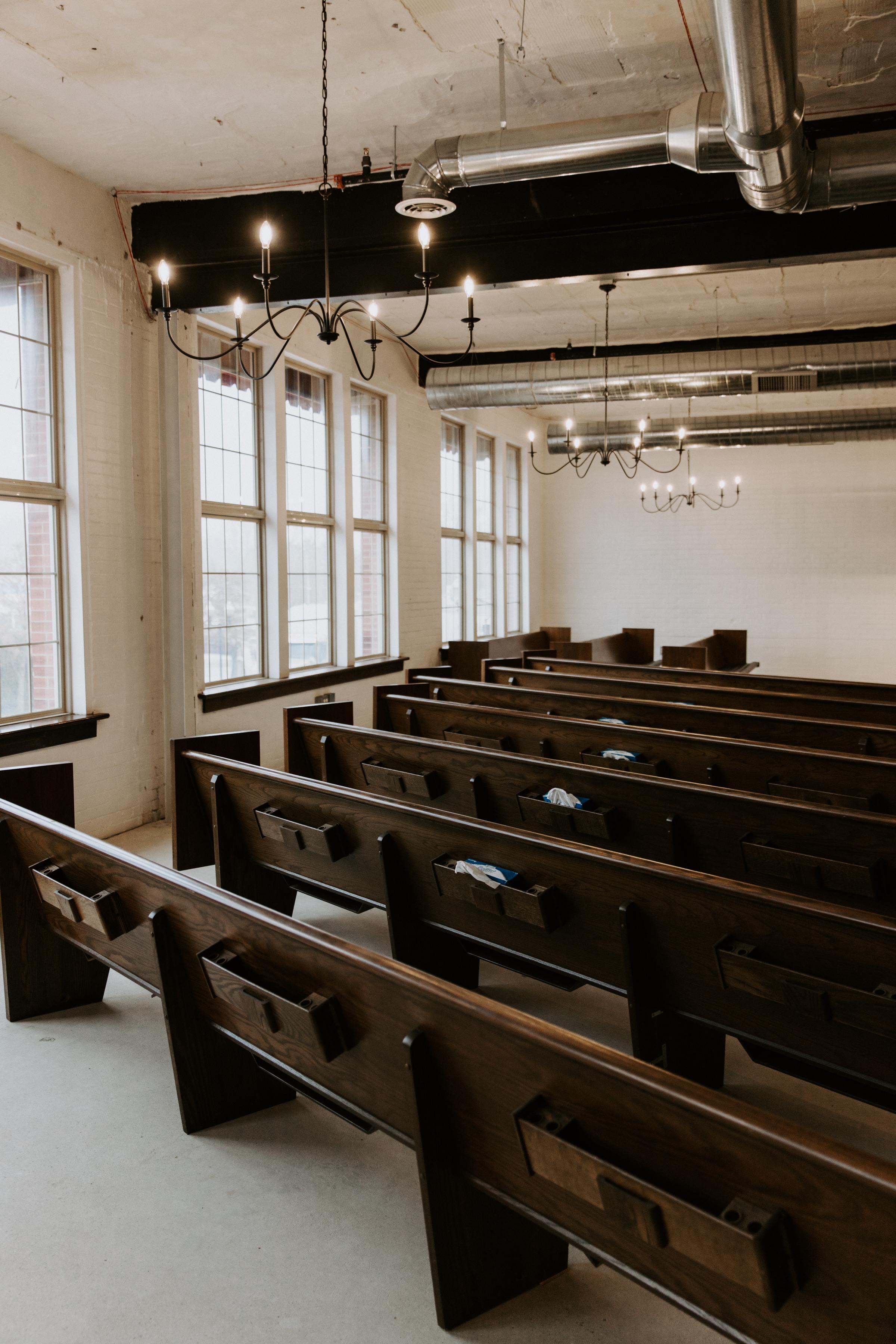 AC/heat controlled Comfortable seating of cushioned wood pews + cane back chairs Choice of our included ceremony decor + arches, podium stand, and unity tables Bose sound system with microphone, stand, and speakers Abundance of natural light for prime photos Included rehearsal night before your wedding, with included Chapel Coordinator Chapel Coordinator to help you get down the aisle on your special day Bathrooms located on 1st floor