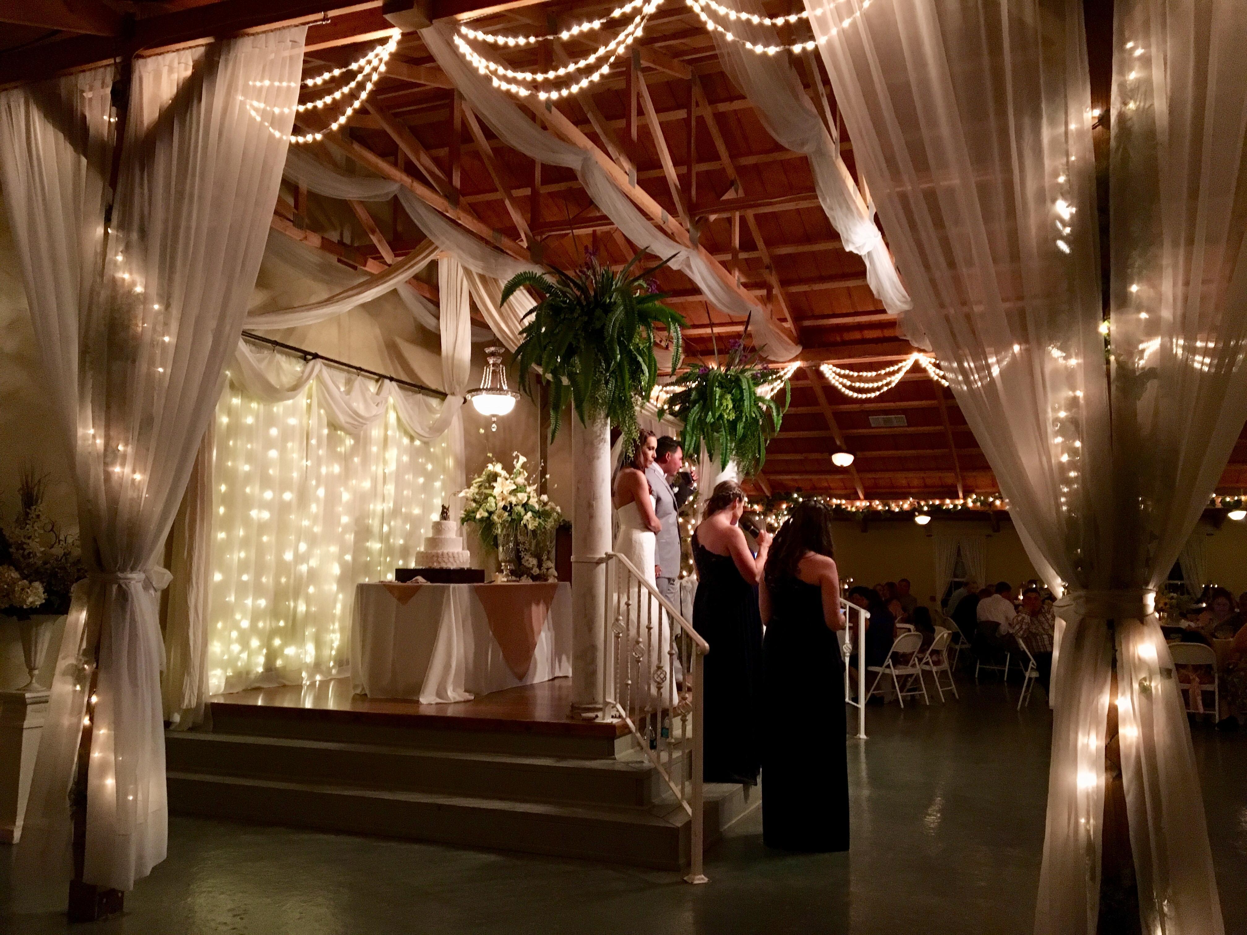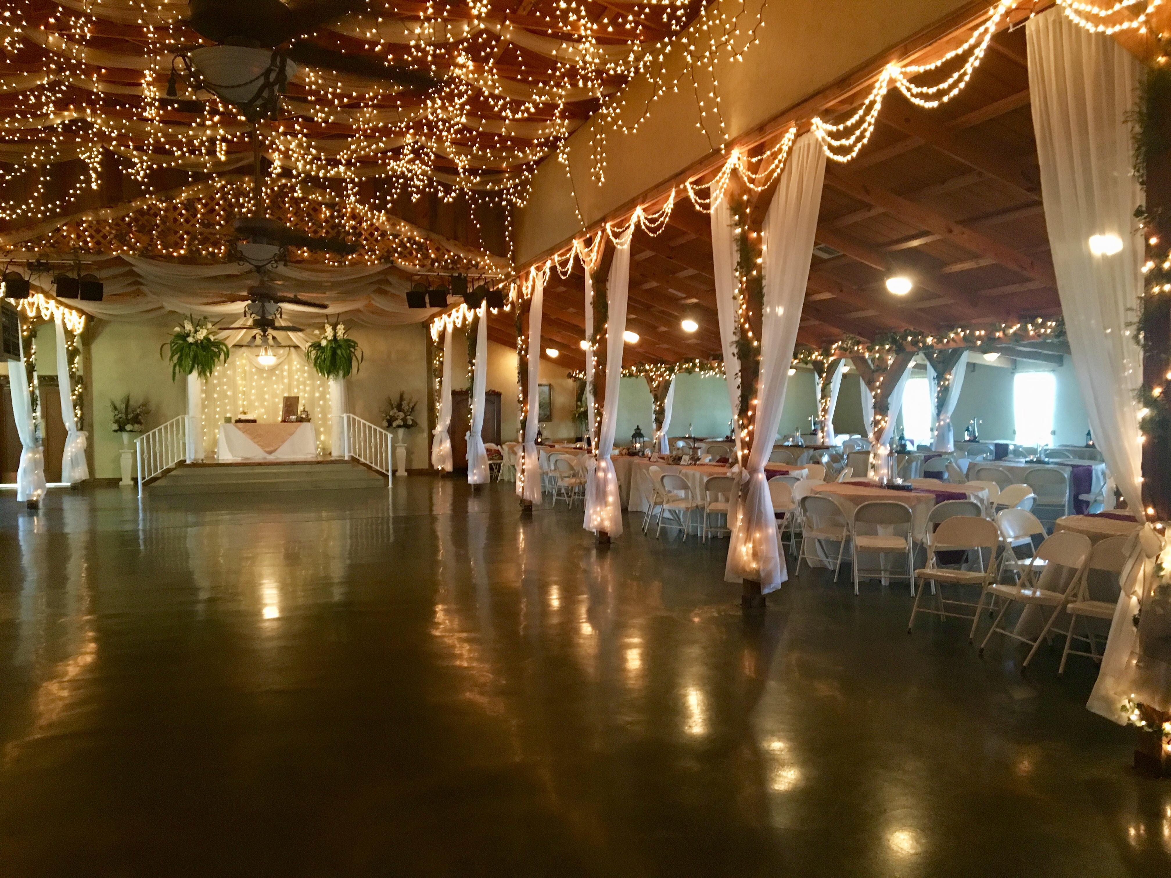 7000 square feet with dimmers over the table areas, big screen TV for watching slideshow, gift table in entrance, bar area, catering area, brides and grooms rooms, tremendous sound system with wireless microphone for minister and toasting when including our musician\DJ, decorated stage area for nuptials or cake/toasting, tables and chairs set up and taken down for you, optional linens and decor, optional coordinator and staff, and optional use the day prior.