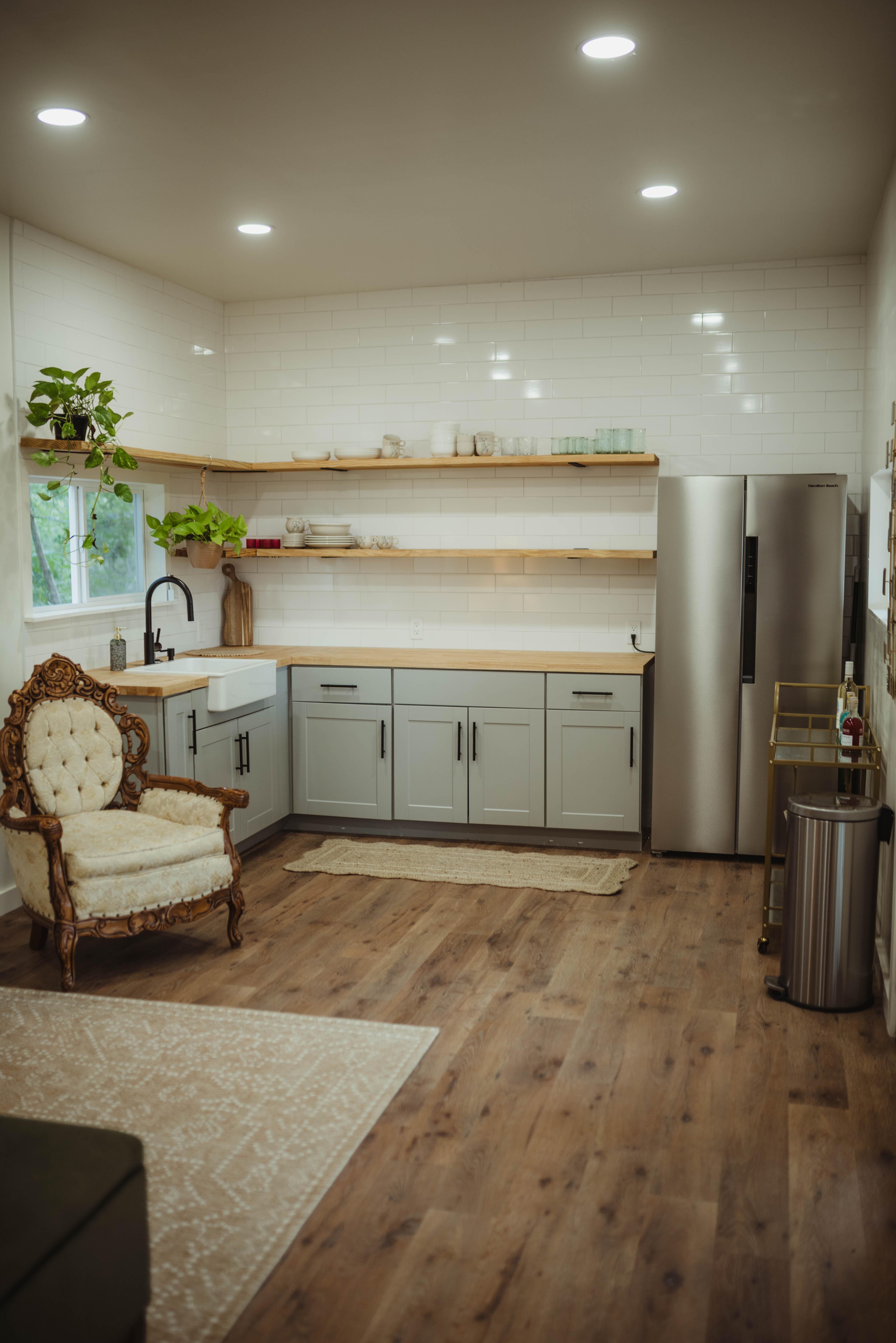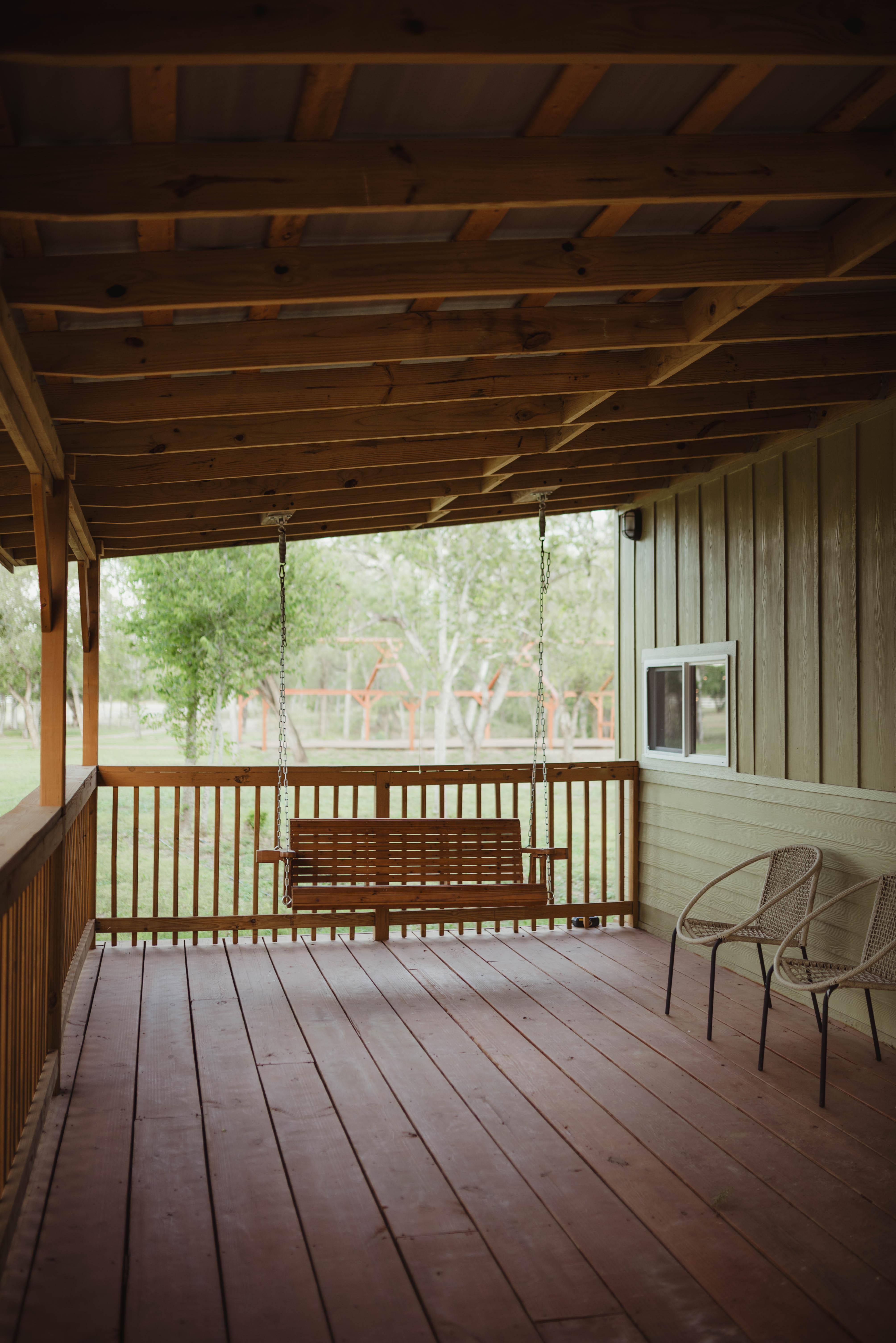 Wraparound porch with porch swing and seating Spacious living area with vintage furniture and curated décor Kitchen with full refrigerator, farmhouse sink, and open shelving Vanity station, mirrors, and dressing screen for getting ready Private bathroom with shower Soft lighting and natural photo-friendly design Climate-controlled comfort year-round