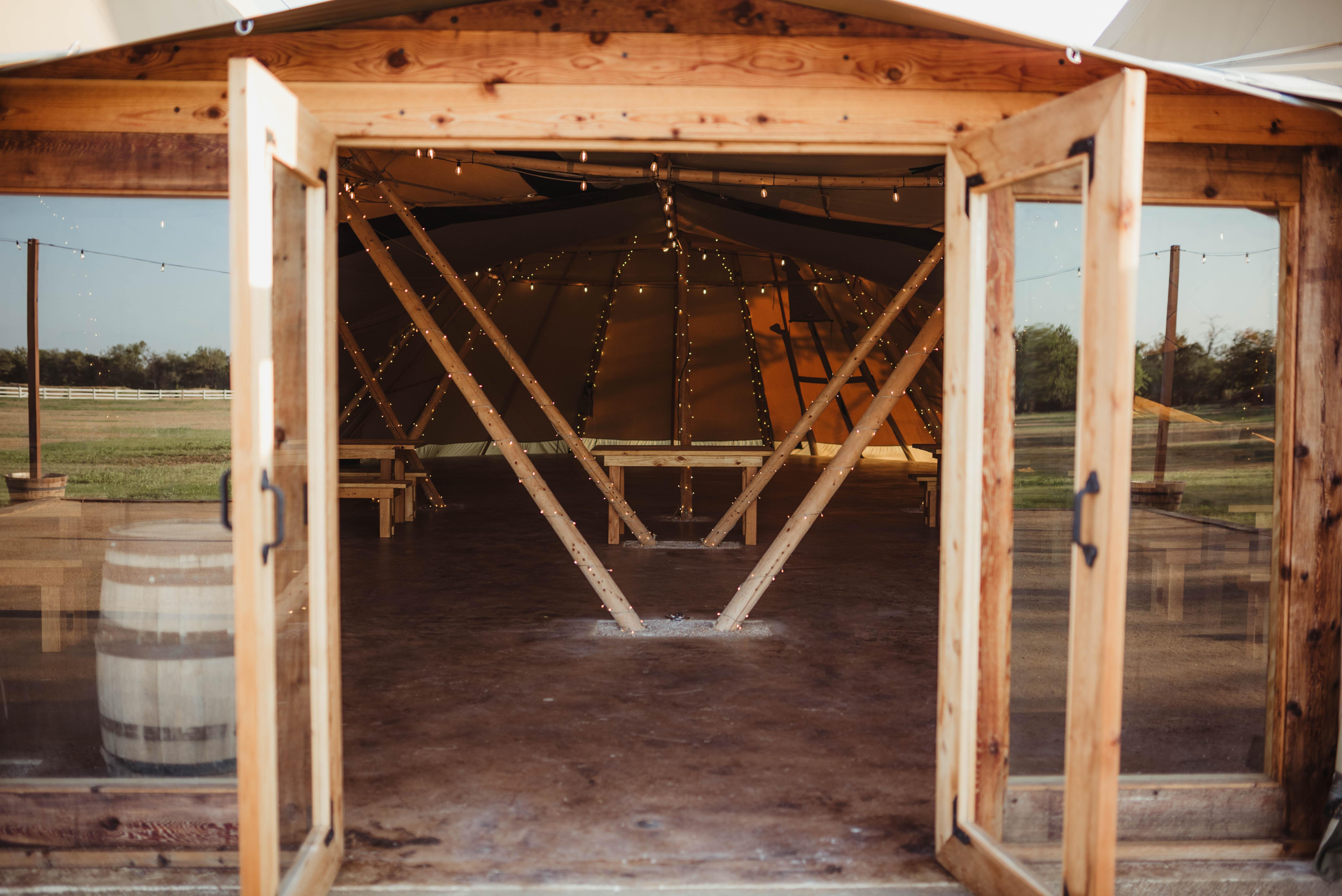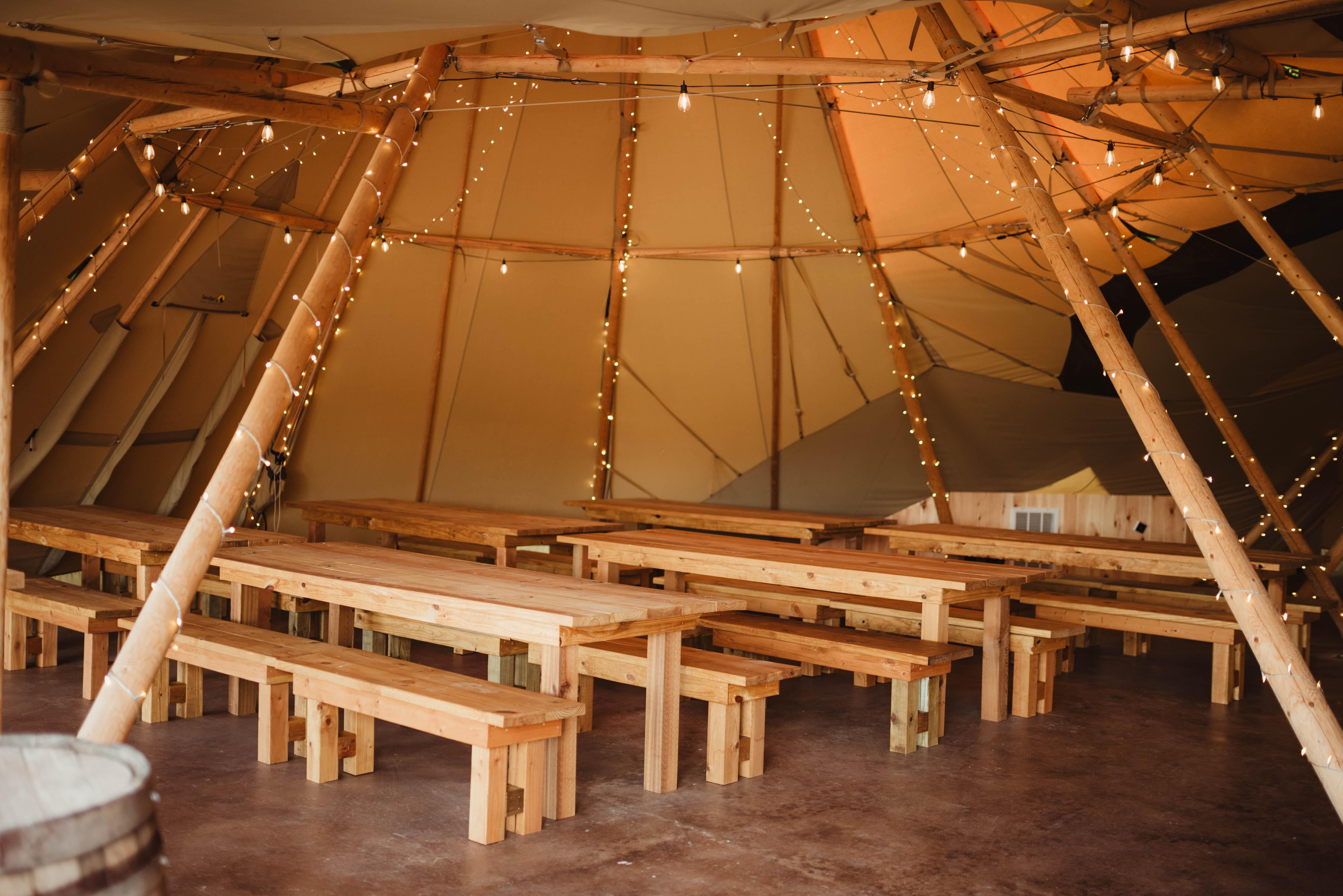 Three connected Nordic tipis with soaring peaks Handcrafted wooden tables and benches for dining Café and string lighting included Dance floor space with flexible layouts Weatherproof covering for comfort year-round Open-air feel with panoramic views of the property