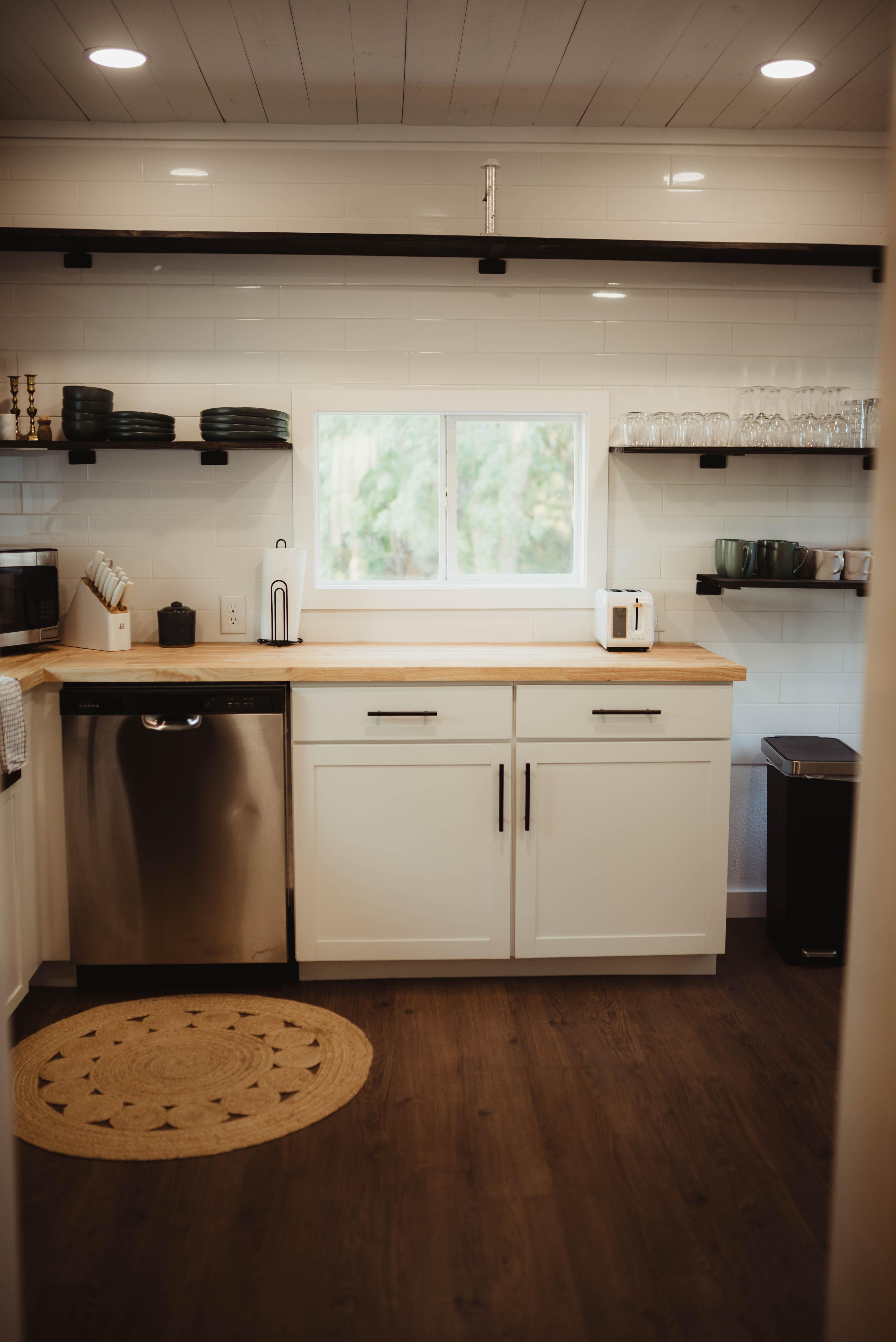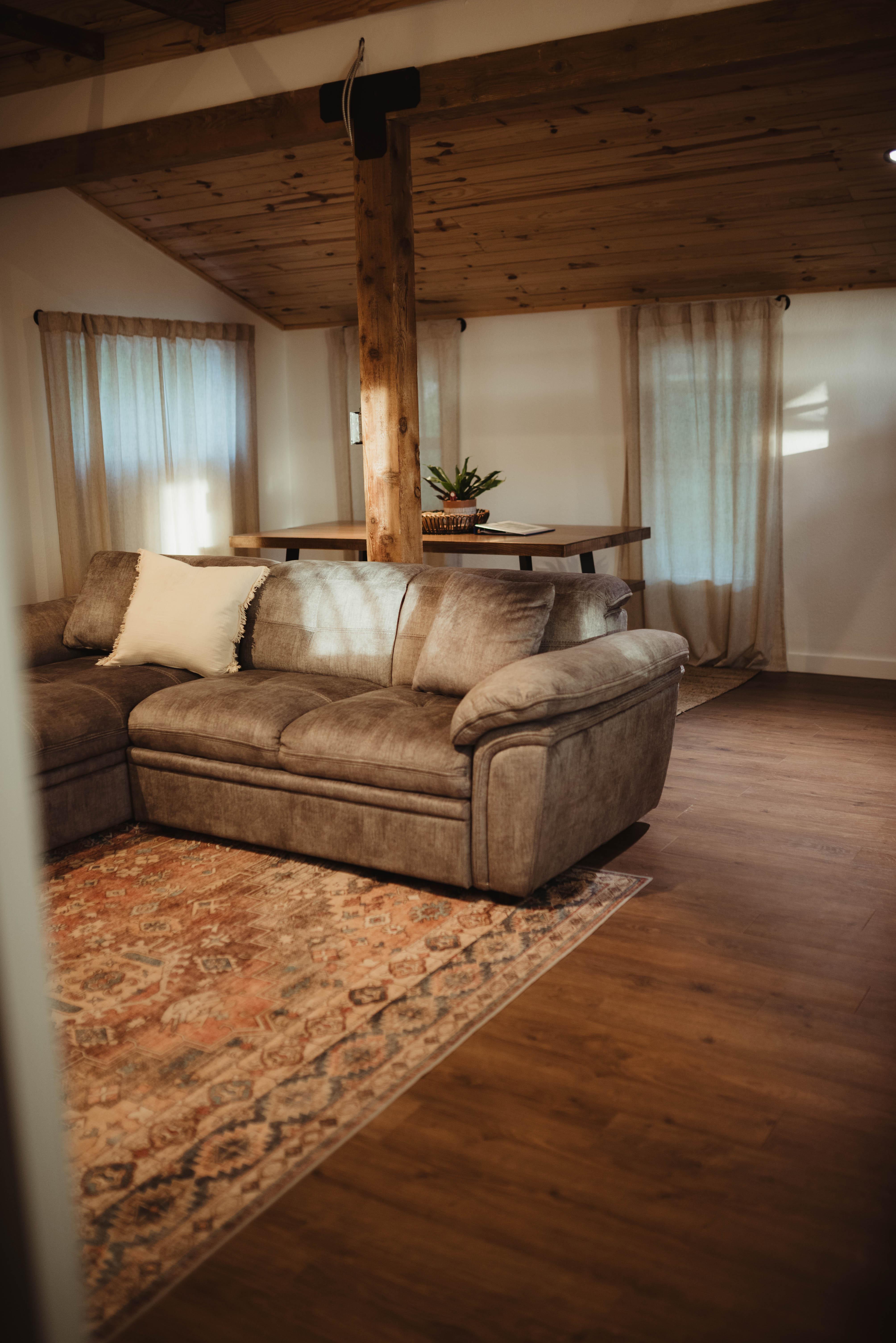 Full kitchen with modern appliances Spacious living room with sectional sofa and TV Private bedroom and cozy furnishings Bathroom with marble vanity and walk-in shower Rustic beams and curated décor Dining nook and open layout for gathering Climate-controlled comfort year-round