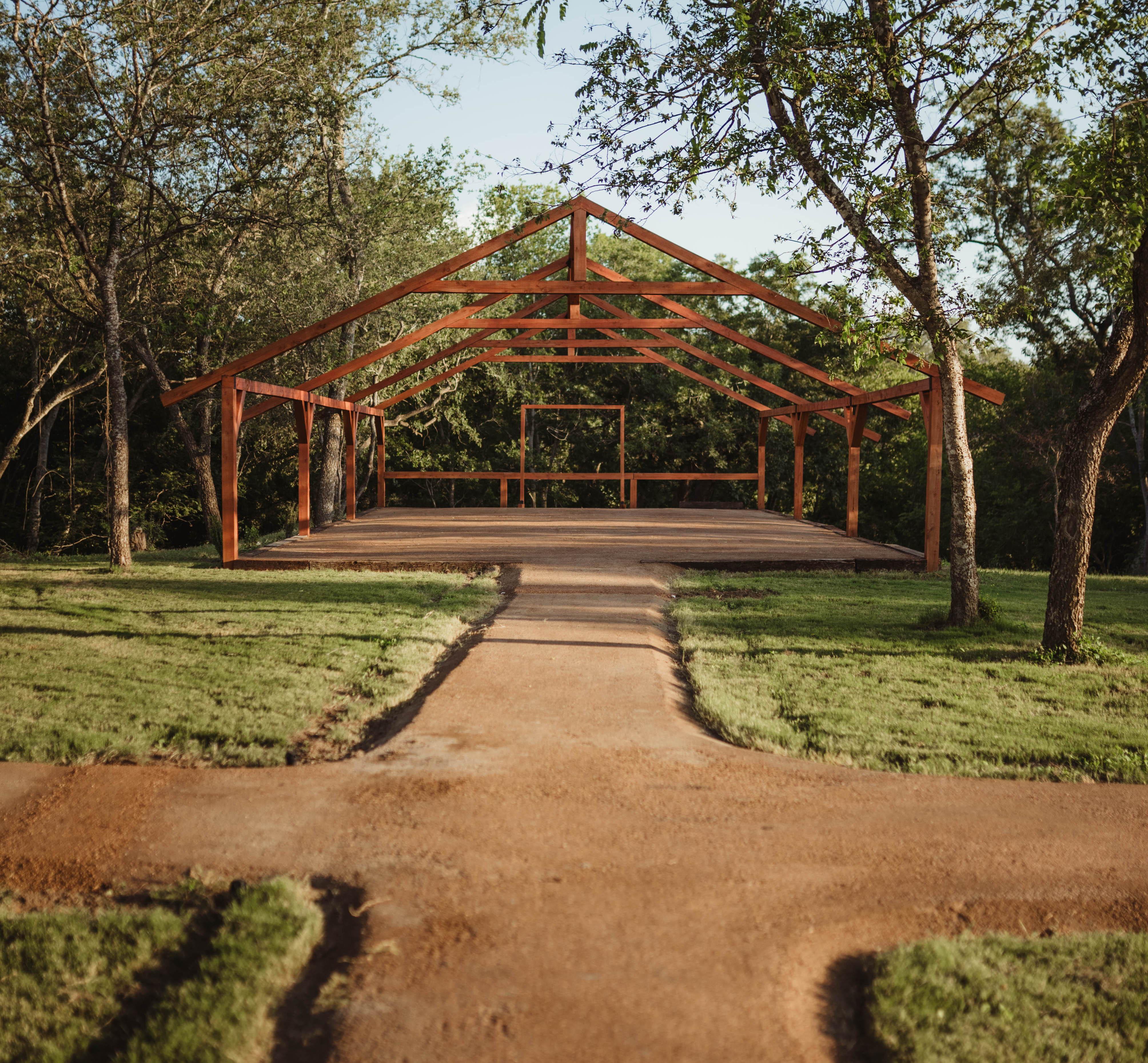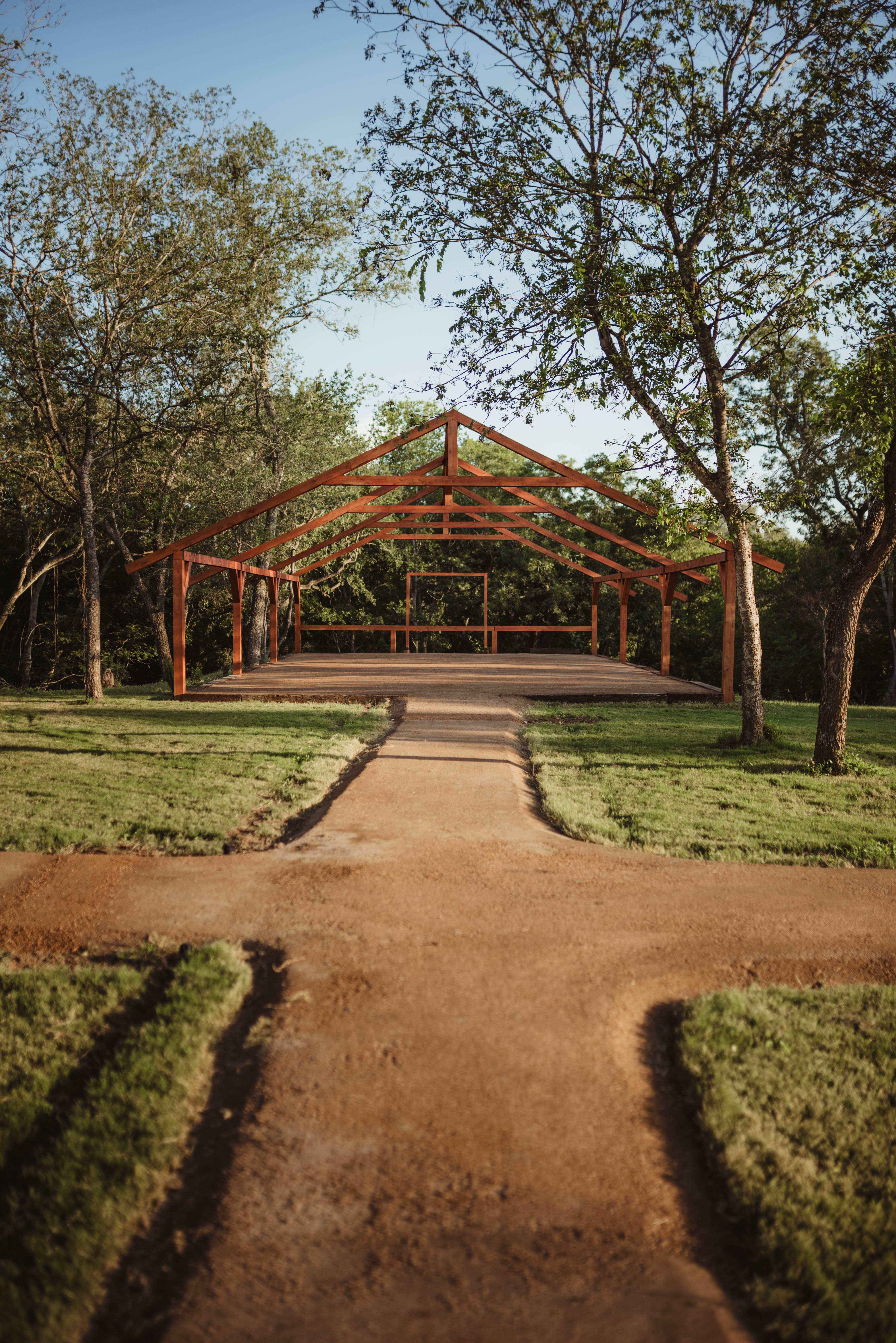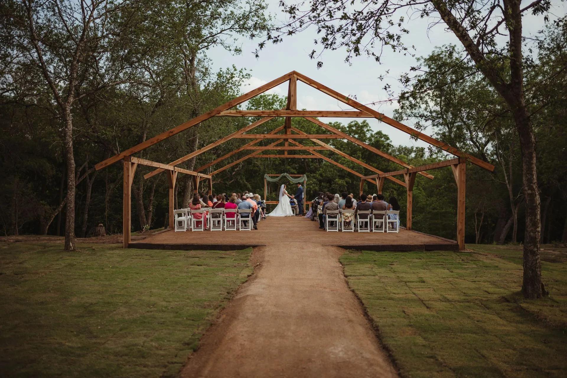 Handcrafted cedar beam arches Ceremony platform with natural aisle Surrounded by shaded trees and woodland views Open-air design for flexible décor and seating Ideal for floral installations and draping Steps away from the reception tipis