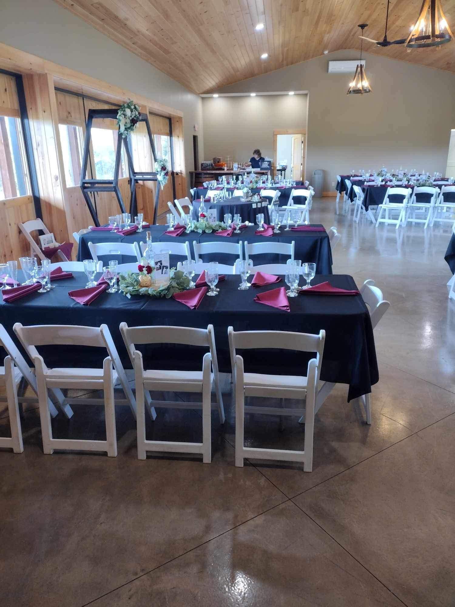 Our main event space can accommodate up to 150 guests under a soaring vaulted ceiling. Four large sliding doors open wide, framing breathtaking views of the vineyard and lake. This versatile space can be further expanded outdoors to accommodate additional guests, allowing you to celebrate your special day surrounded by nature's beauty.