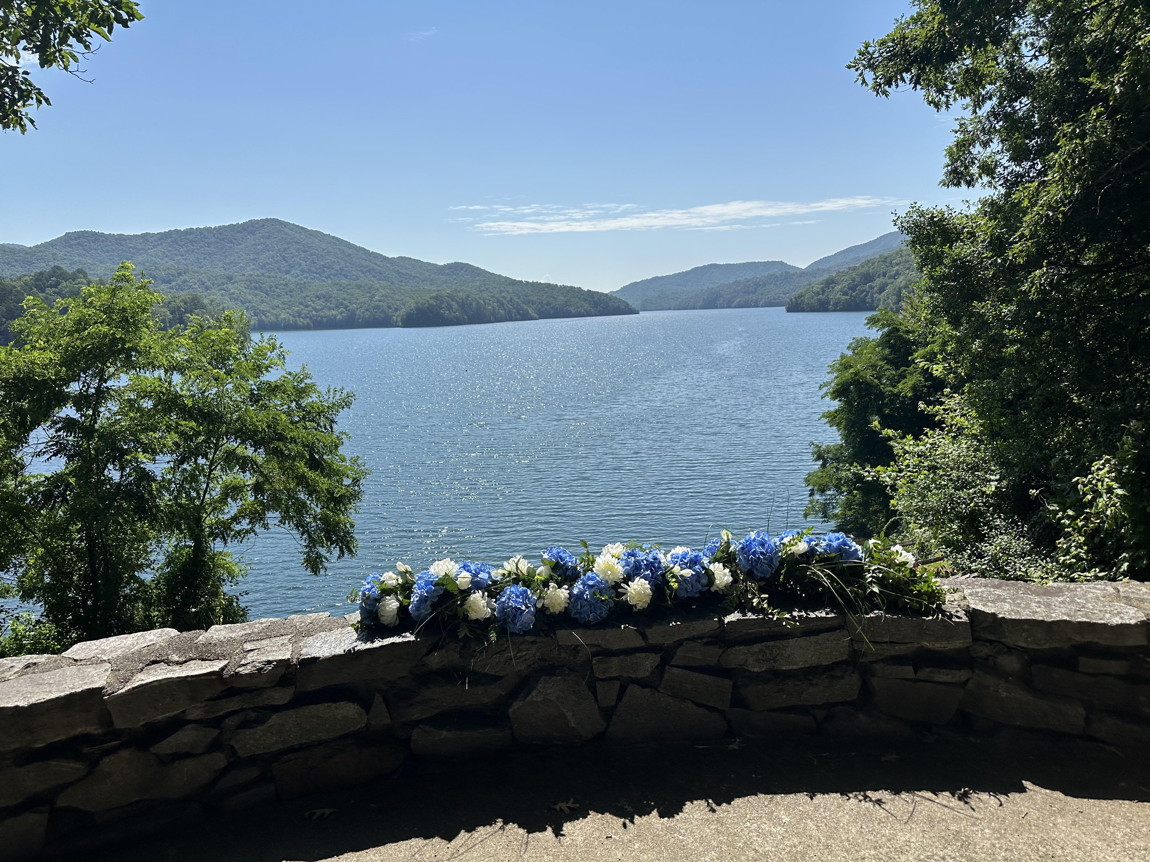 This stunning ceremony venue is located at the top of Fontana Dam, NC, with sweeping views of Fontana Lake and Great Smoky Mountains National Park. The rustic stone platform features a winding walkway for a magical processional and unforgettable grand entrance to say your "I Dos"