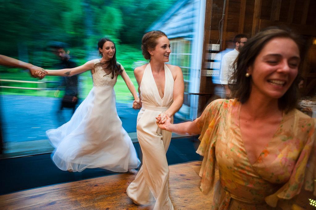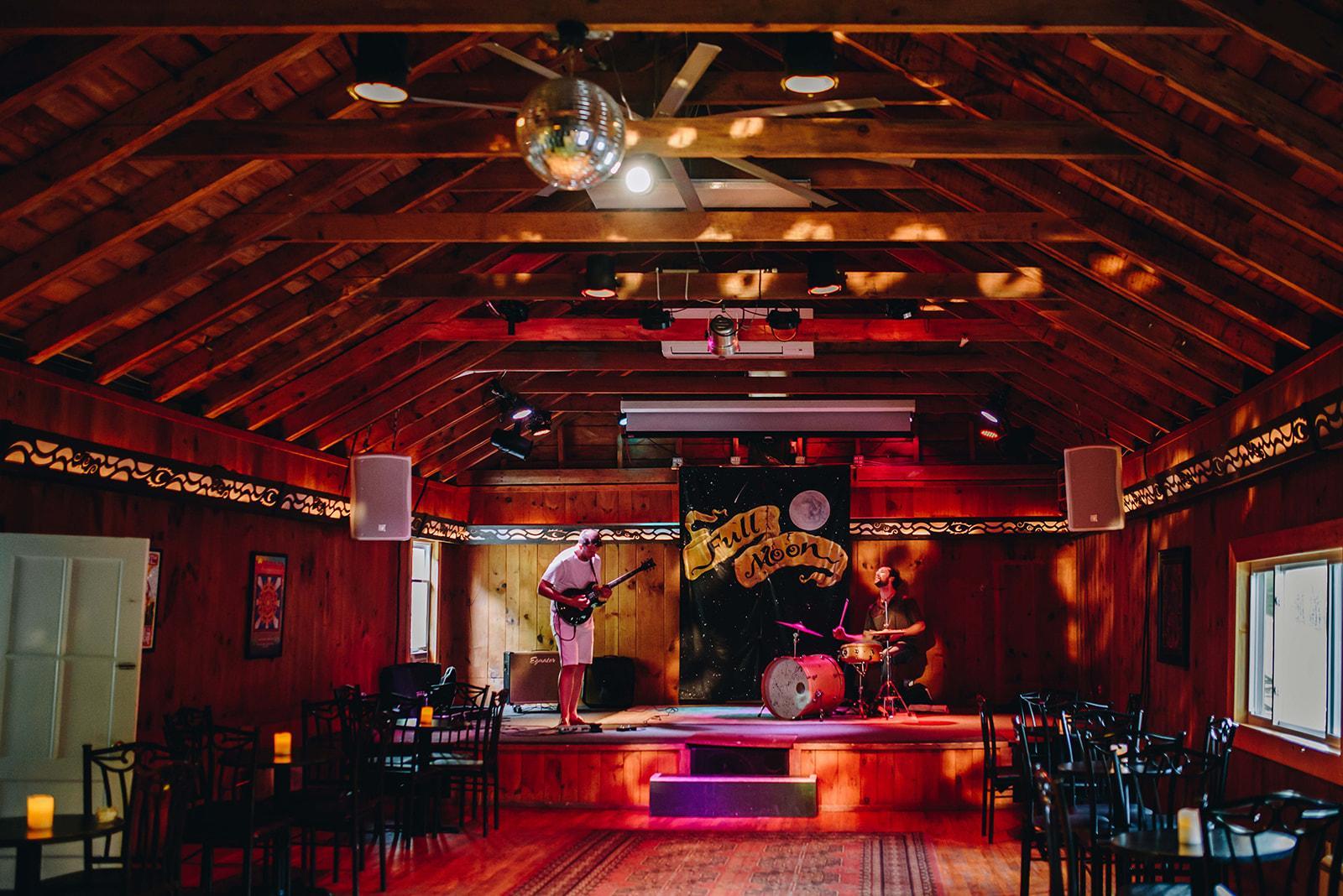 The roadhouse is a great way to top off your wedding event at Full Moon Resort celebrations. The principal use for this space is for socializing following wedding receptions. Gatherings range from laid-back, social soirees with light music to full-scale dance parties. The space features a full copper-top bar, bluestone fireplace, small stage with colorful stage lighting, a classic "dirty dancing" mirrorball, and an artistically designed lighting valence that encircles the entire room.