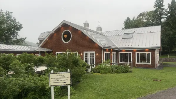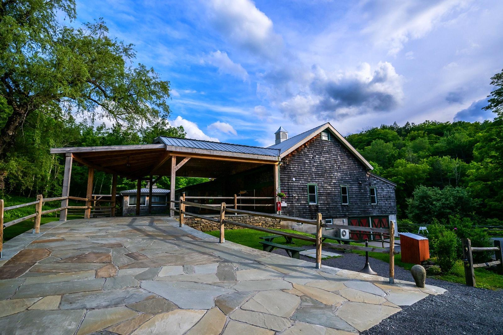 Multifunctional, rustic barn with beautiful windows overlooking the creek and valley. Beautiful, attached bluestone-covered patio. Usable for many types of functions, with principal use for welcome/arrival BBQ-rehearsal dinners and other catered functions such as lovely buffet breakfasts and lunches, and cocktail parties. Full bar. Two restrooms. Lovely old-fashioned barn loft.