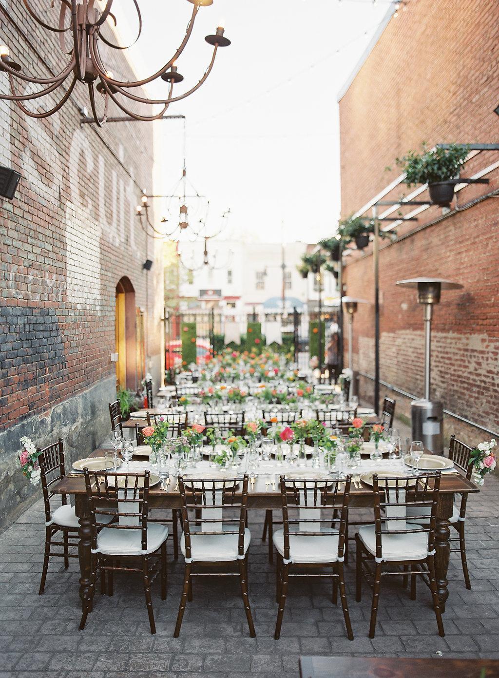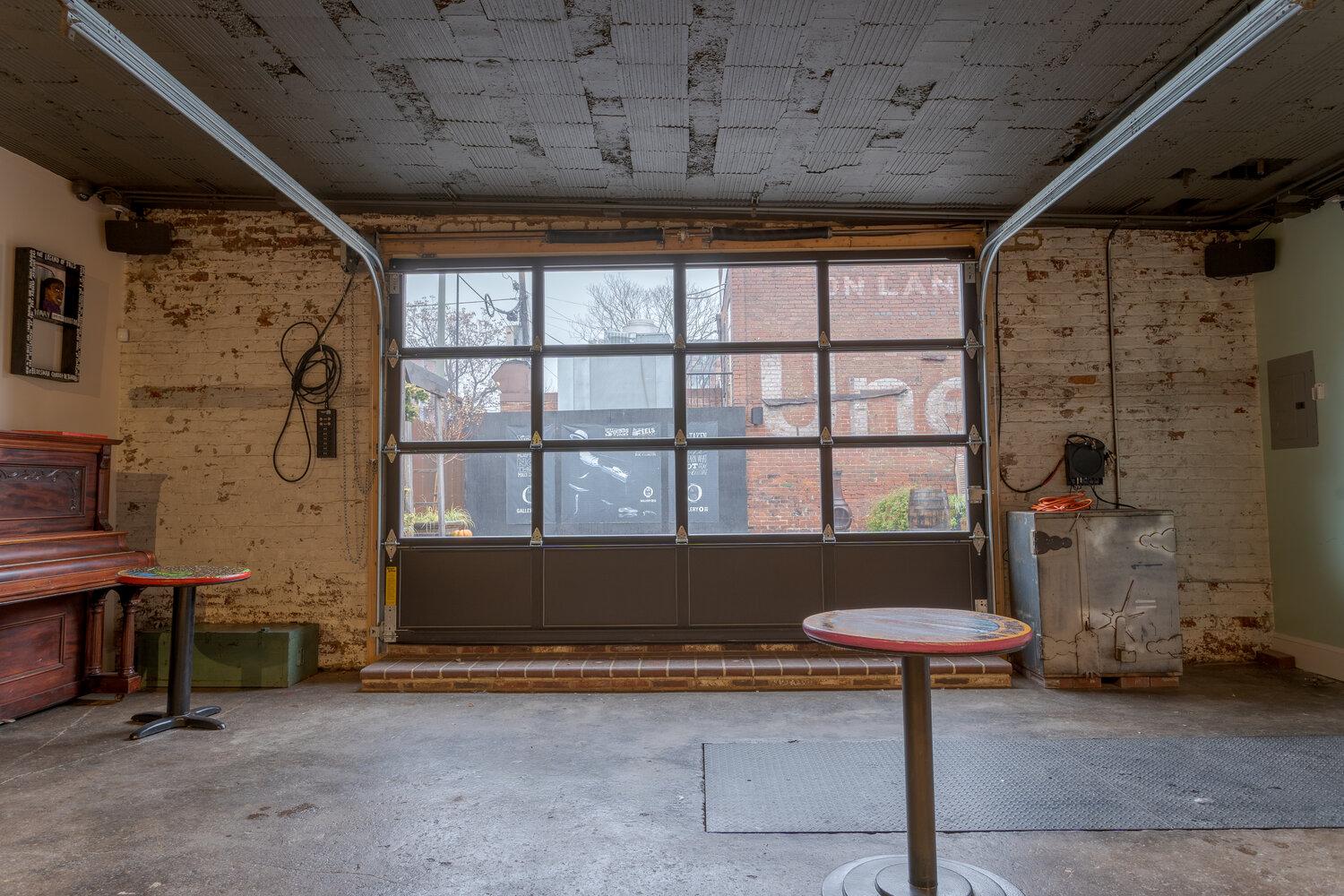 With a windowed garage door opening to the private Courtyard, the Garage offers the perfect indoor-outdoor space. Complete with two more ADA restrooms and a custom built-in bar, the space is often used for cocktail hour as well as dinner and dessert buffets.