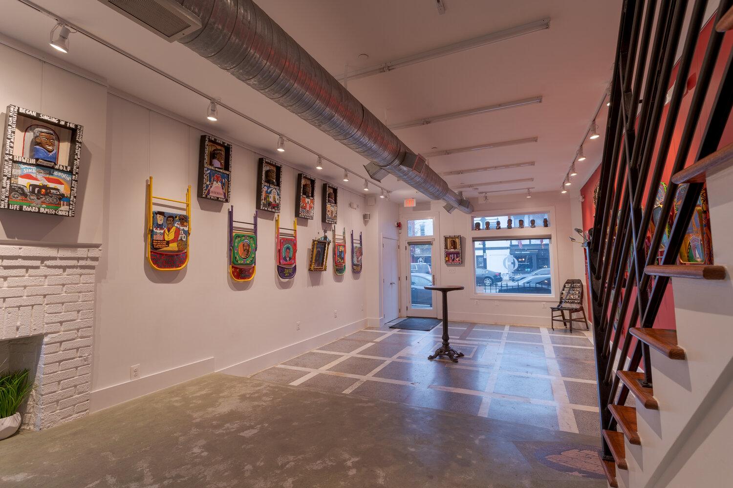 The East Gallery, the original gallery building, consists of two cozy floors with an ADA restroom on the first floor. Take in the beautiful rotating display from Dolly and Steve's private art collection. Couples often use this gallery as the main entrance and have even welcomed their guests herewith a glass of champagne!