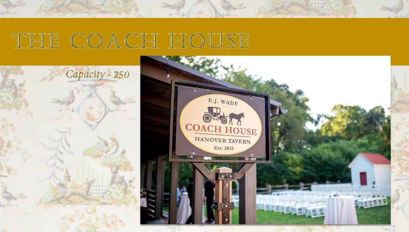 The Coach House is an elegant setting for indoor/outdoor ceremonies and receptions. Modeled after an early 19th century stable in Hanover County, the 3,200 square foot space features exposed beam construction, skylight system, and sliding glass pocket doors. It remains respectful of the historic Tavern site while offering such amenities as HVAC, private restrooms, built-in audio-visual system, and adjacent guest parking.