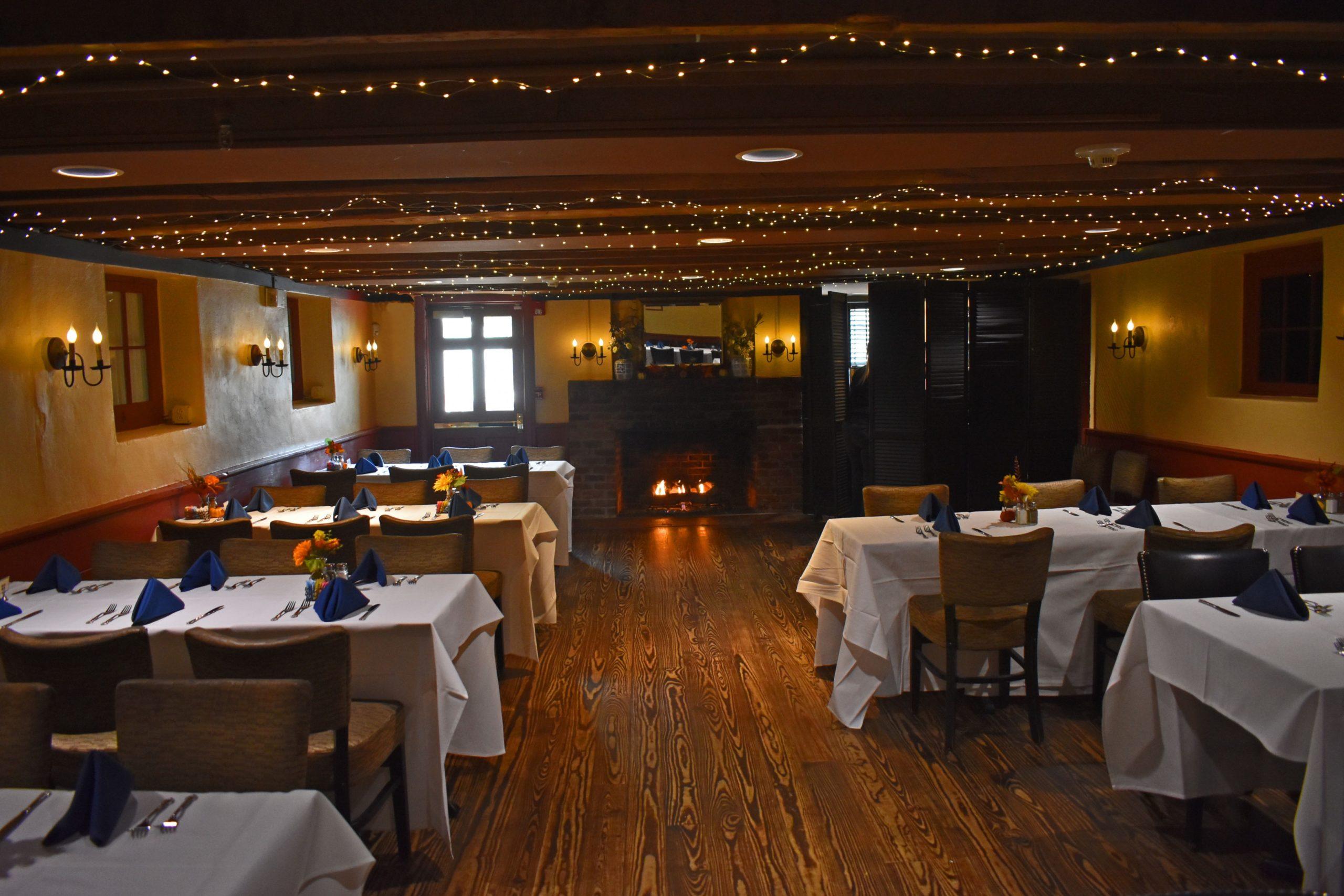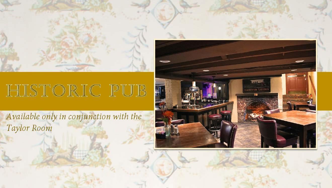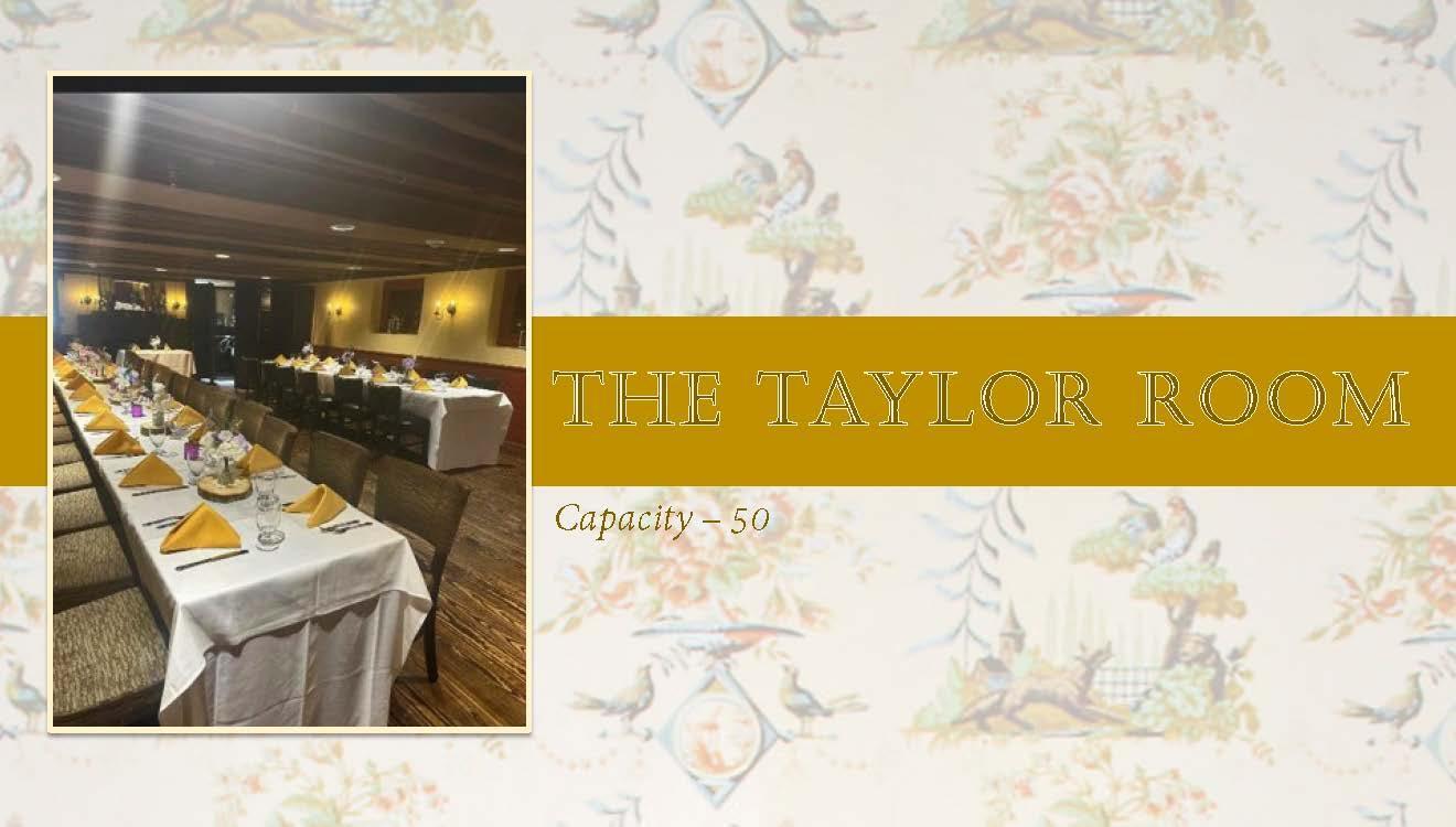 The elegantly rustic Taylor Room features a working fireplace, wood-beamed ceilings, and warm aesthetics. This room can accommodate 50 guests in a variety of seating configurations suited to your event. If additional space is required, the Taylor Room may be used in combination with the adjoining historic Pub.