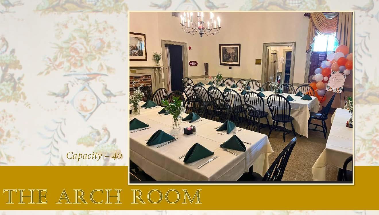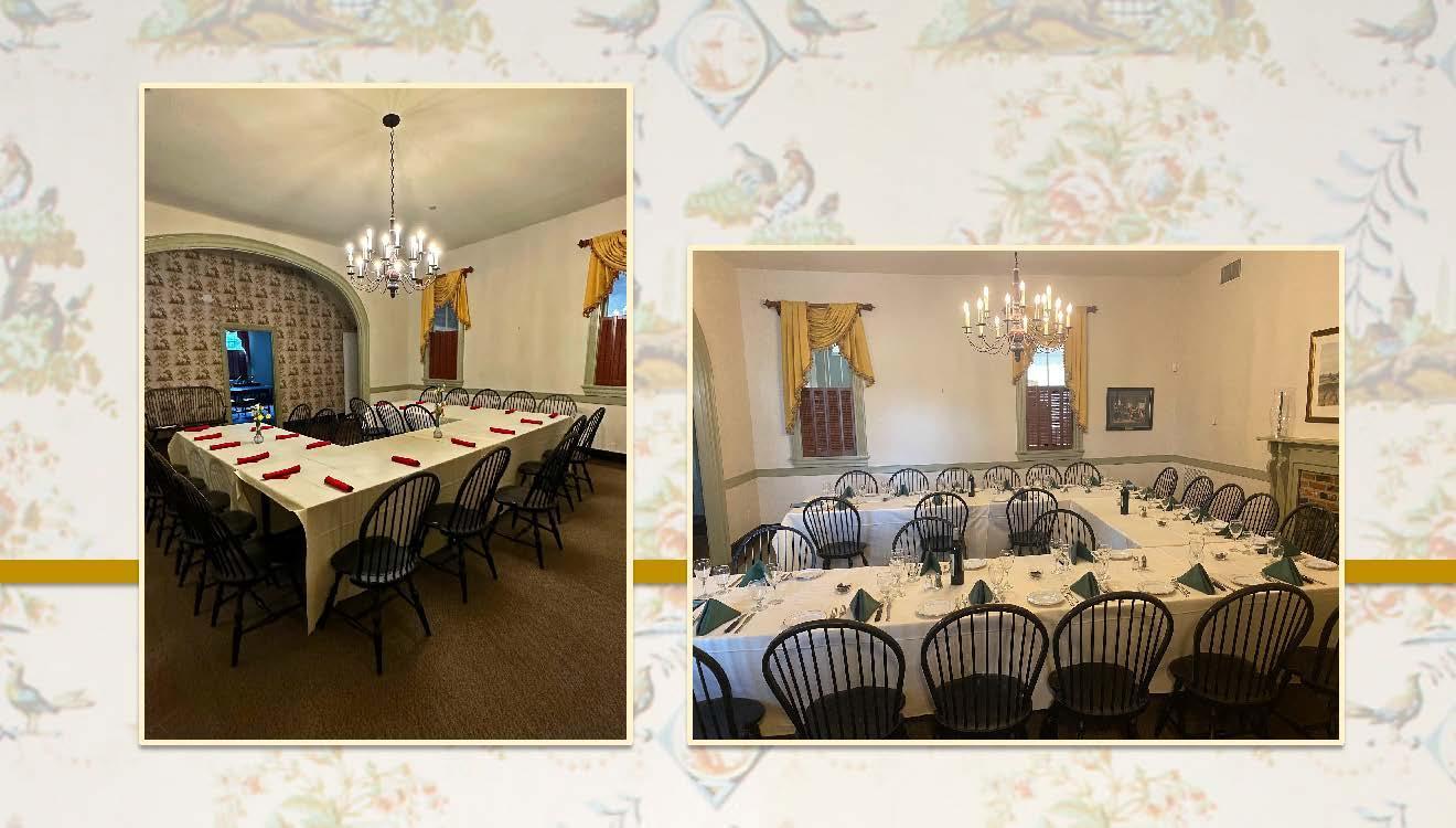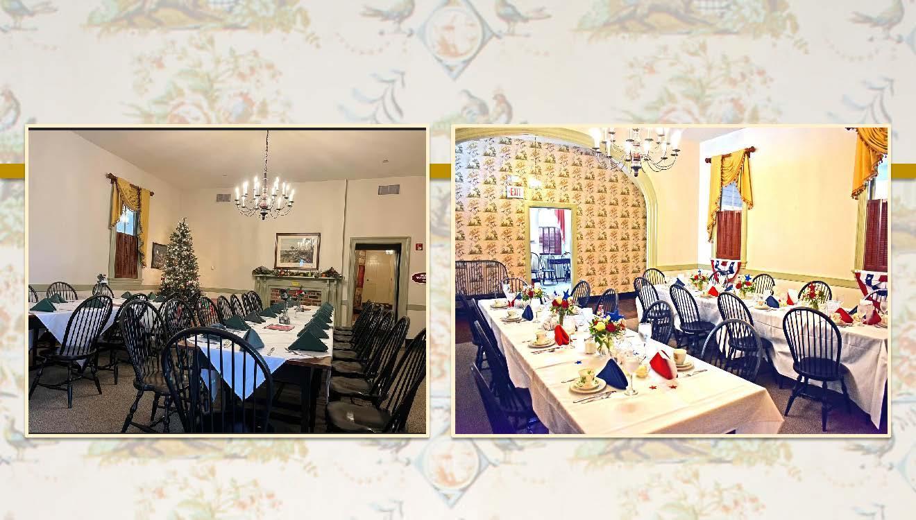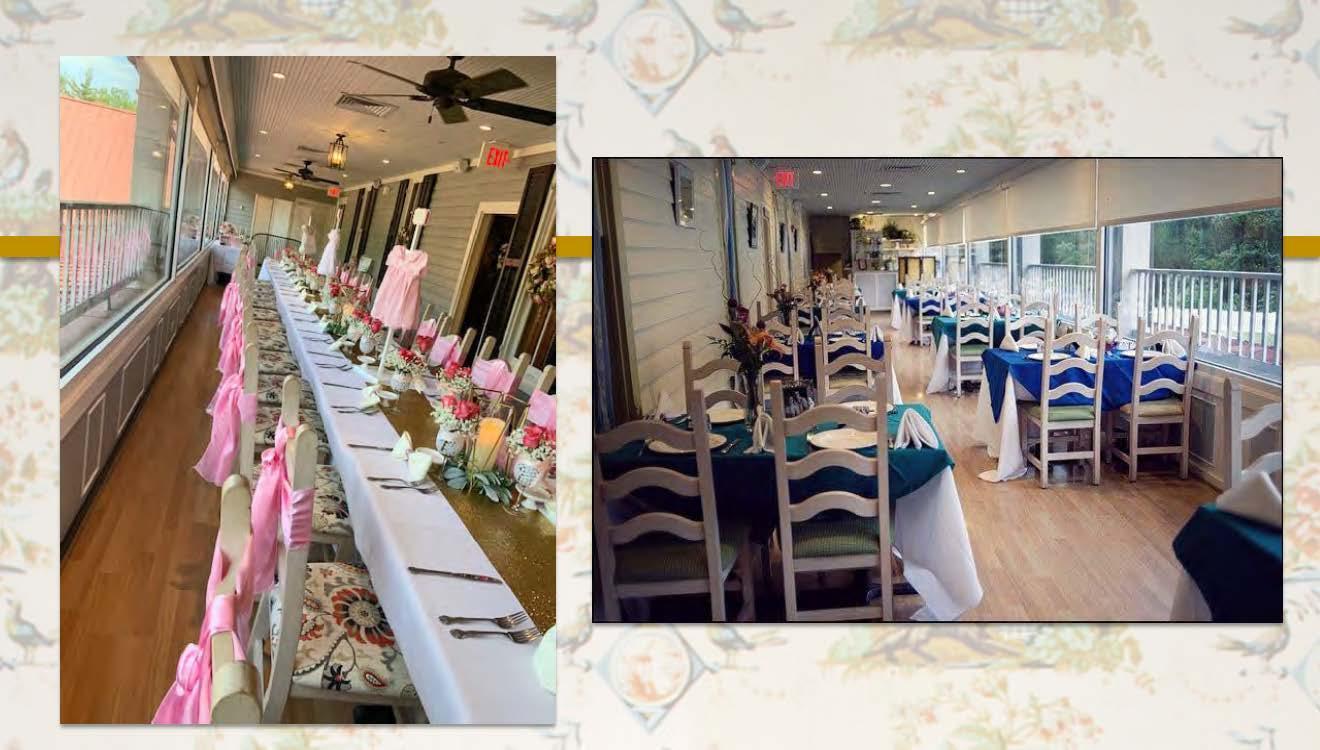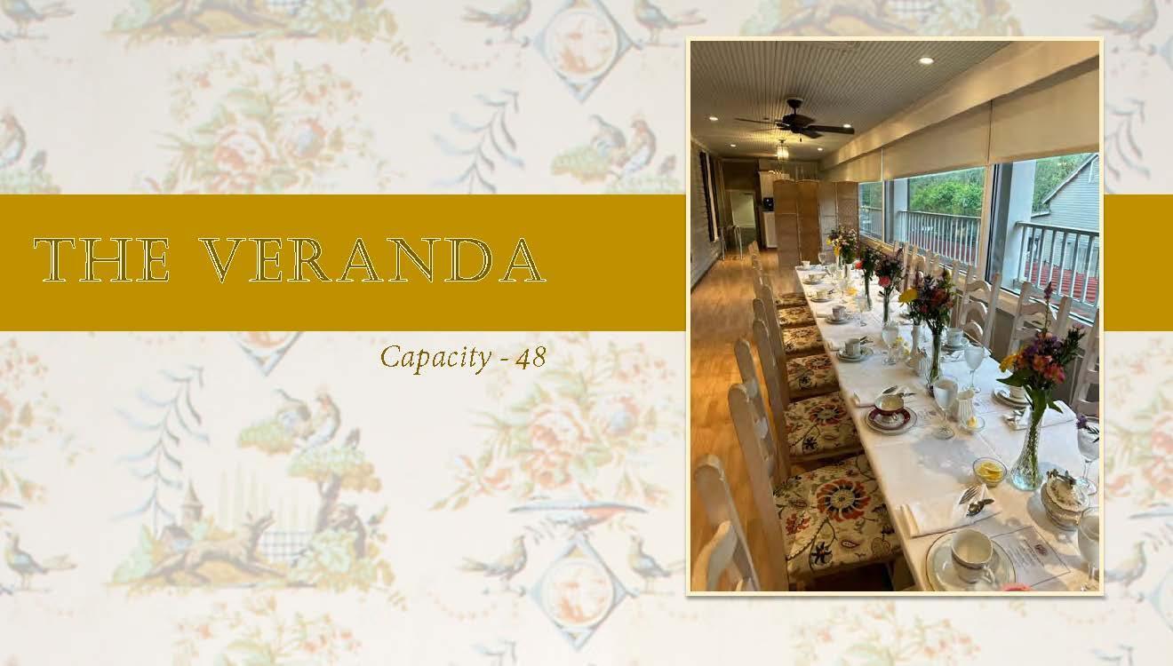 The full wall of windows allows the sun to cascade year-round into the light and airy Veranda. This cheery porch may be used in combination with the Historic Rooms for additional space. The Veranda is perfect for bridal luncheons and rehearsal dinners.