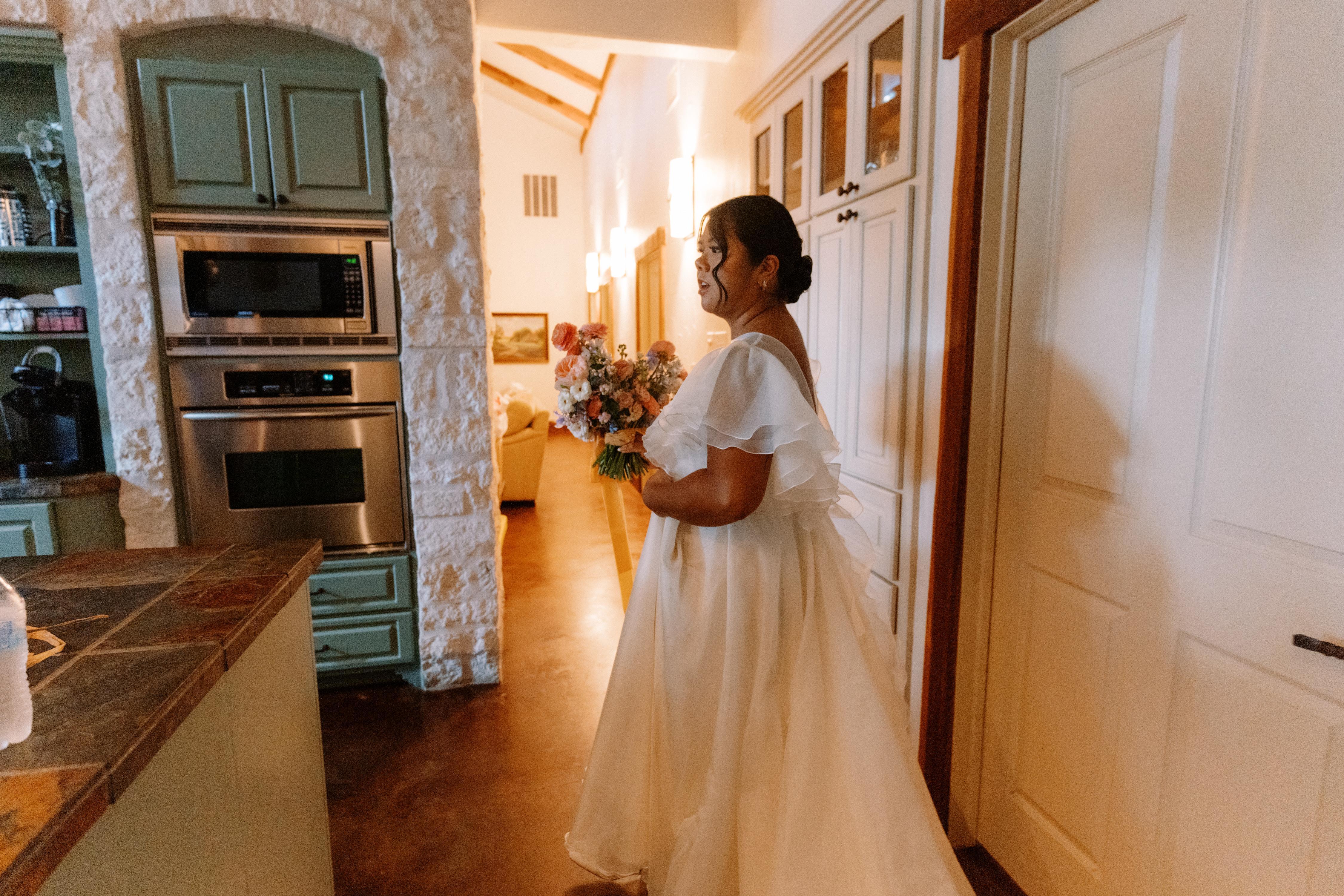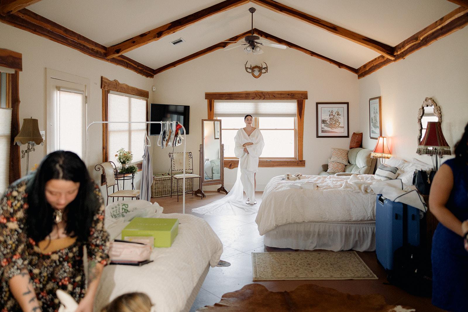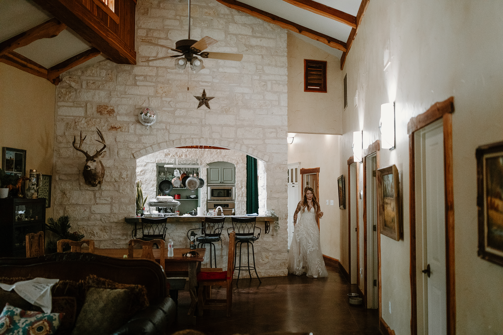 Casadecas is a ranch style home with room to sleep 16 guests. This home has an expansive commercial kitchen, and two large entertainment rooms, providing the perfect gathering space for your friends and family all weekend long. The primary suite in Casadecas is set up to be the perfect bridal suite, with a full length mirror, seating, vanity with makeup mirrors and lighting, and instagram-worthy wall art and decorations.