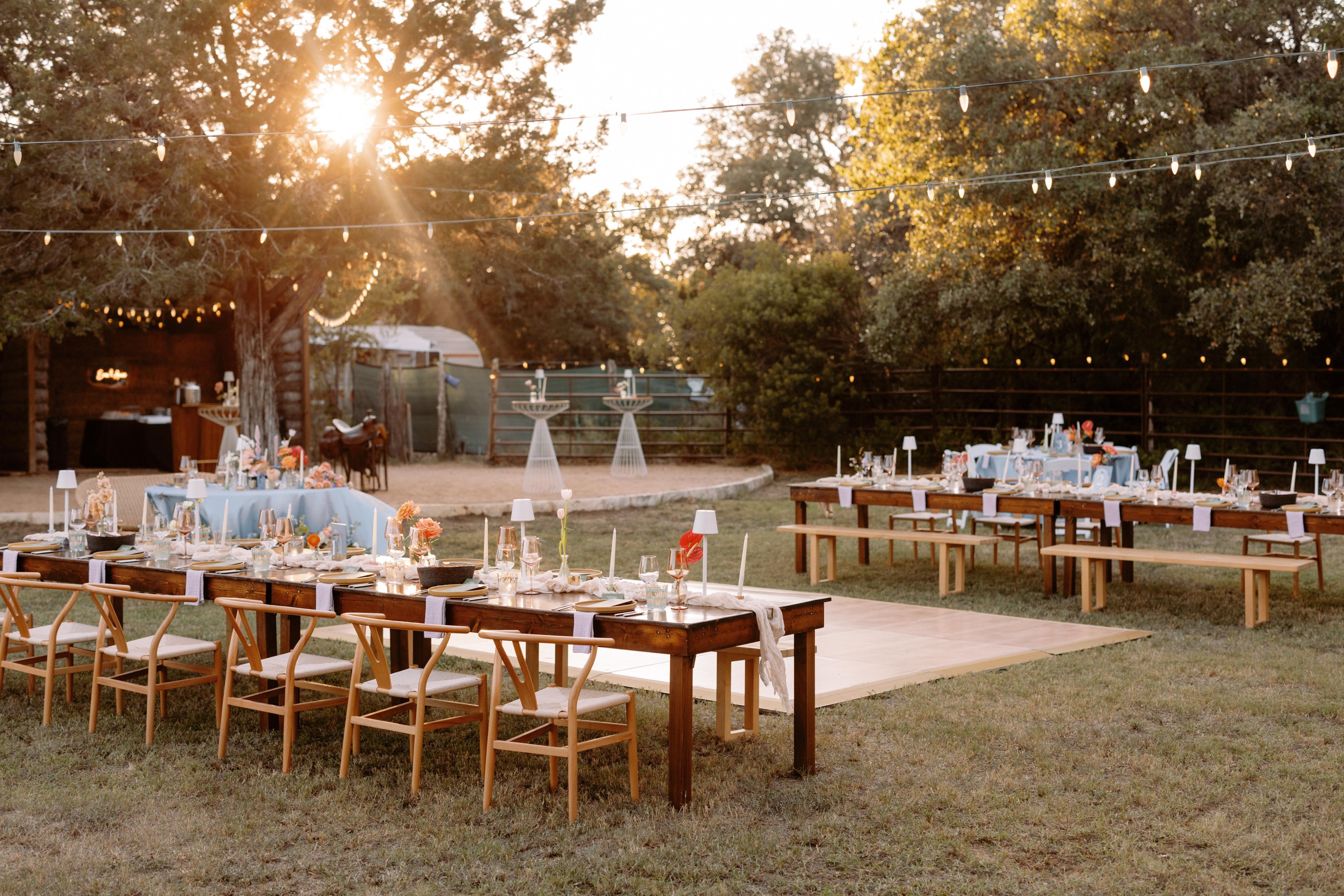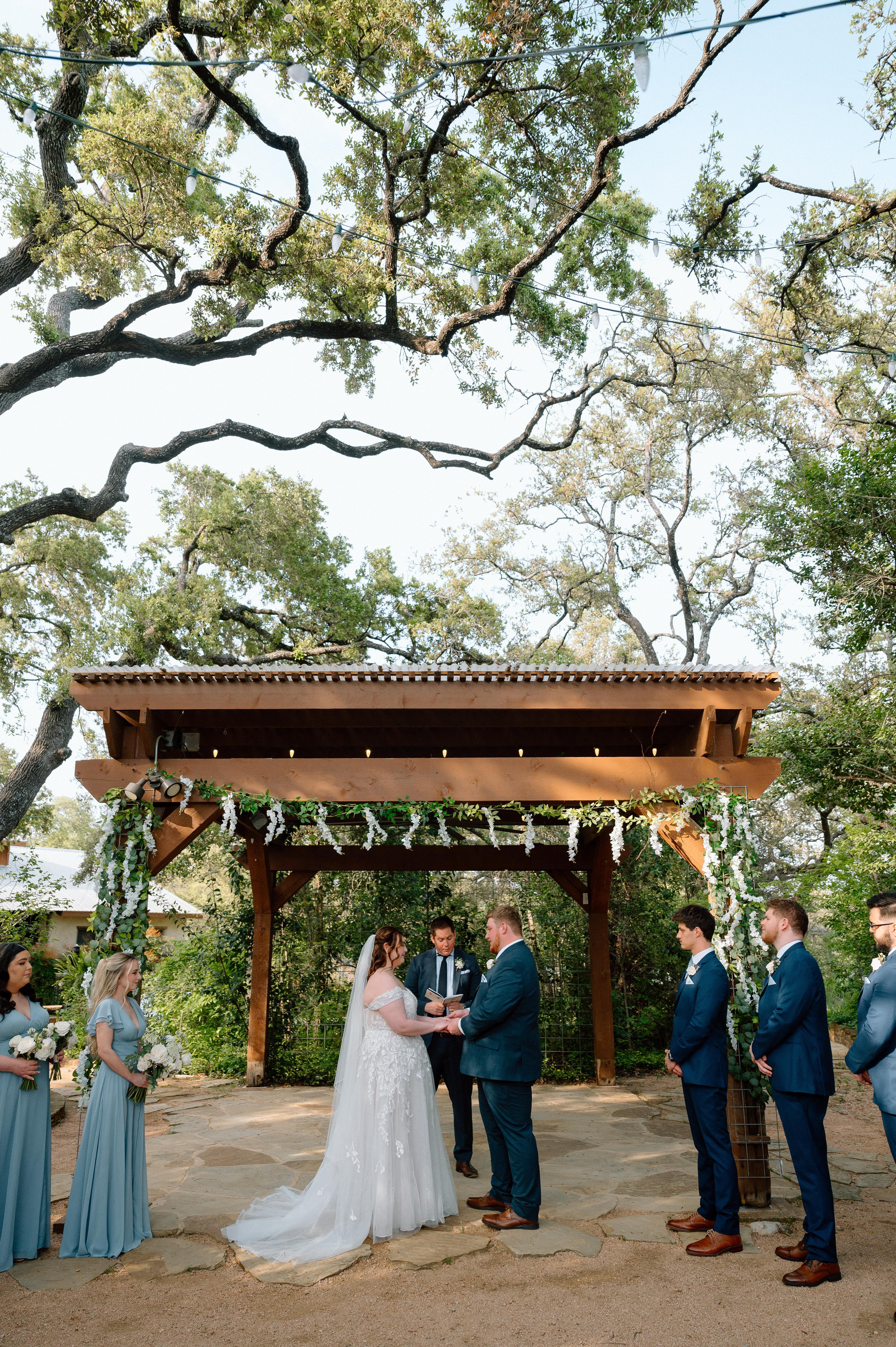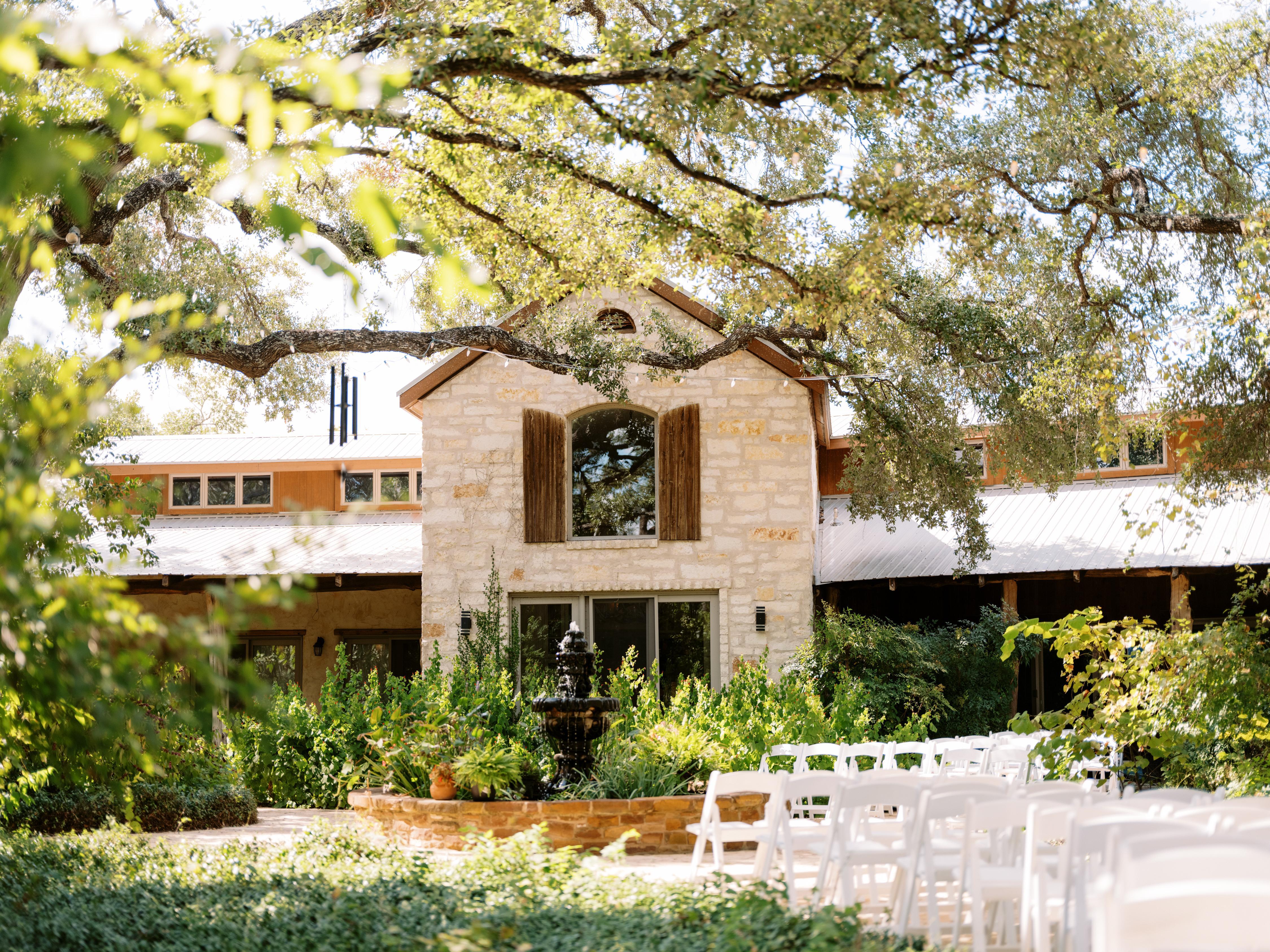 A charming meadow, covered barn, and rustic saloon for the perfect rustic Hill Country setting.