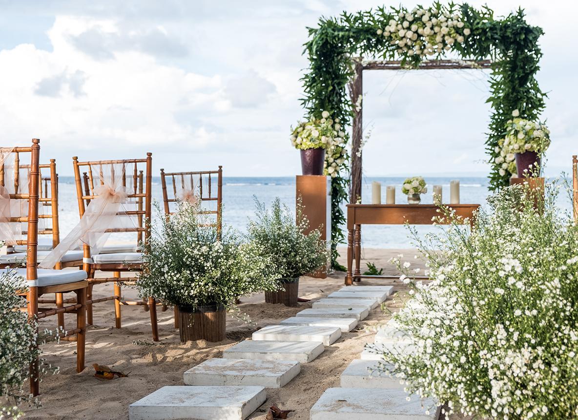 Standing face-to-face with the sea, while still nestled in the lush greenery of our secluded island resort illuminated with Edison-style vintage string lighting creates an enchanting ambiance to say "I do."