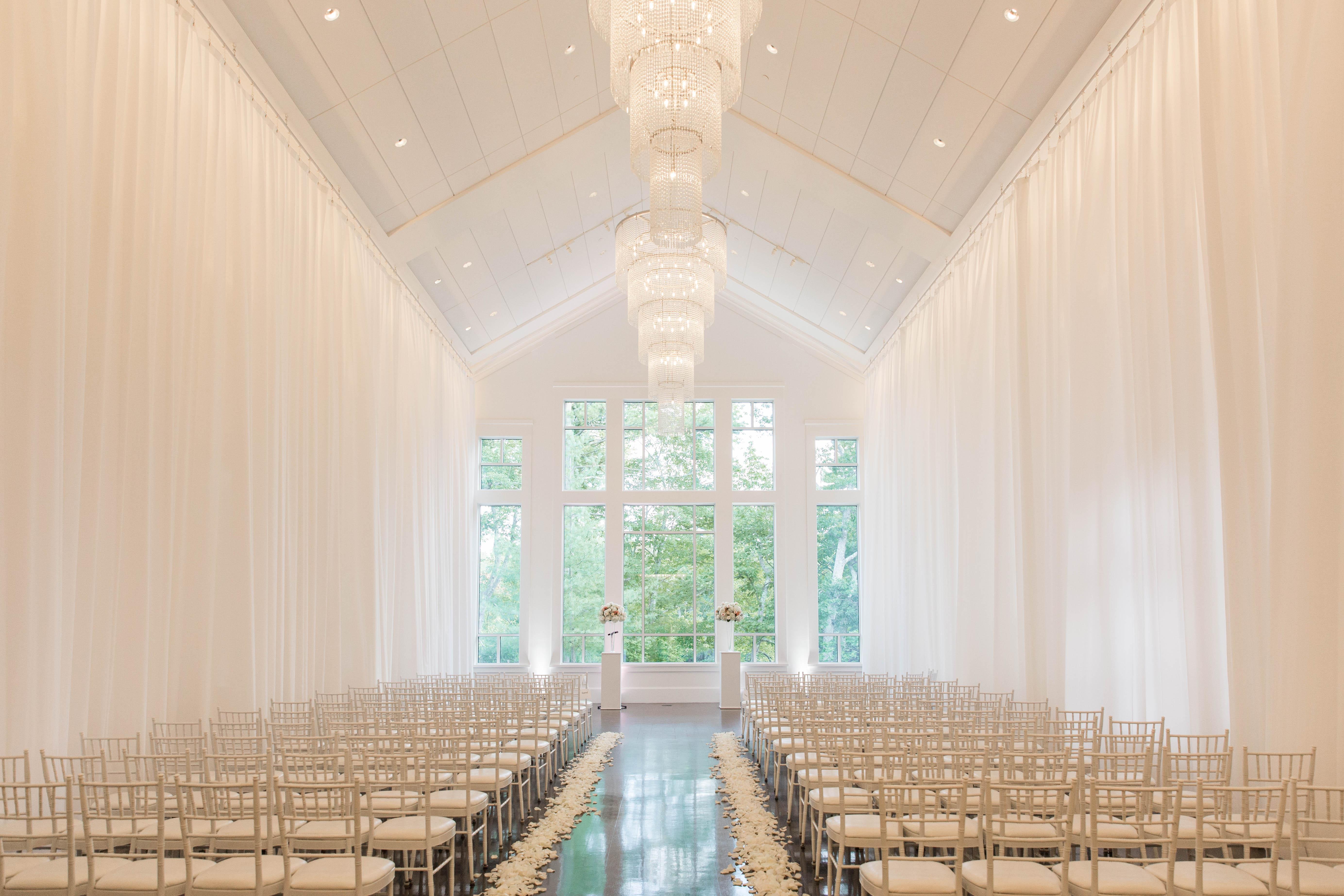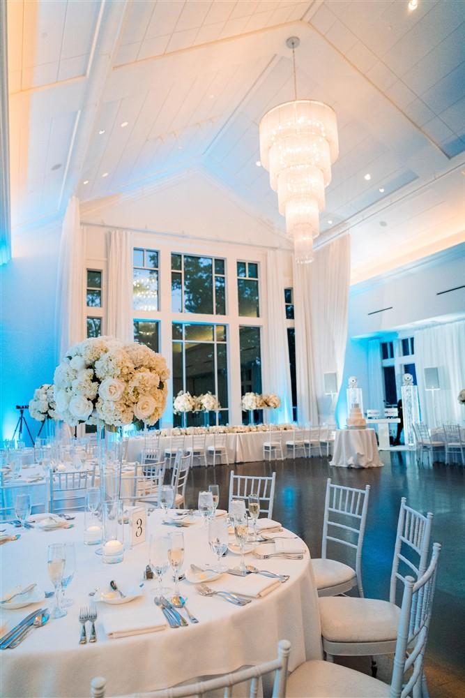 With sweeping 32-foot cathedral ceilings, stunning floor-to-ceiling windows, twinkling chandeliers, and hardwood floors throughout. This ballroom is accompanied by a separate cocktail lounge area, access to a private deck, and a courtyard that overlooks the neighboring lake. The all-white wedding suite and powder room accompany our grand ballroom.