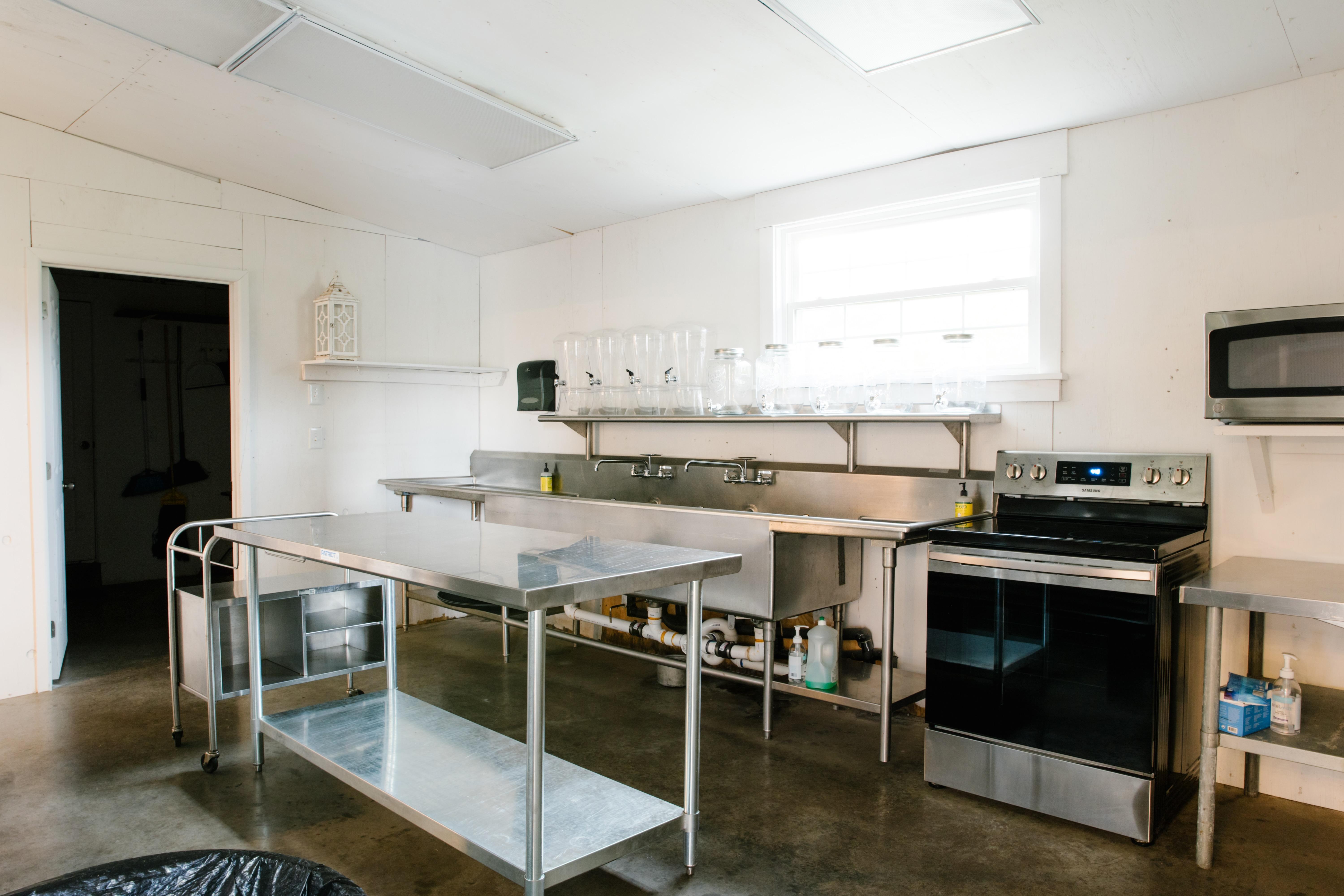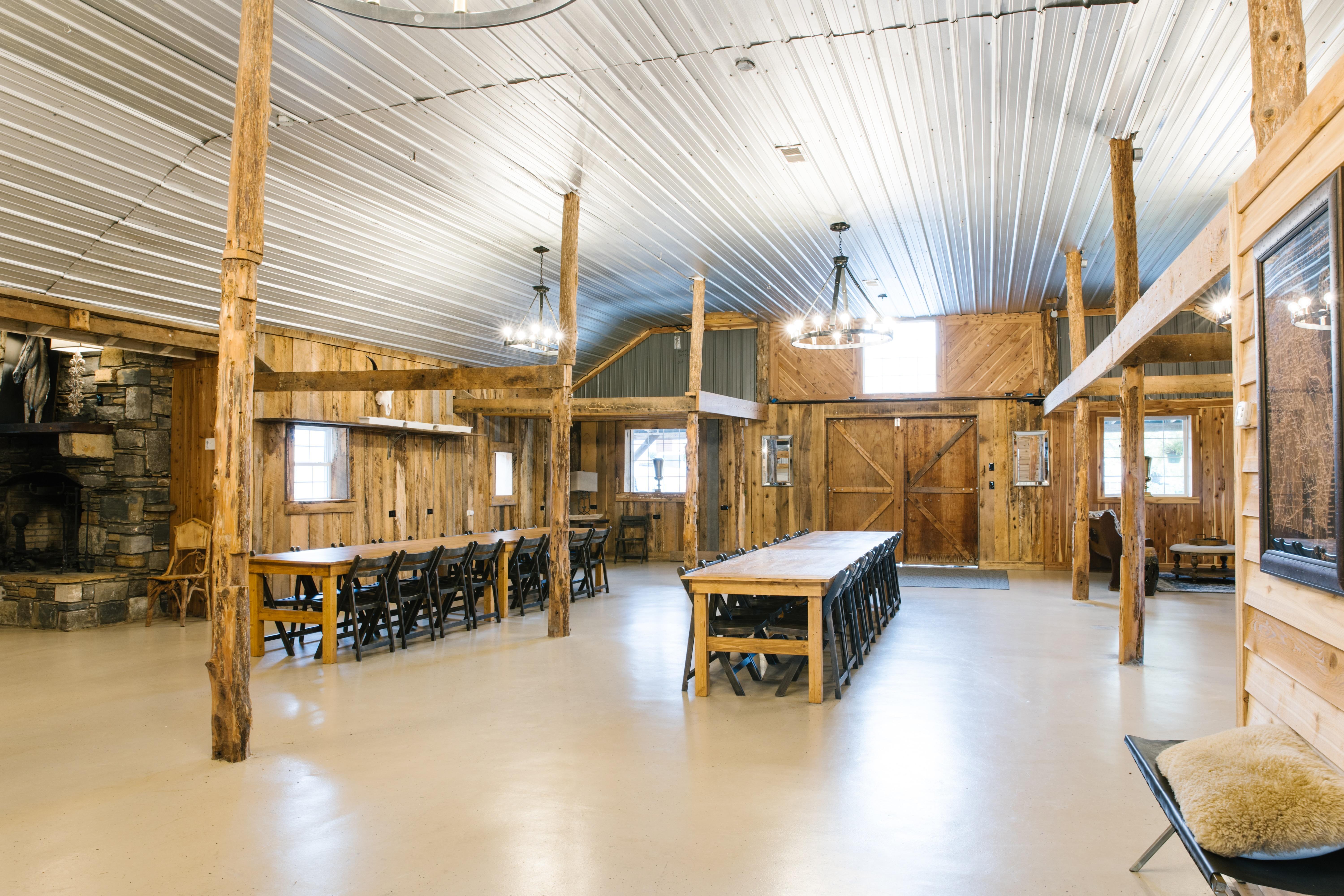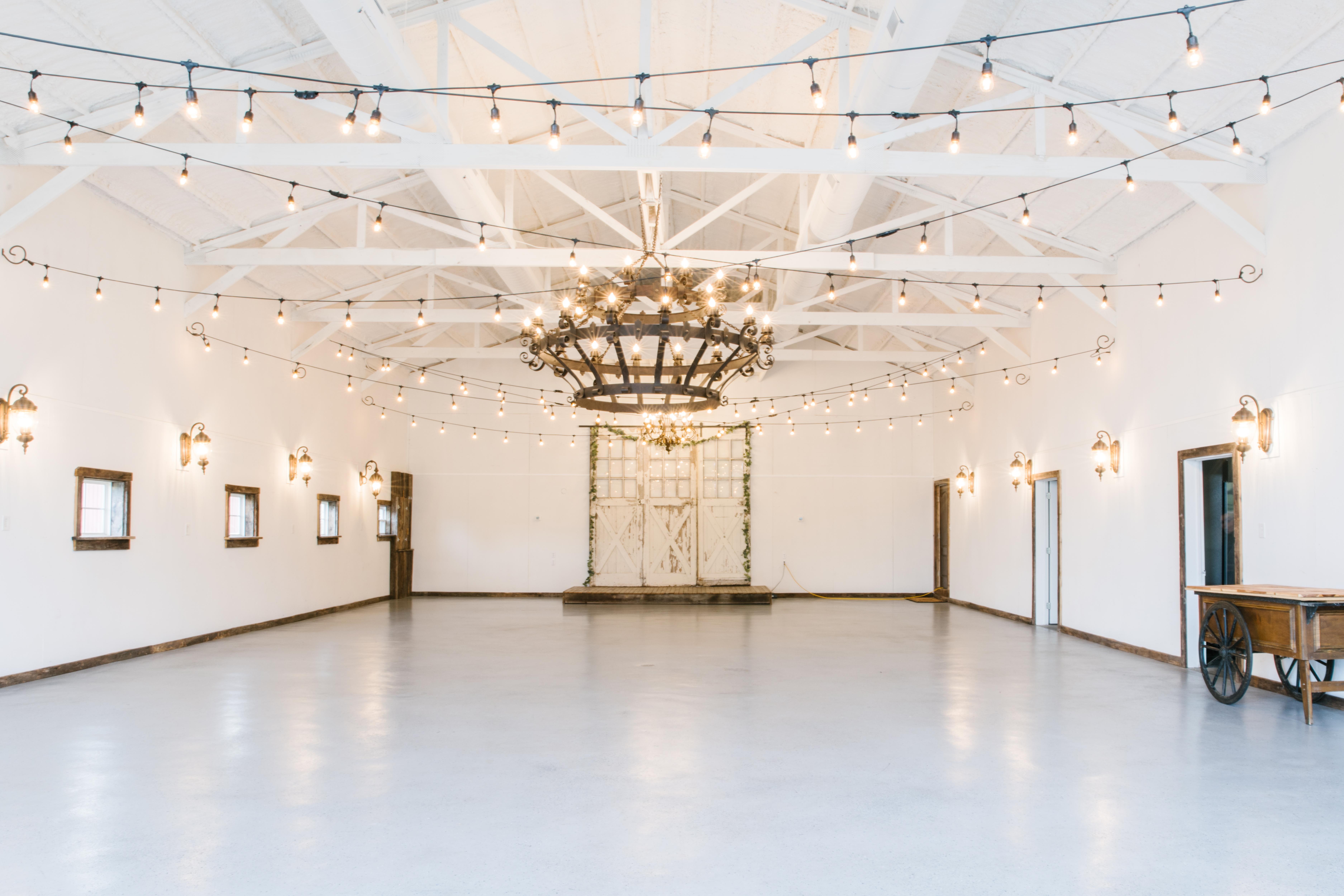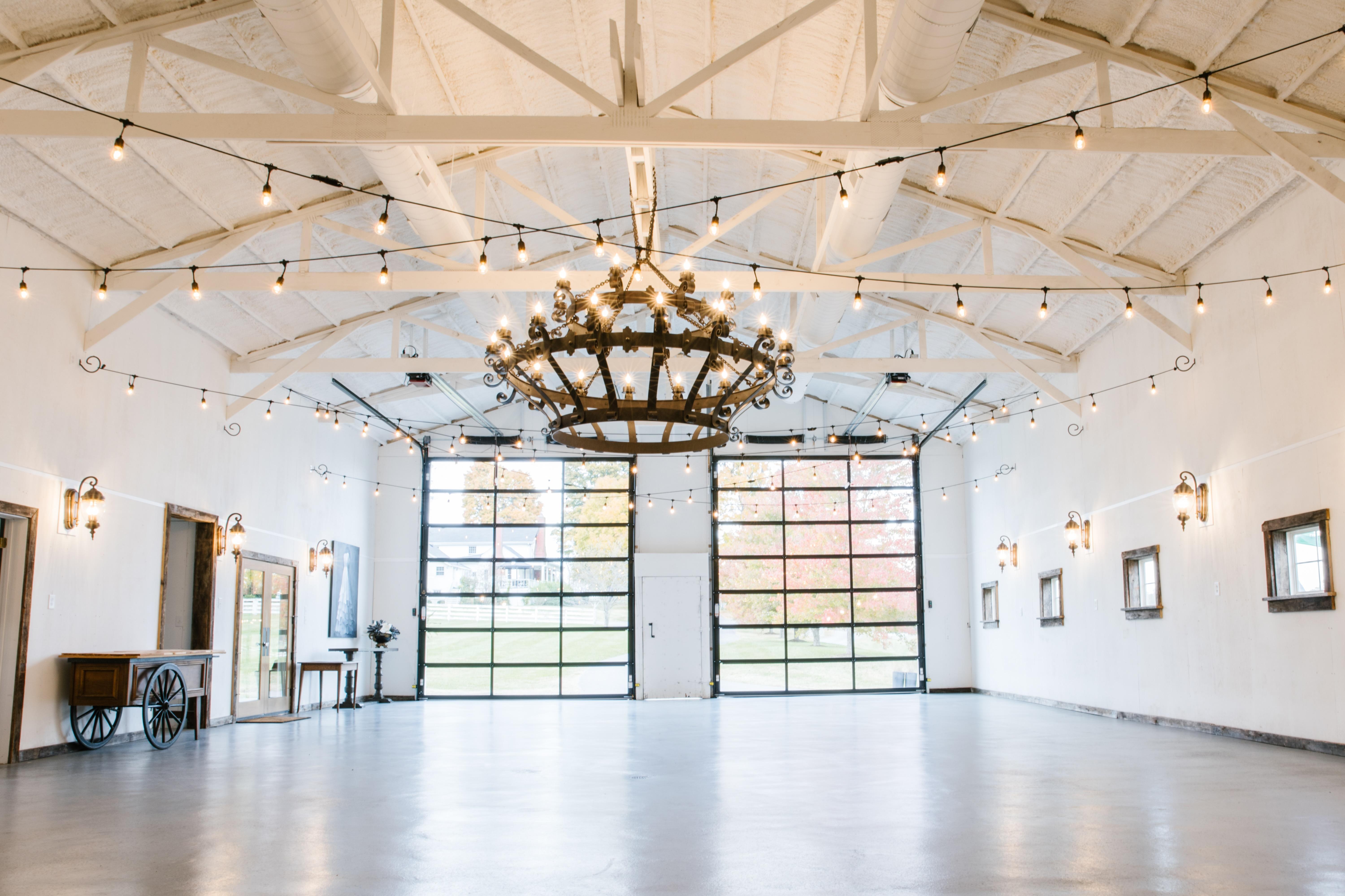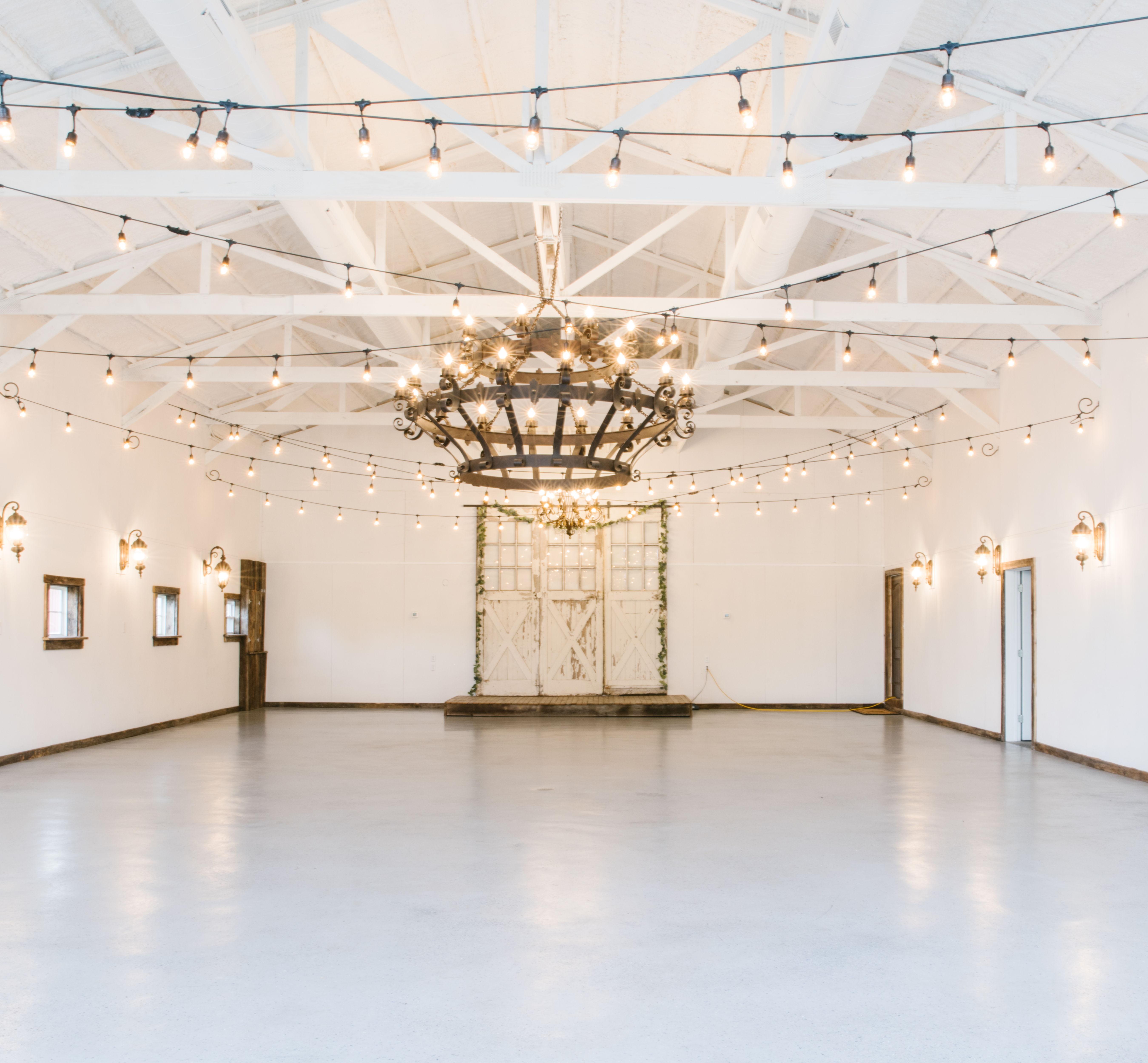 - Patio for bar/welcome table - Double glass garage doors - Dimmable chandelier - String lighting - Catering prep-kitchen - Two restrooms