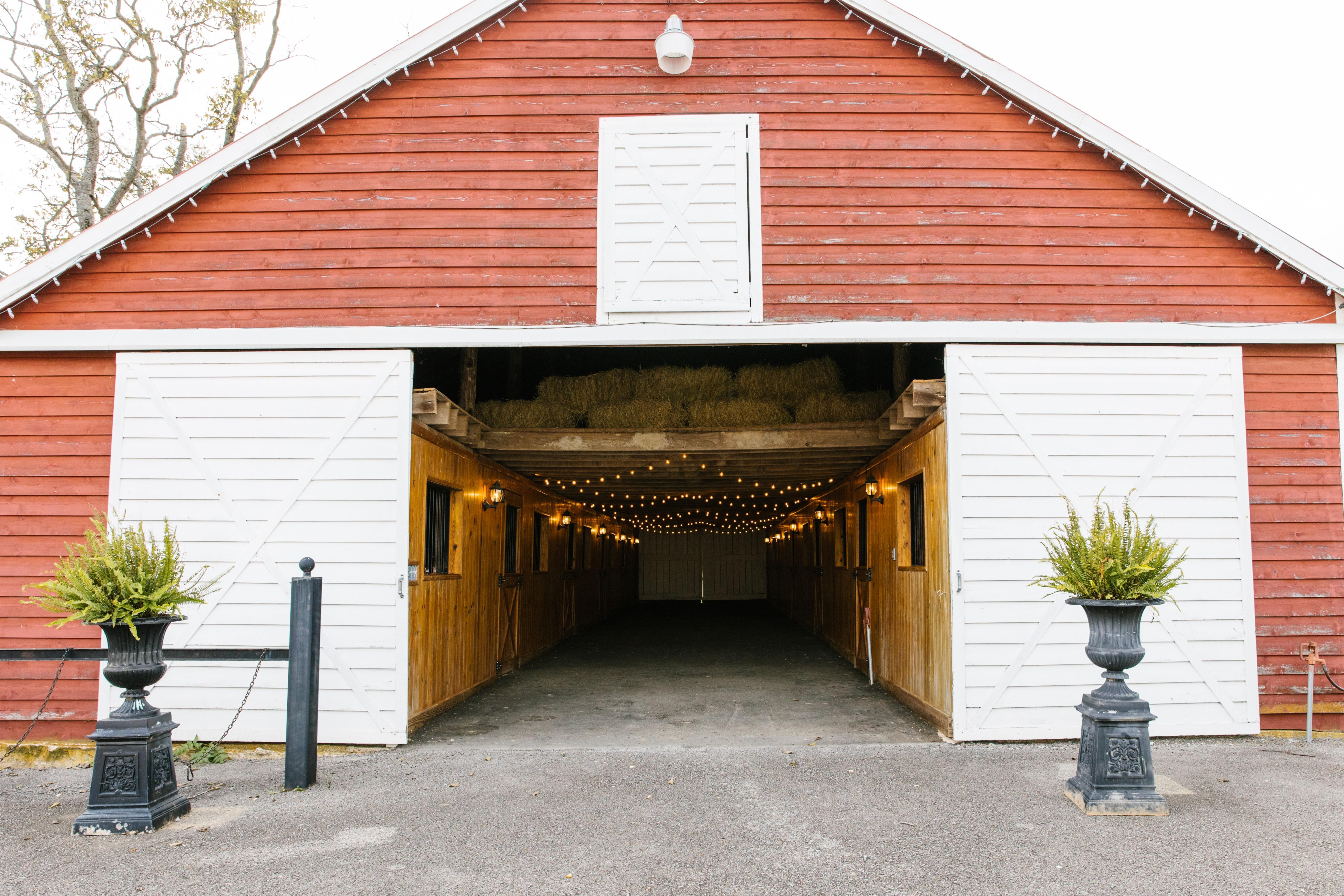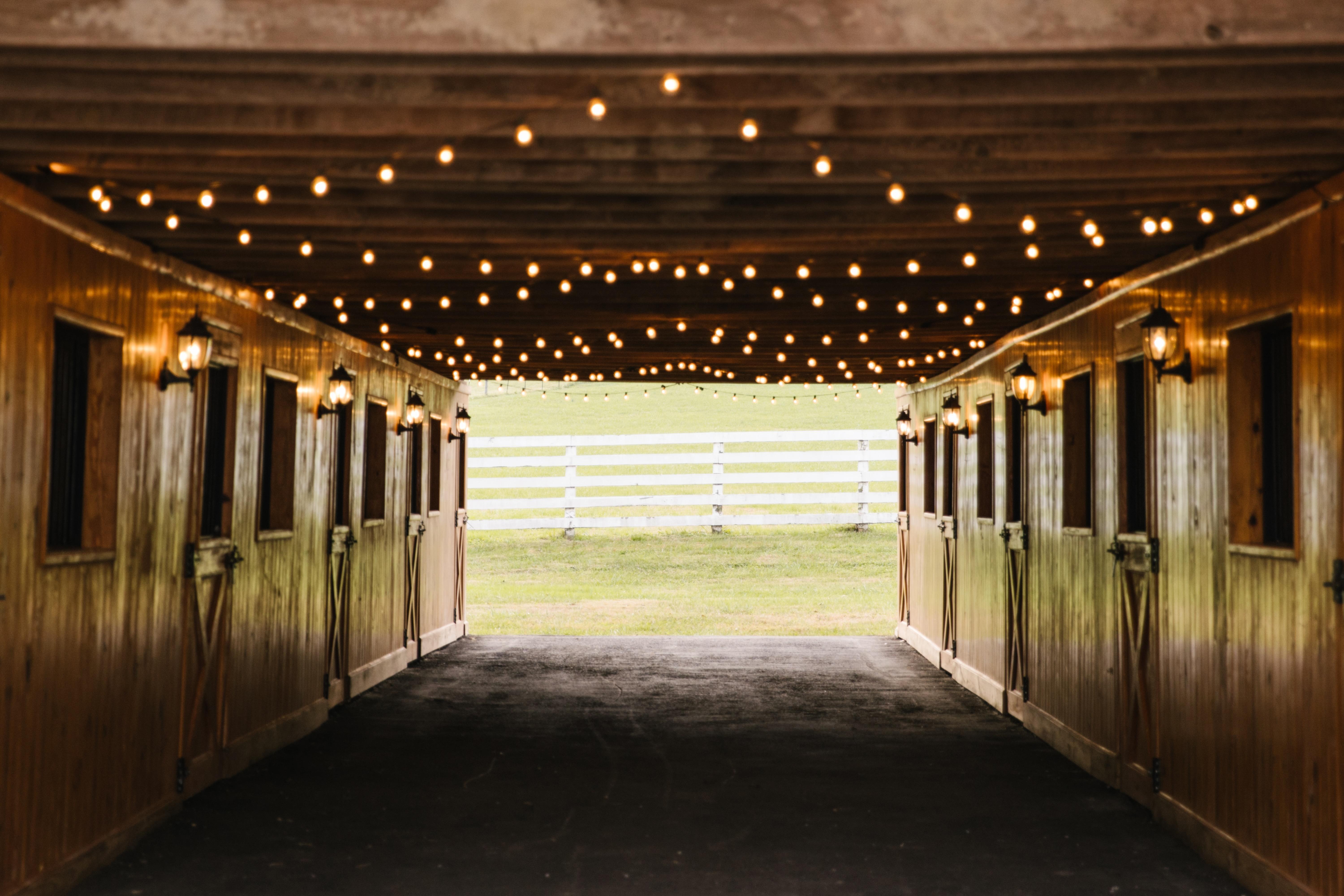 Give your guests a break in between your ceremony and reception and send them over to the stables! Located conveniently next to the ceremony AND reception hall, the stables in the perfect option for cocktail hour. It is lit with string lights throughout and has open stable doors on both ends to give guests access to two different views of the farm, while they sip a few drinks before dinner.