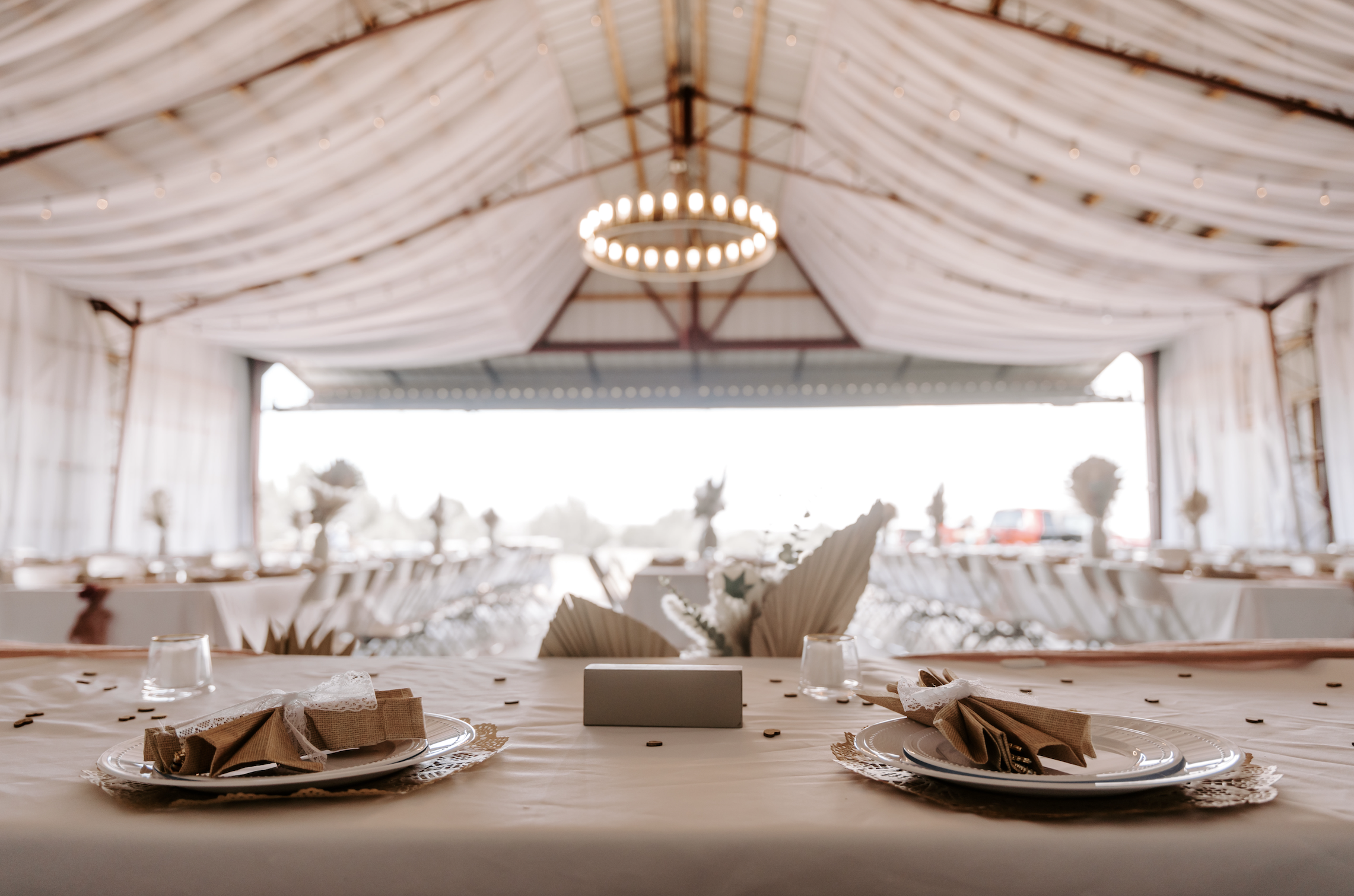 Outdoor ceremony with indoor backup in hangar | Reception in a unique airplane hangar with a barn-like feel, decorated with string lights, chiffon falling from the ceiling, and a grand chandelier | Includes a 2-night stay at our two-story, 3-bedroom Pippin Cabin with breathtaking views (6 overnight guests) | Includes 12 6ft round tables, & 120 chairs | Wooden Ceremony benches | Free Guest parking