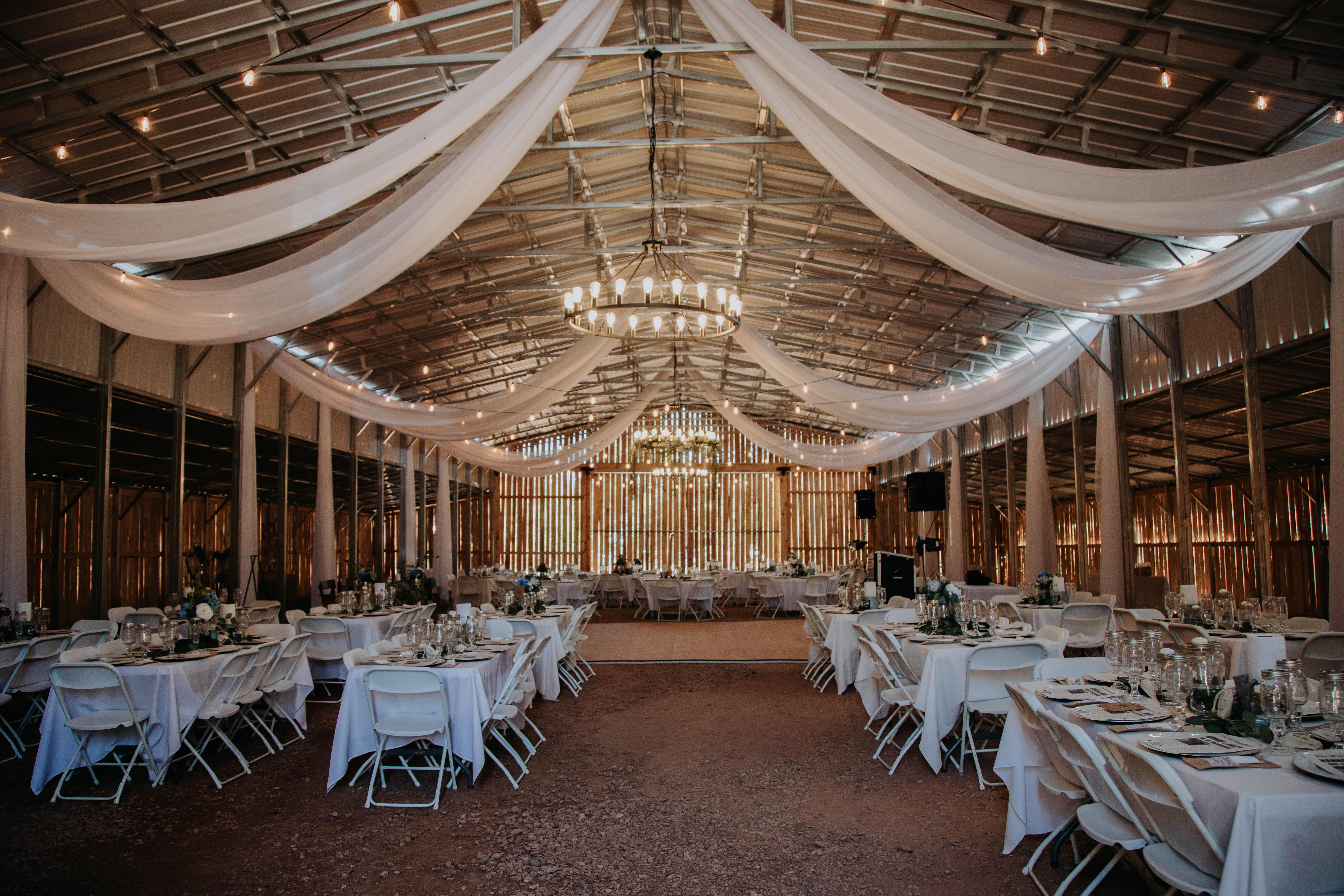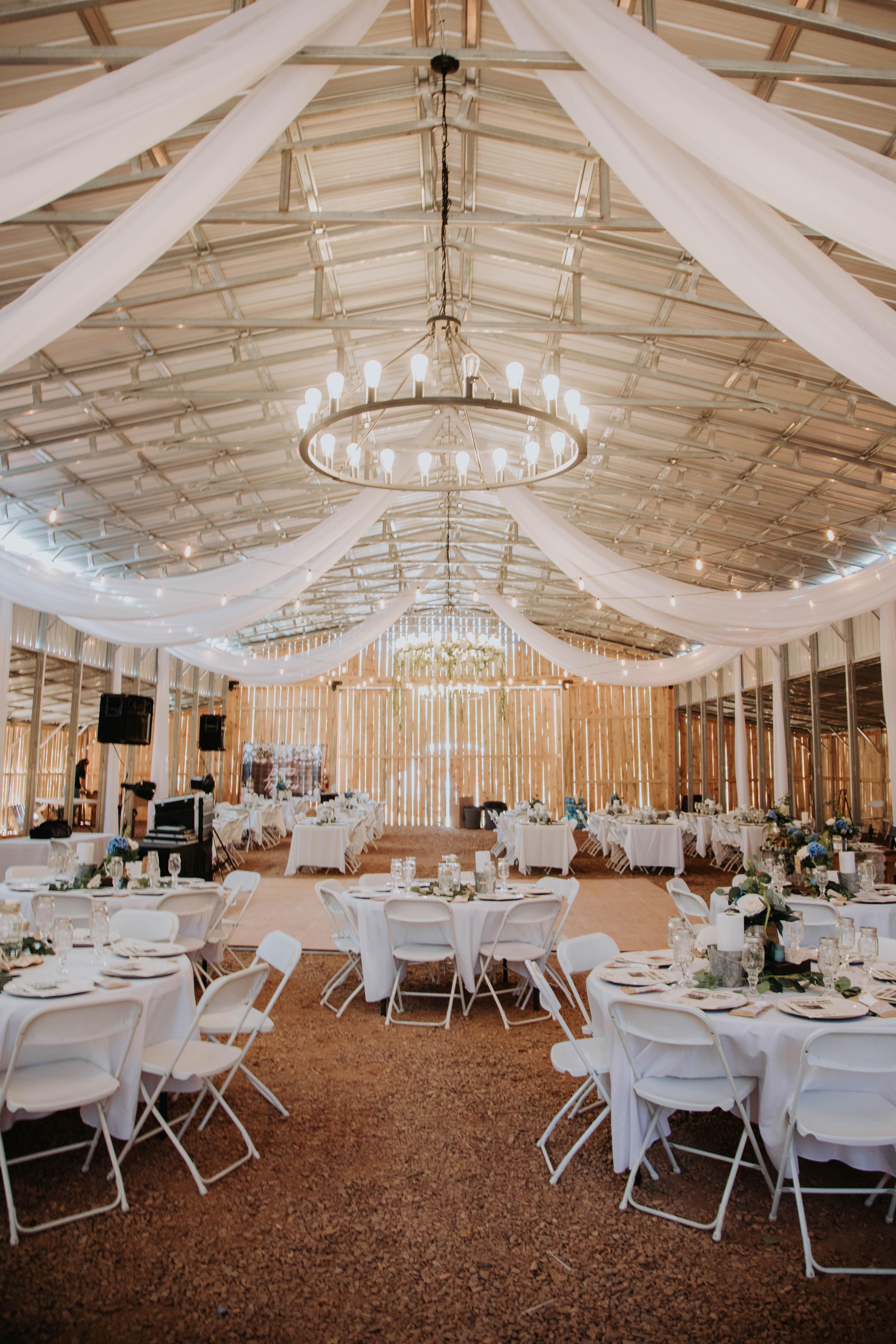 18'x18' Dance Floor | Wedding Barn Reception has a capacity of 300 | 25 rectangle tables (fits 8 each; tables are 6ft) | 200 chairs for Ceremony & 200 chairs for Reception | Exclusive use of Barn from Friday 3PM to Sunday 11AM for setup & take down | Pre-decorated with hanging chiffon and twinkling string lights