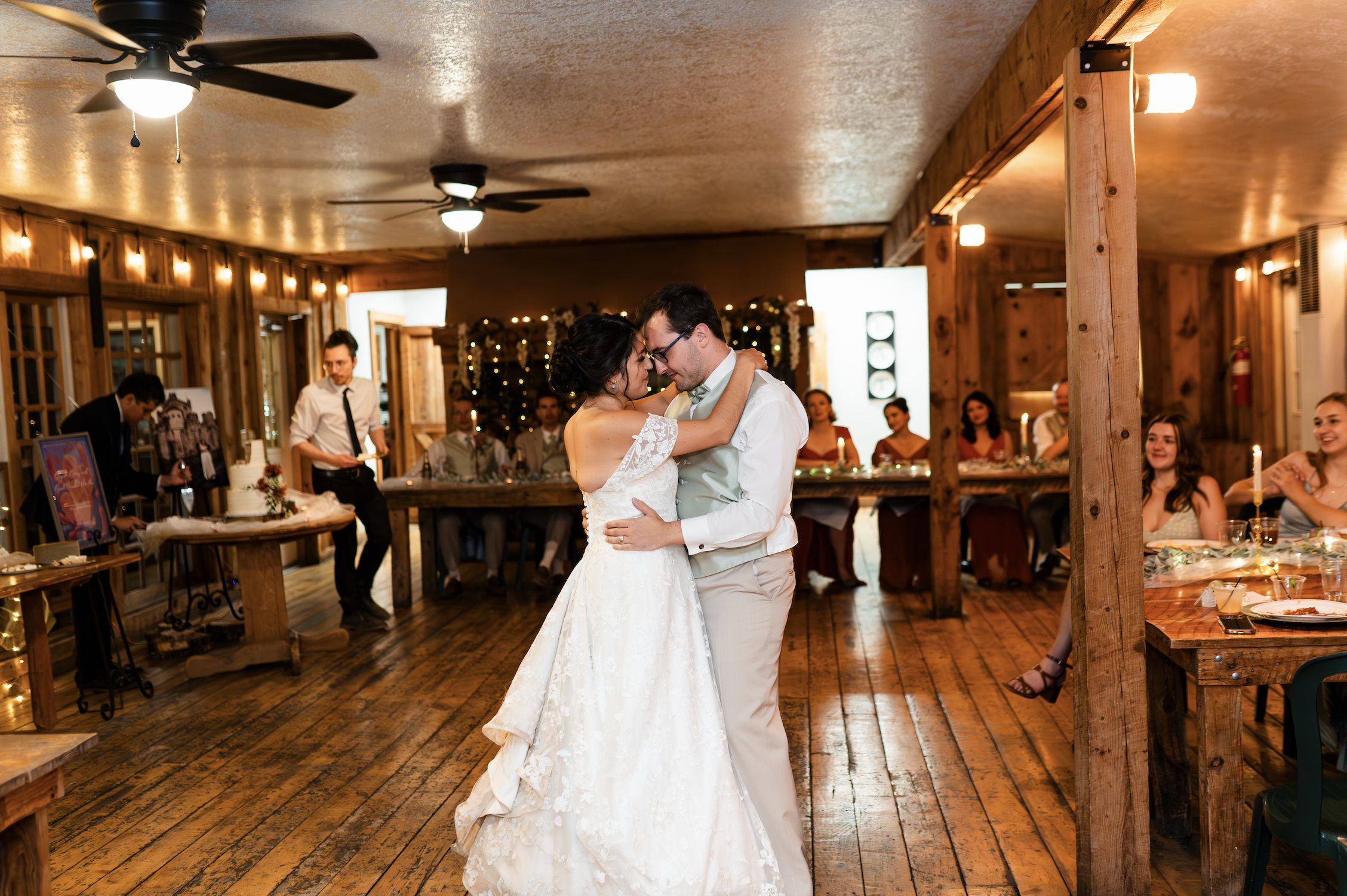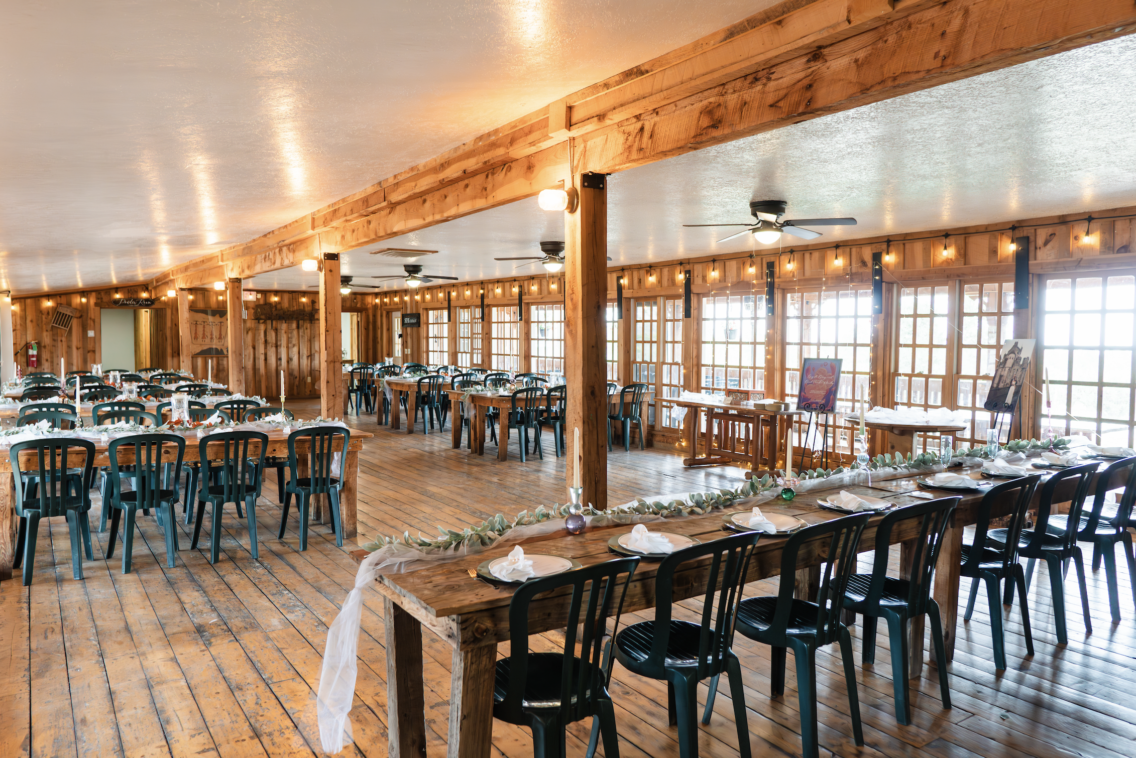 Rustic wood and long, family-style tables set the scene for a fun wedding reception. The dining hall is the ideal place for an intimate wedding ceremony or reception - its charm is easily accented by its large windows and gentle lights.