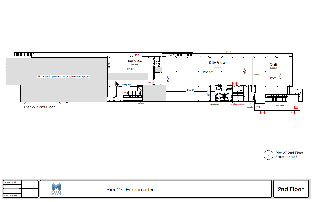 The City View Room (23,000 square feet), situated on the upper level, offers views of the iconic Bay Bridge and floor-to-ceiling windows facing downtown San Francisco. The City View Room can accommodate cocktail reception followed by dinner and dancing. Restrooms are conveniently located in the center of the room, and a balcony offers outdoor access and obstructed views.
