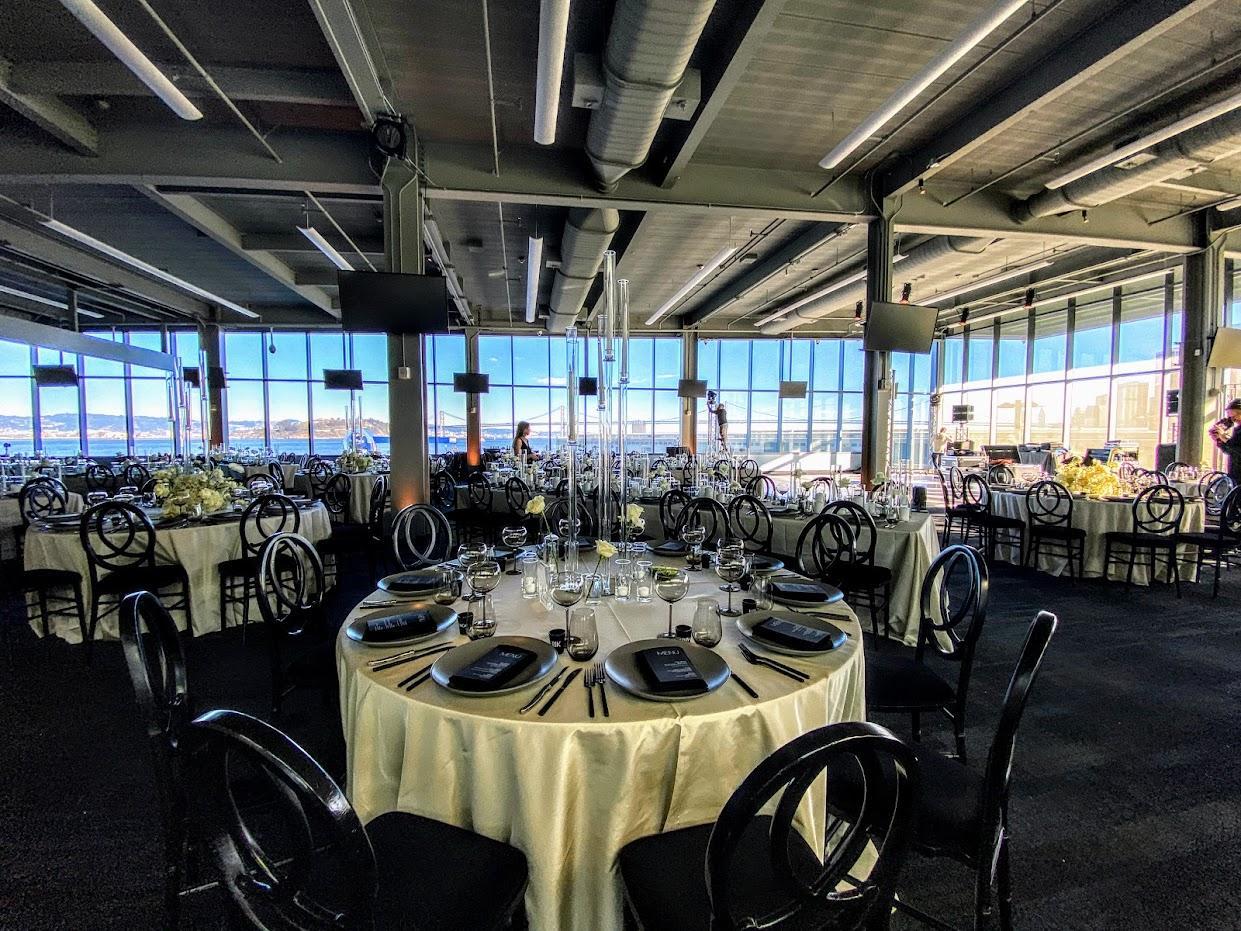 The Embarcadero Room (18,000 square feet), situated on the lower level, is industrial with exposed ceilings and cement flooring. It is lined with roll-up doors that can be opened, allowing direct access to outdoor space along the waterfront for a great indoor/outdoor event. The outdoor space has stunning views of the Bay Bridge and the San Francisco skyline.