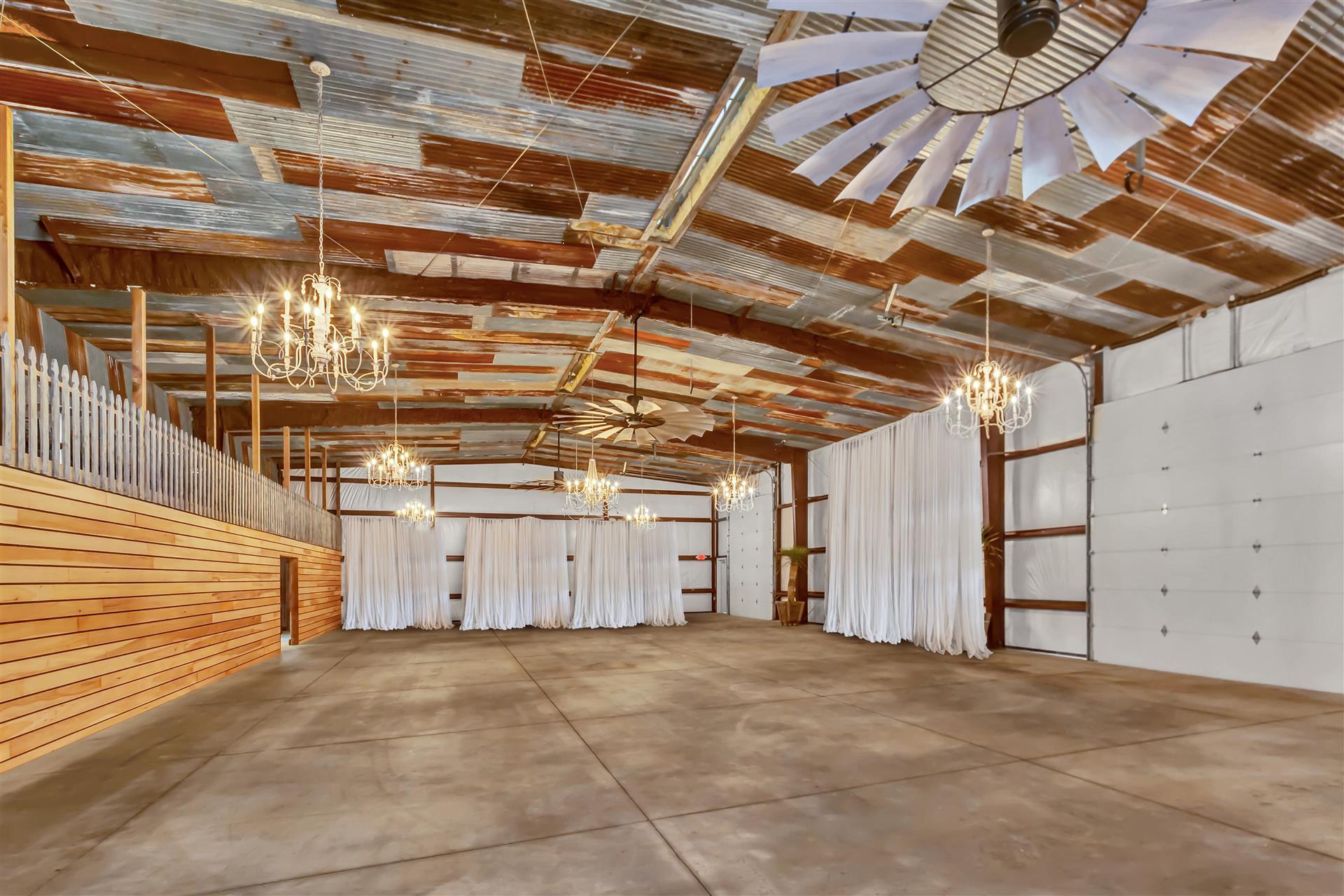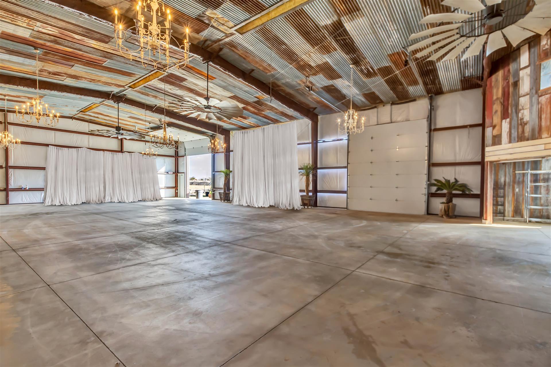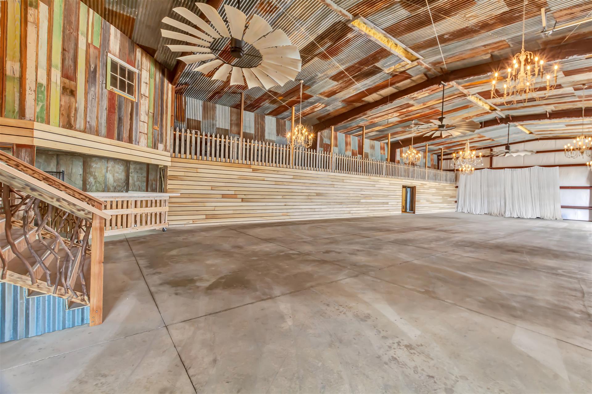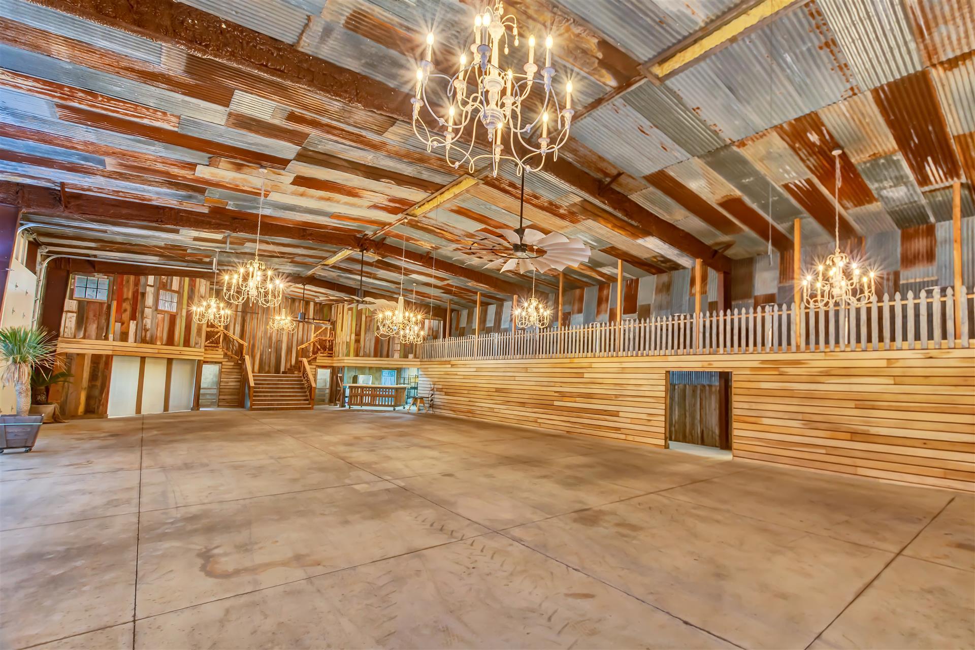 Rustic meets Country Modern in this 5,000 sq. ft. open barn. Decorated with reclaimed materials, this venue will be sure to wow your guest and make your photos pop. The barn features 6 bathrooms (4 half and 2 full), separate bride and groom lounge rooms, seating for up to 200 guests, a warming kitchen, a bar nook with a custom bar top, and a mezzanine that seats an additional 24 guest. New HVAC units and three 8-foot windmill ceiling fans keep the barn comfortable for your guests. Guests will have the option of sitting at tables below, or the mezzanine above. Have extra people? Open the two bay doors and place tables outside and enjoy a spectacular Texas sunset.