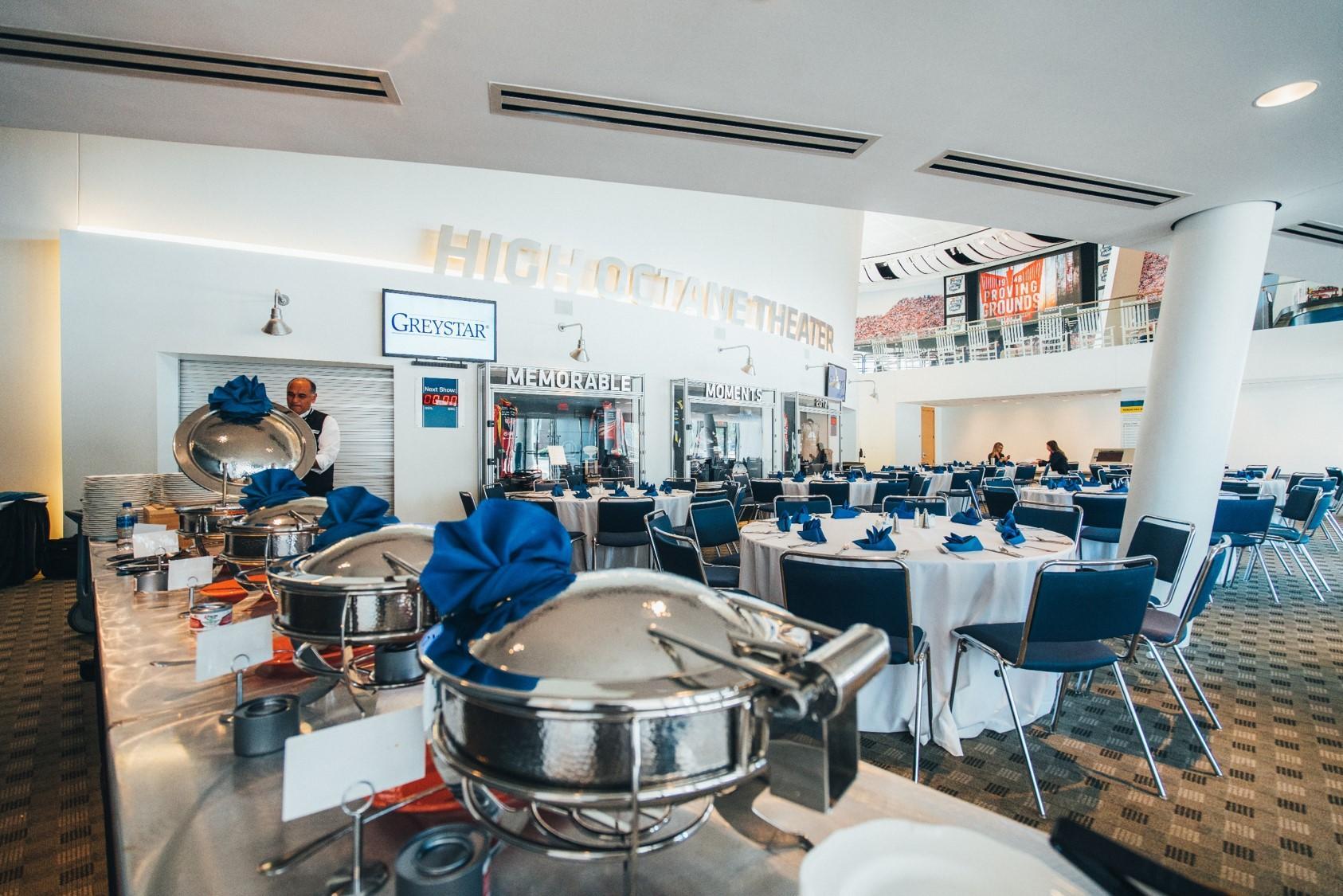 These spaces are an ideal backdrop for your reception! Attendees can explore history while engaging with interactive content such as our Racing Simulators and Pit Crew Challenge Experience. To embrace the reception style event, we set the space with high top tables and there is also some soft seating within the space. It is such a unique space and everybody always enjoys it because it is so different and exciting. Your guests can truly eat, drink, play and repeat – all at their own pace!