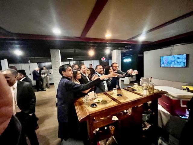 This space entails a chic, relaxed atmosphere complete with a vintage full bar area, white lounge furniture, chrome highboys and subdued lighting.