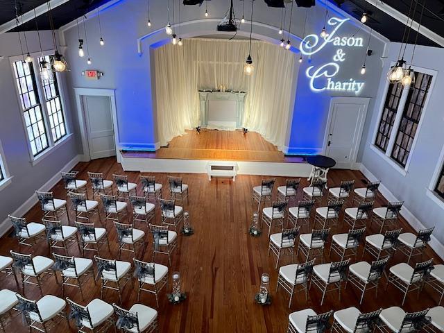 The Main Ballroom features a stage with full AV options, loft area, and a bar area. Original hardwood floors and stained glass windows being an unexpected ambiance.