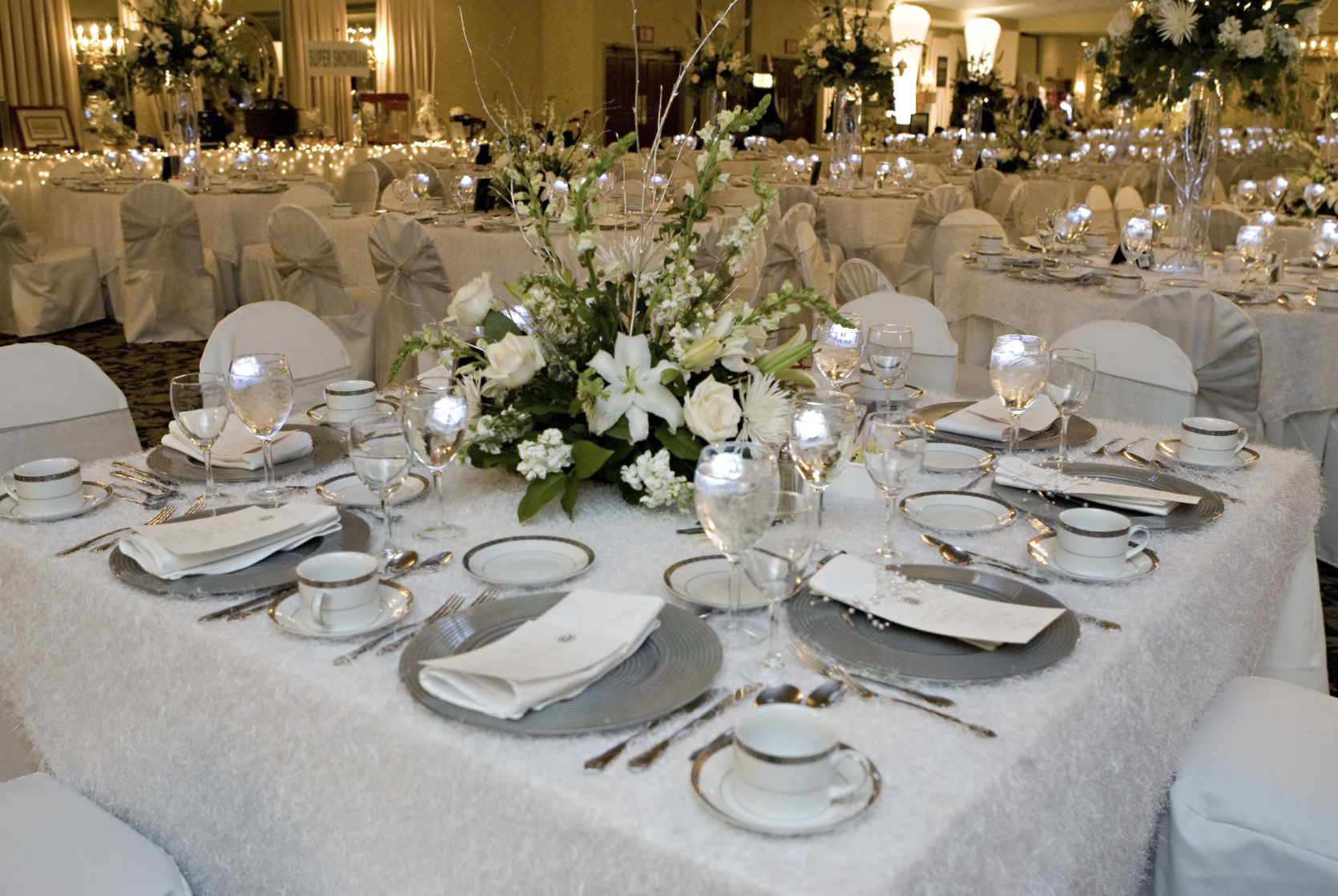 Up Lighting in the colors of your wedding and dimmer controlled chandeliers, Fabric draped ceiling with lighting in your wedding colors. Beautiful wood bars and dance floors included. Our One-of-a-kind Crystal candle centerpieces included Skilled reception consultants to help you through all details of planning Custom colors available for all events Custom menus available for all cultures and ethnicities Full china, silverware, linens and glassware