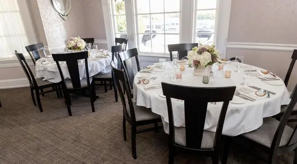 White table linens, white napkins, and the Inn's existing dining room furniture.