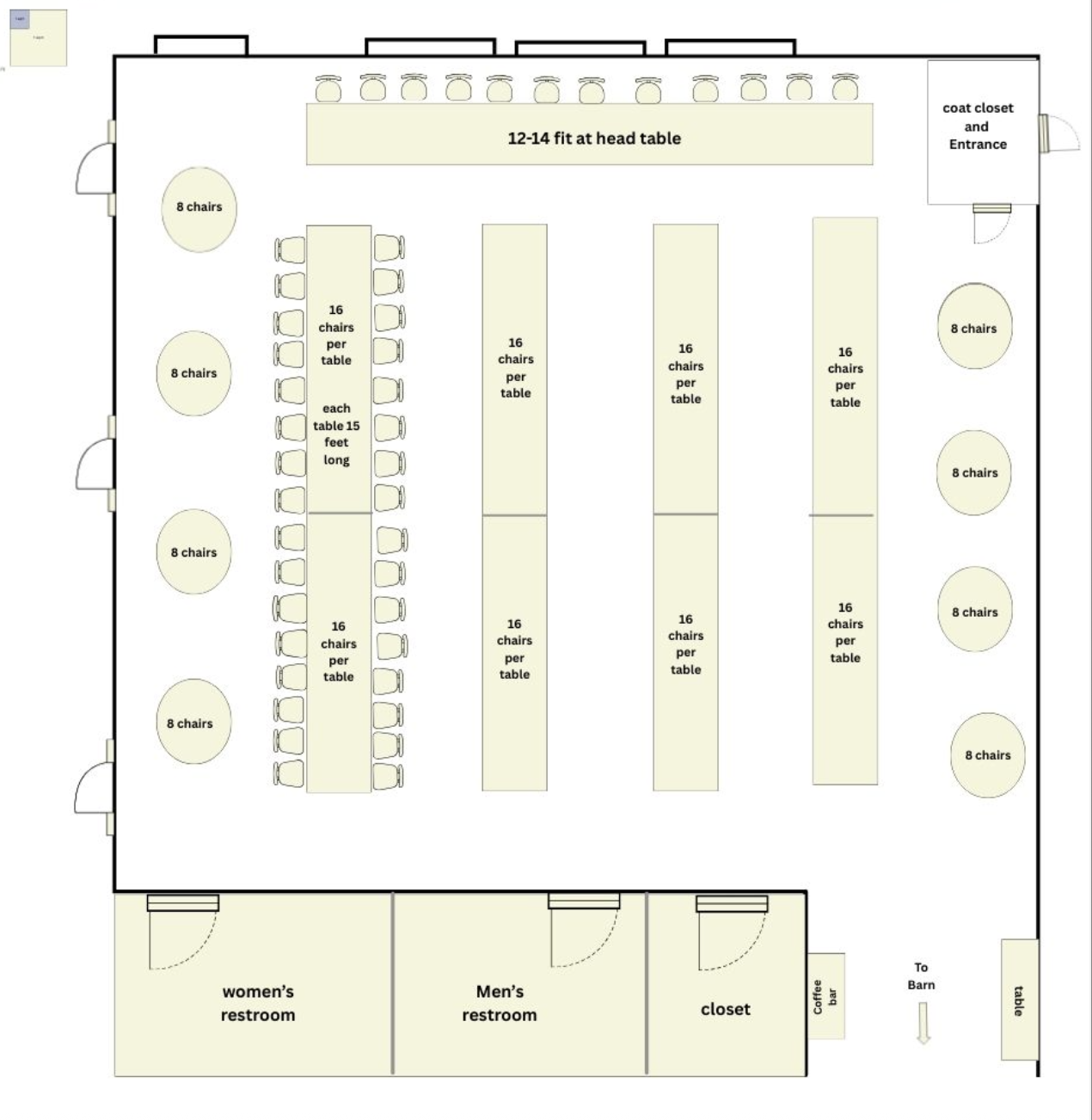 -dimmable crystal chandliers -tv for slideshows -sound system and microphone -handicap accessible bathrooms -heat and air conditioning -coat closet -coffee bar -built in display cabinet -wooden and round tables, new cross back chairs and white linens and table runners -photo wall